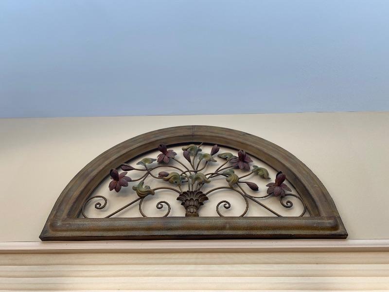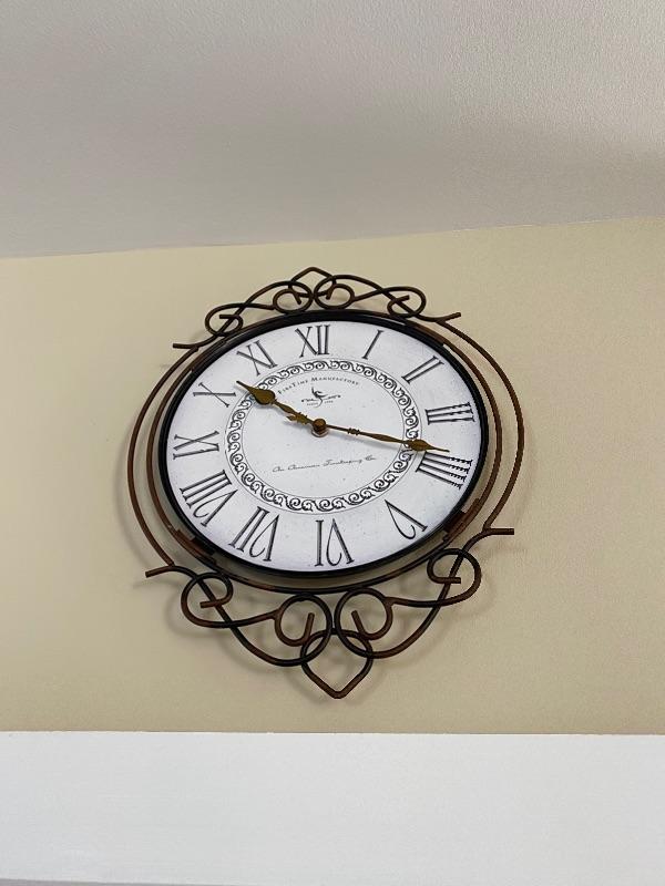 Metal scroll wall decor measuring 35” x 20.5” tall with metal battery operated clock