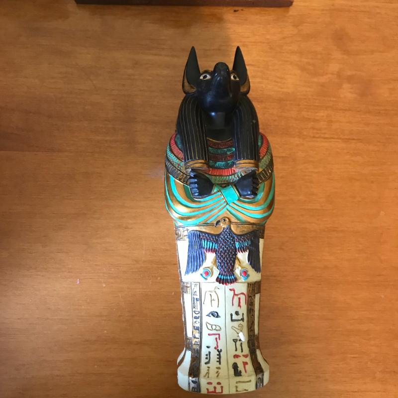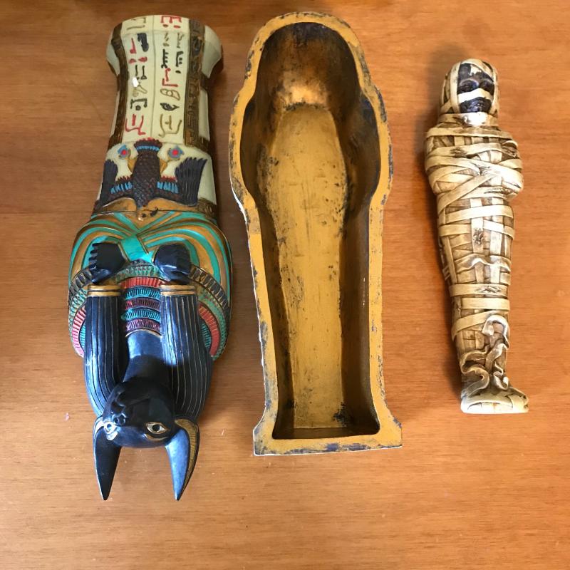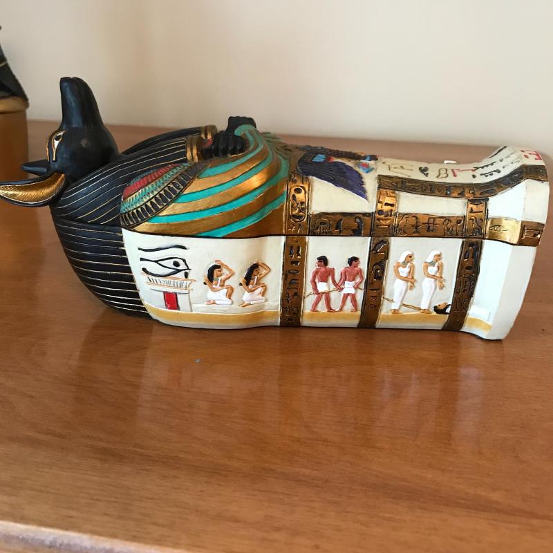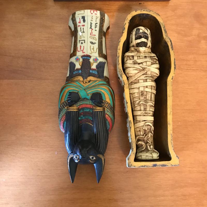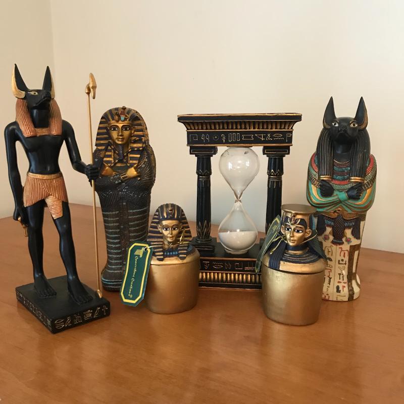 Impressive lot with mummified figurines, a small hourglass, Anubis figurine and pharaoh boxes. Tallest Anubis statue stands 8.75” tall. Local pick up only.