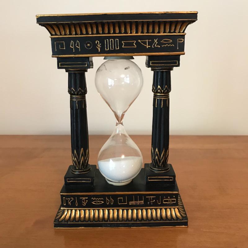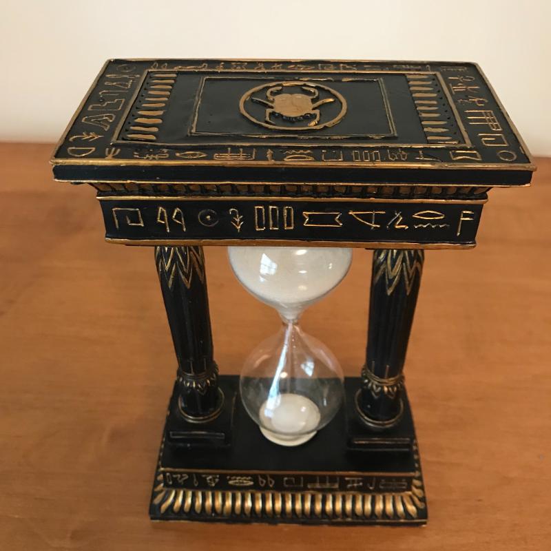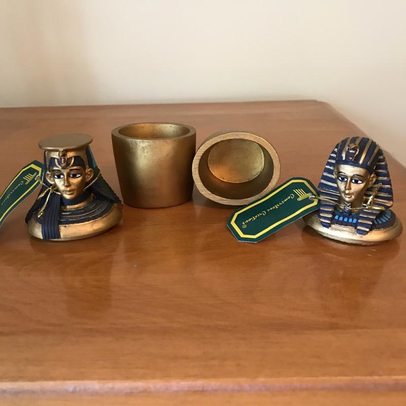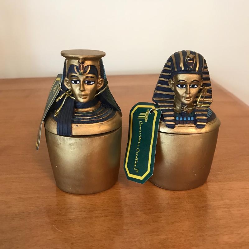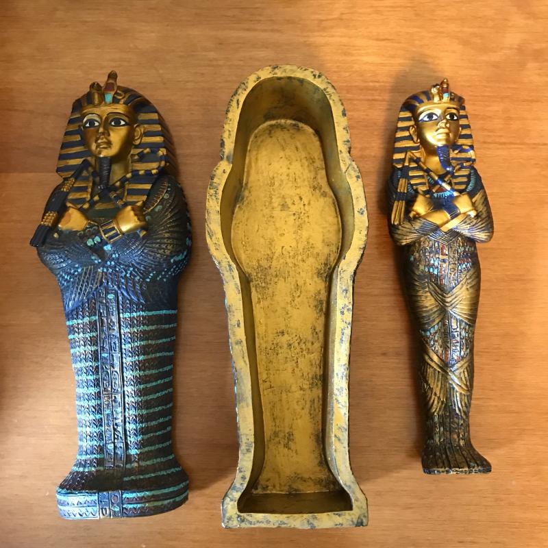 Impressive lot with mummified figurines, a small hourglass, Anubis figurine and pharaoh boxes. Tallest Anubis statue stands 8.75” tall. Local pick up only.