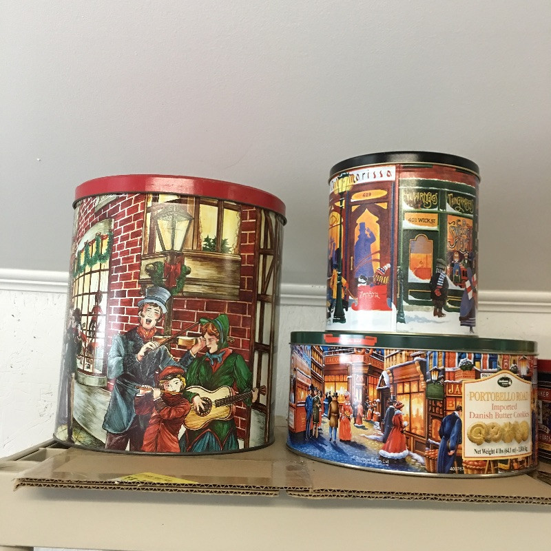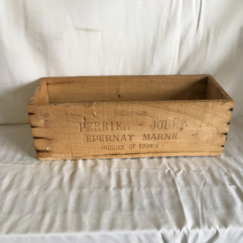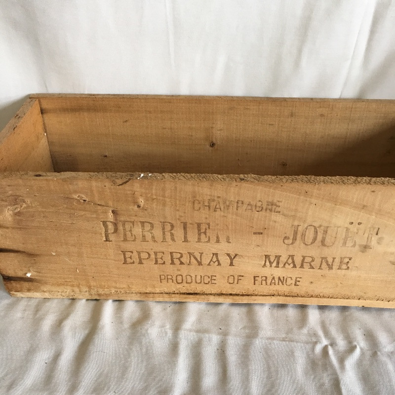 Perrier Jouët champagne crate and array of decorative tins. Crate measures 8” x 21.25” x 7.25”.