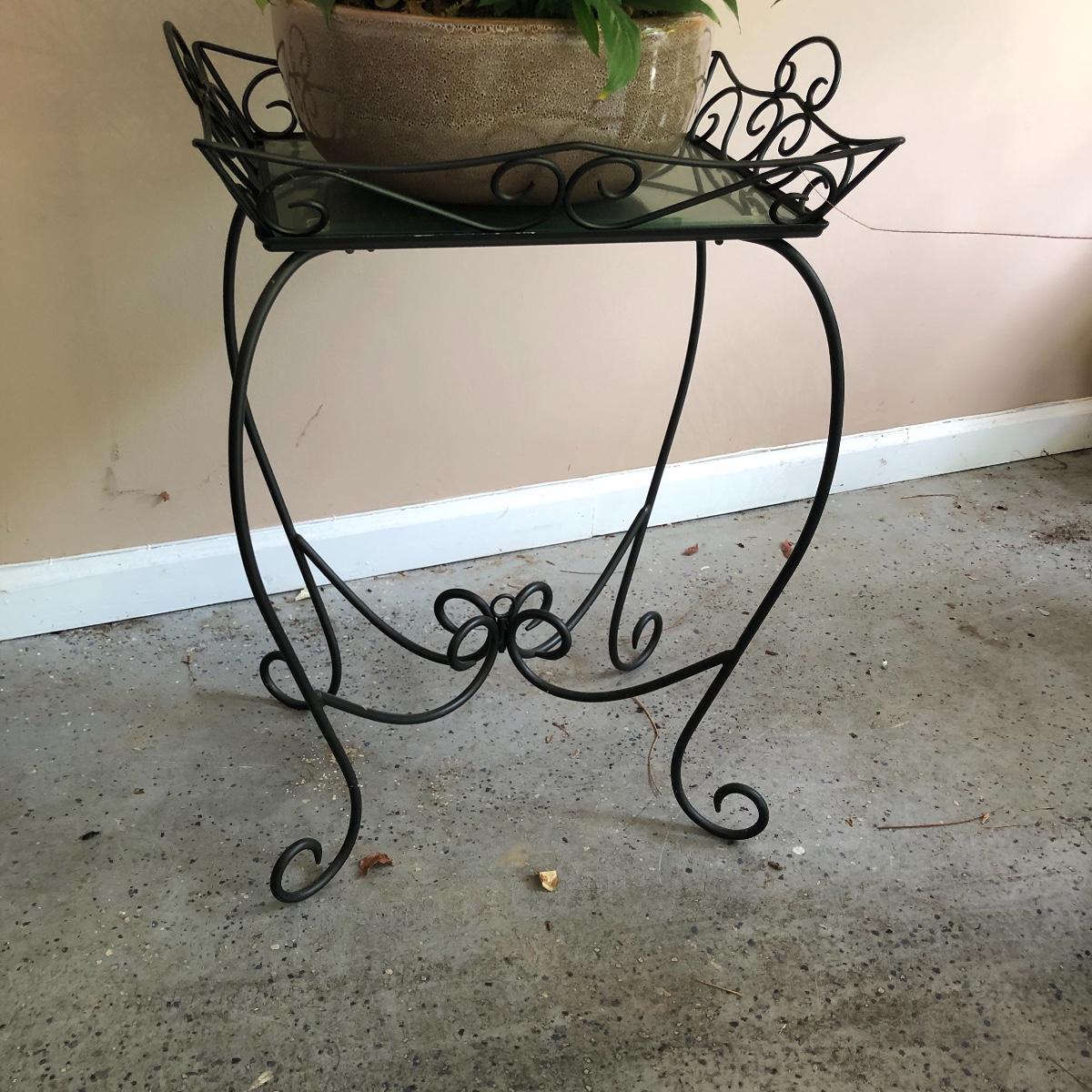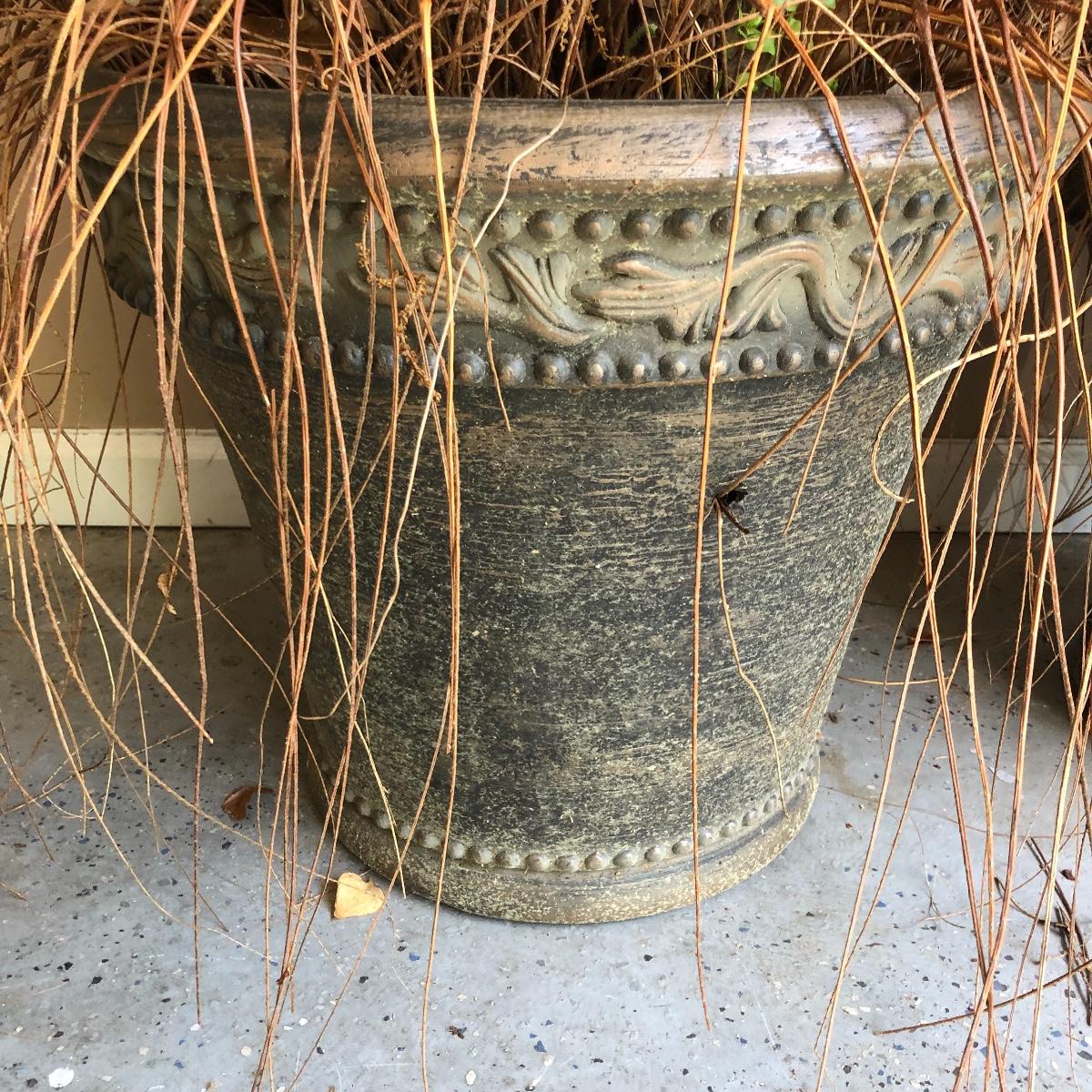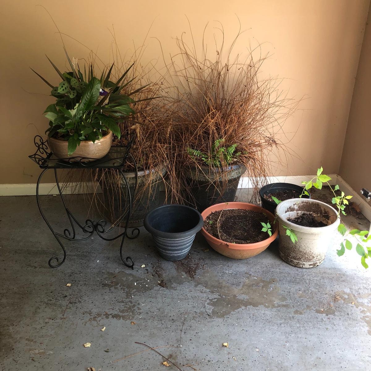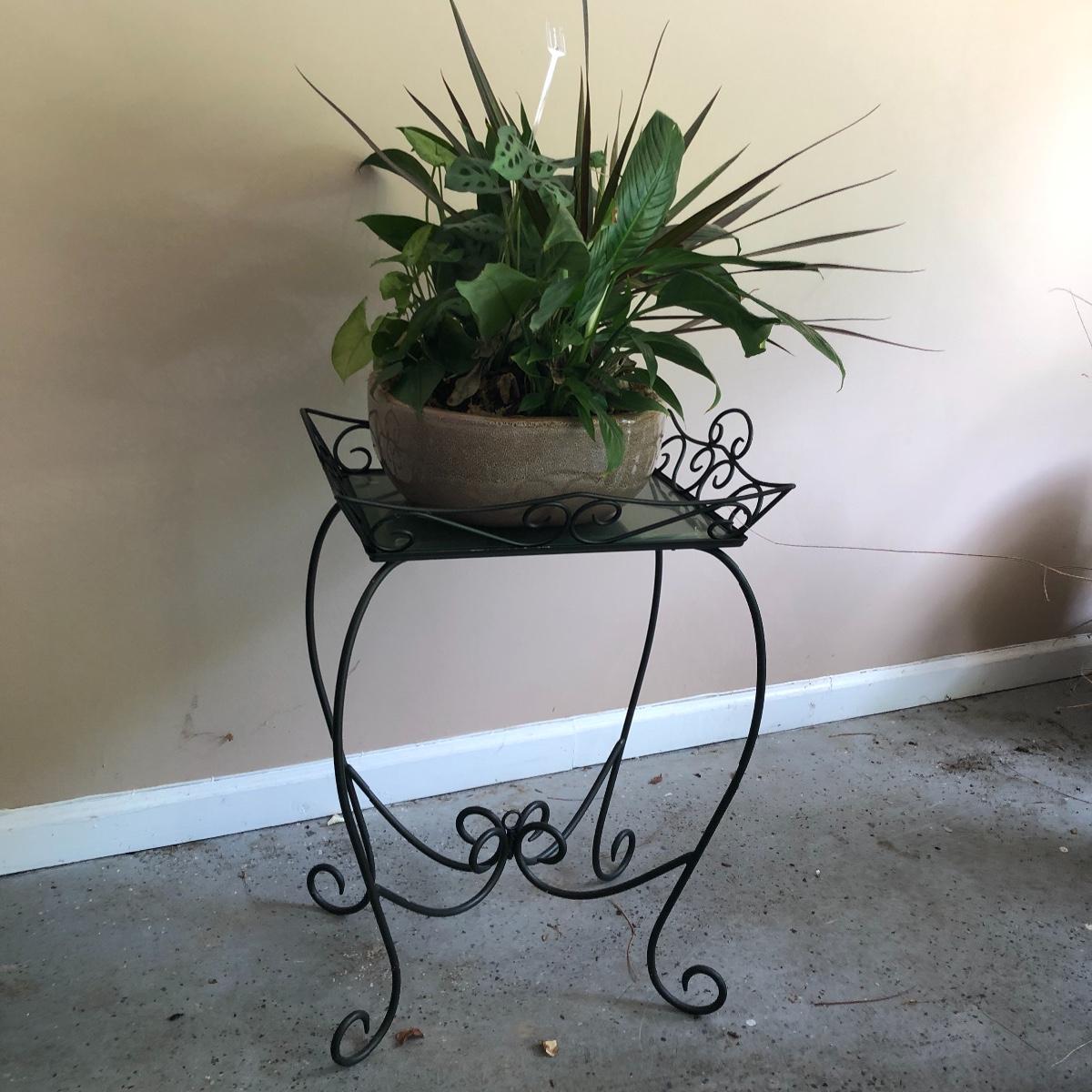 For the folks with the green thumb. Lot includes iron stand with tray and a ceramic pot filled with plants, two matching plastic pots and four assorted plastic pots. Iron stand with tray measures 13.5” x 18” x 26”.