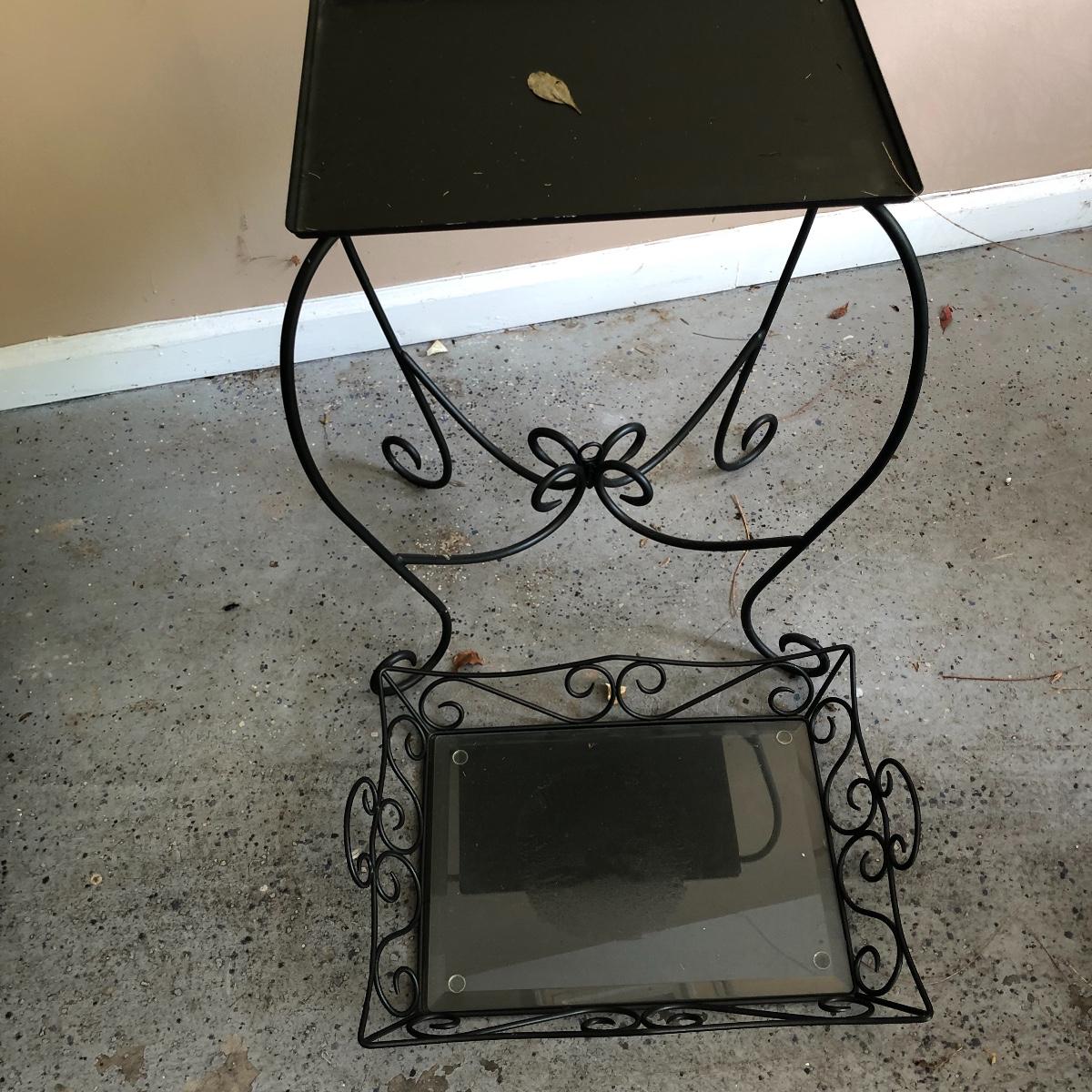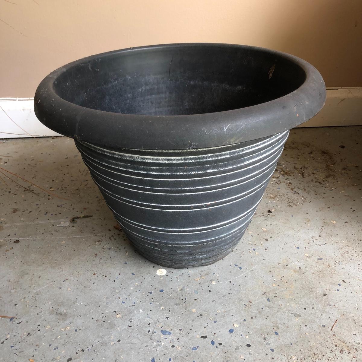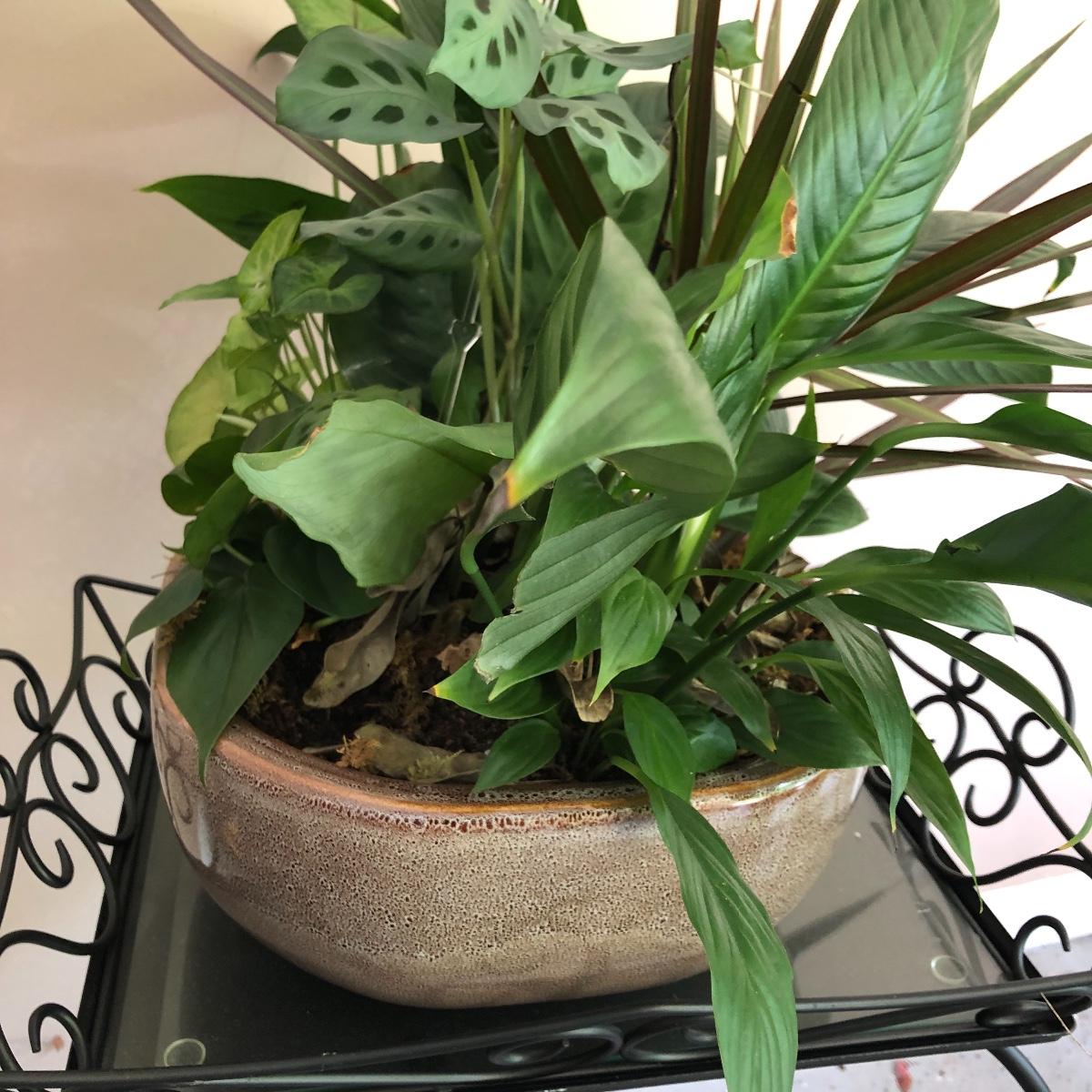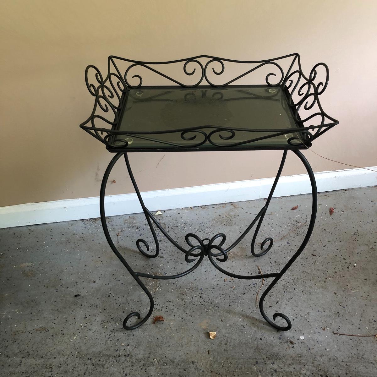 For the folks with the green thumb. Lot includes iron stand with tray and a ceramic pot filled with plants, two matching plastic pots and four assorted plastic pots. Iron stand with tray measures 13.5” x 18” x 26”.