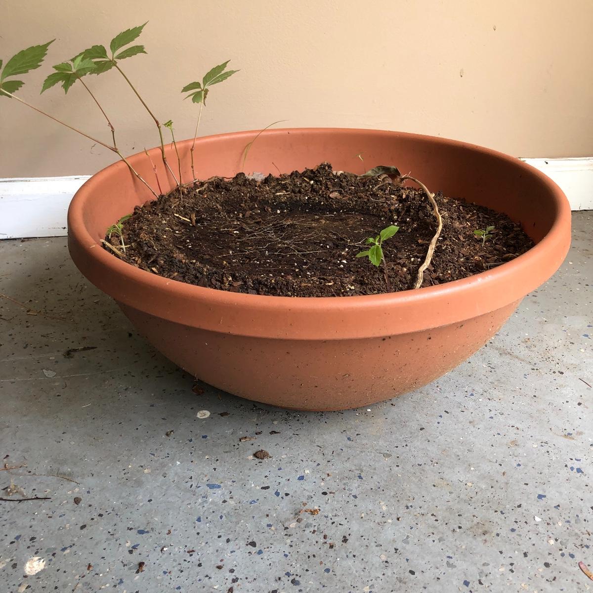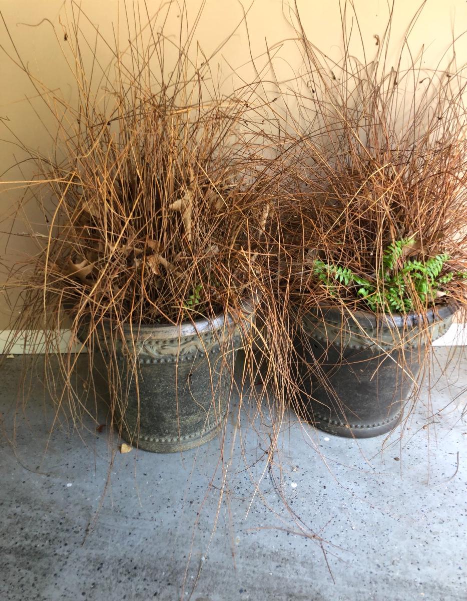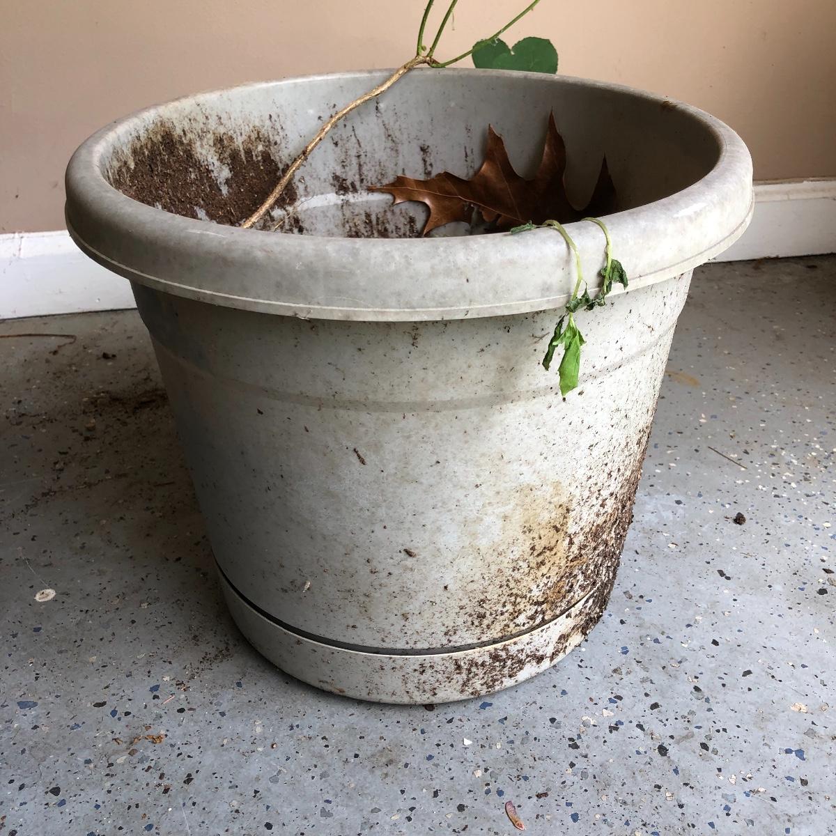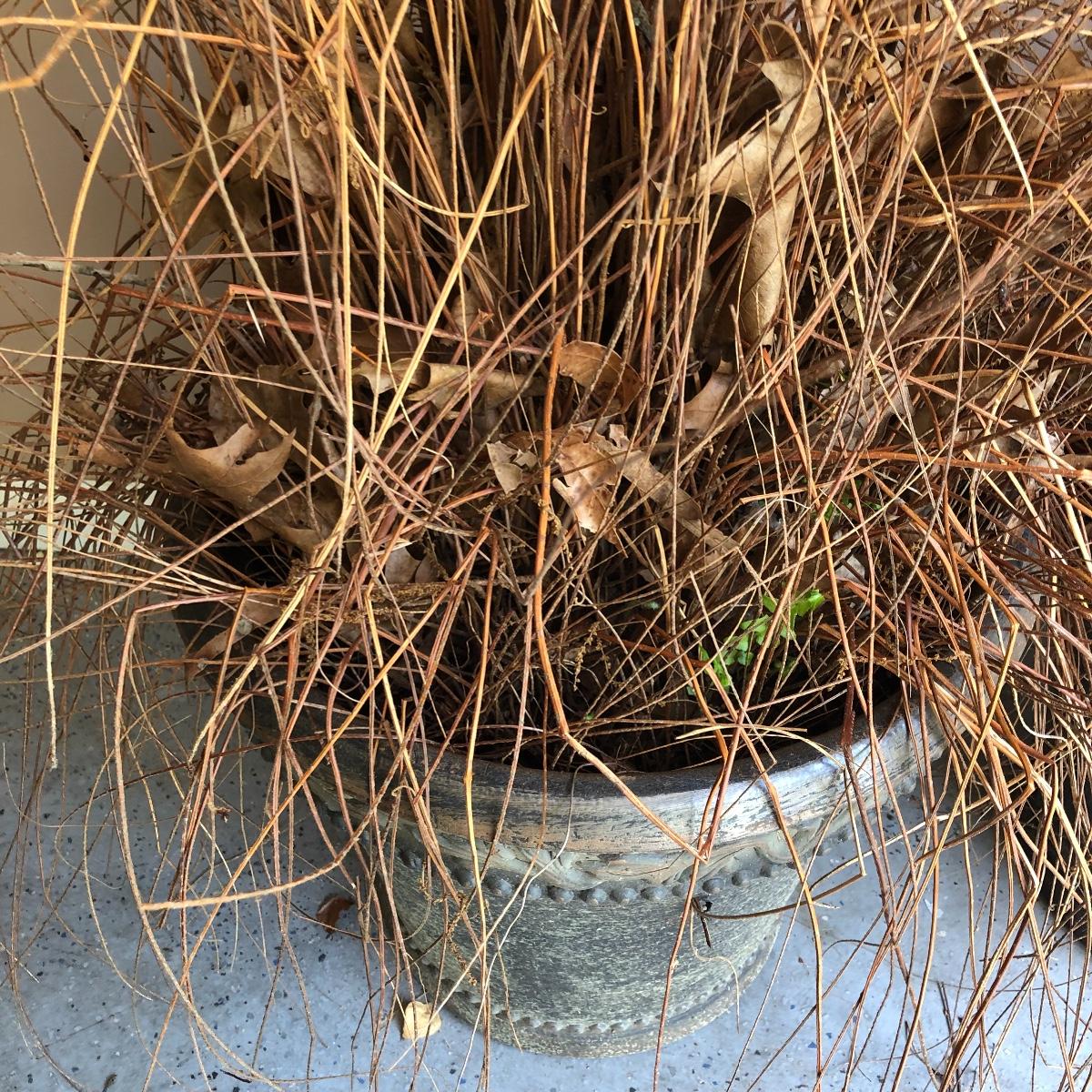 For the folks with the green thumb. Lot includes iron stand with tray and a ceramic pot filled with plants, two matching plastic pots and four assorted plastic pots. Iron stand with tray measures 13.5” x 18” x 26”.