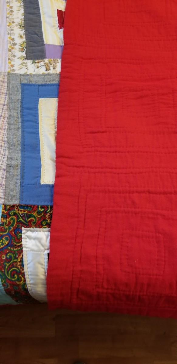 Nice vintage handsewn quilt with a square/block design - red backing. Good condition. 75.5" across, 87" long.