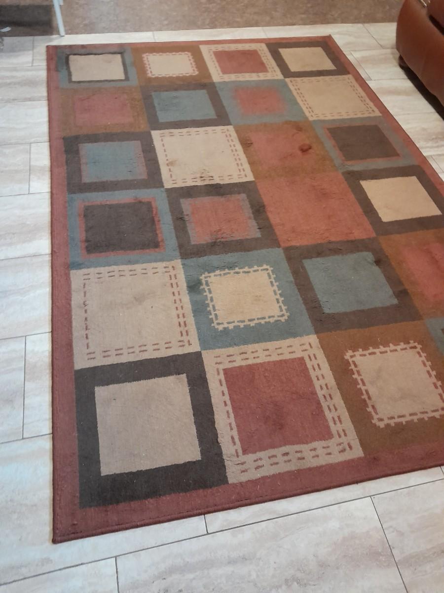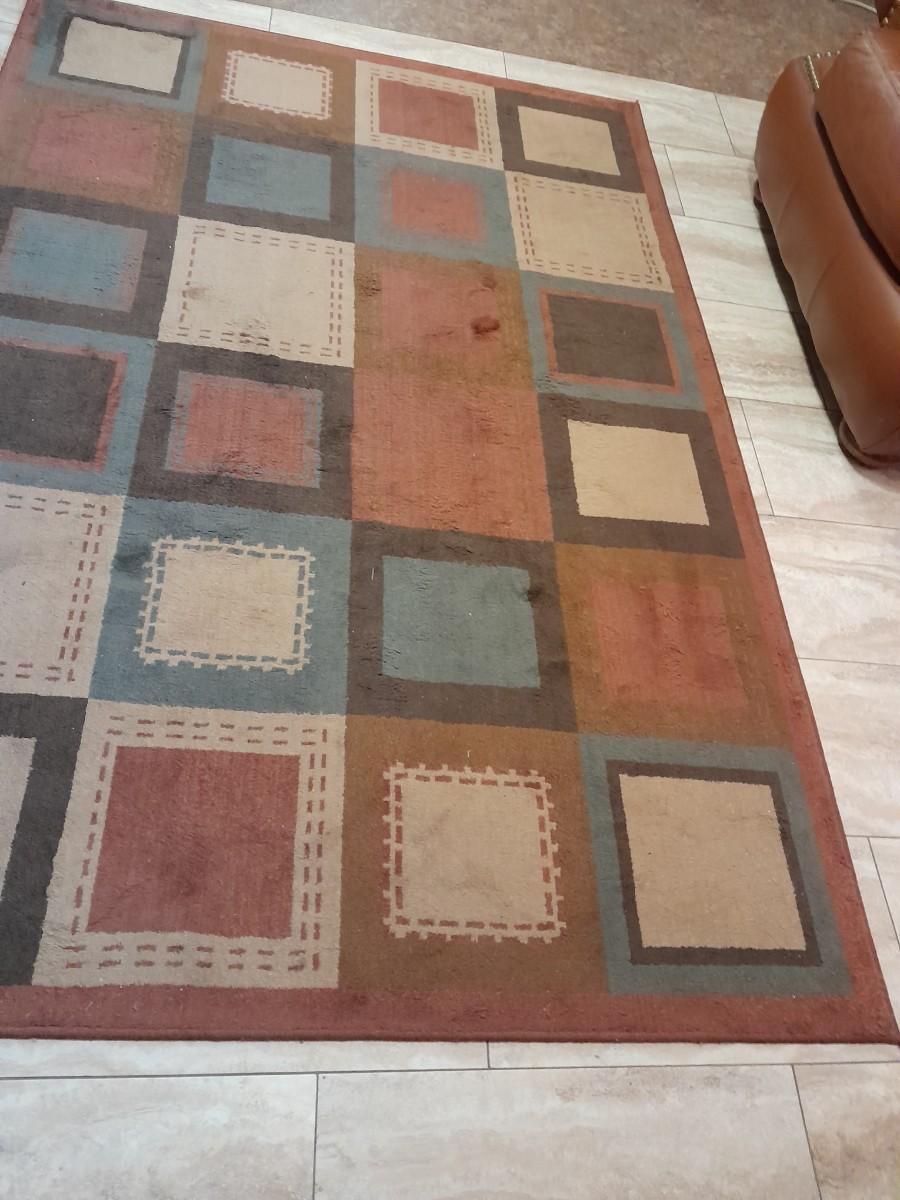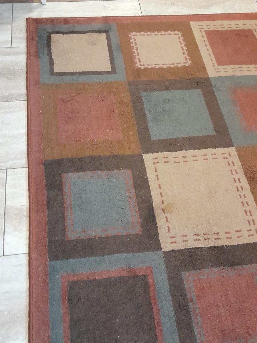 LOT 160 RED / GREY SQUARES RUST COLORED 89" X 60" AREA RUG