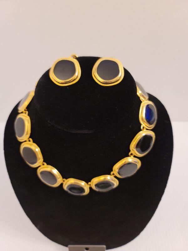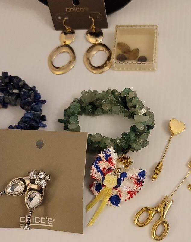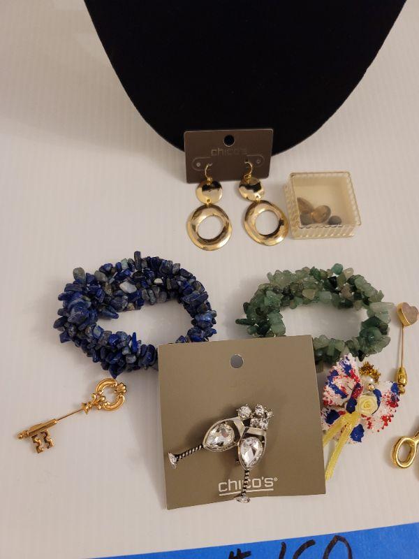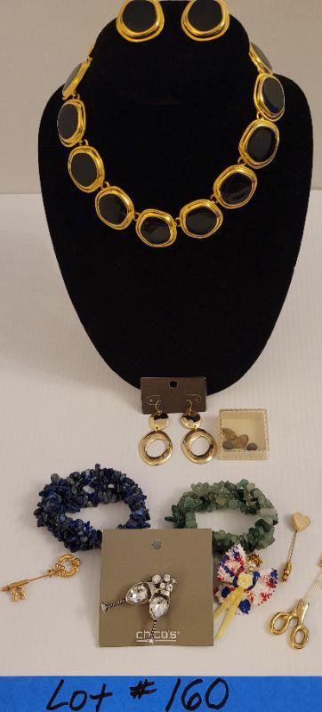 High quality costume jewelry. Gold colored necklace, black onyx? Jade & Lapis lazuli, bracelets, stick pins and loose genuine gemstones.