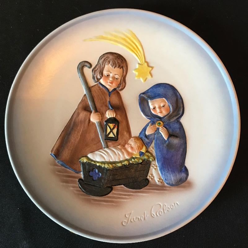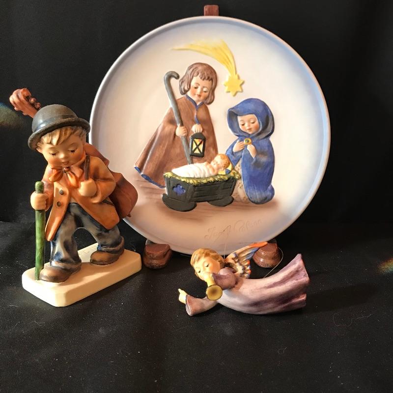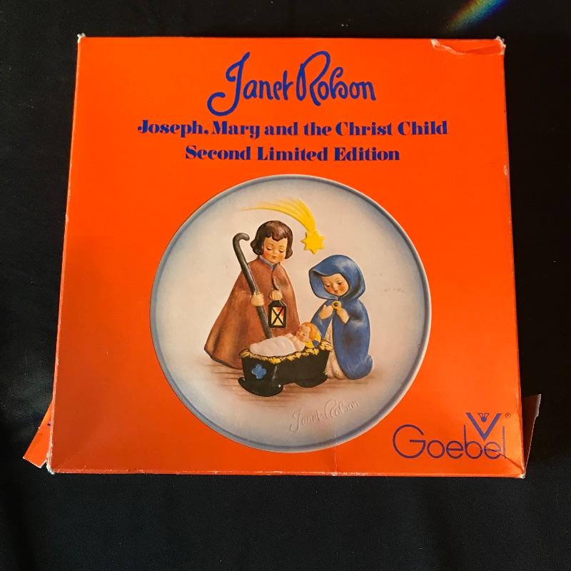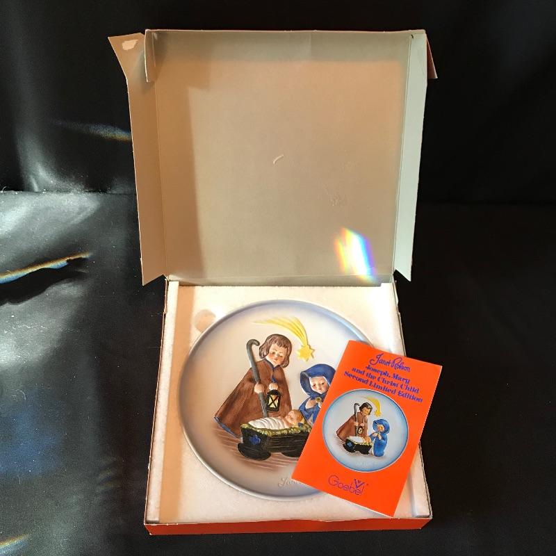 Three collectible pieces from Goebel Hummel. First, complete with box, a Janet Robon Second Limited Edition 7.5” plate titled Joseph, Mary and the Christ Child. Paired up with the plate are two adorable pieces. “Little Cellist” standing 5.5” and a numbered angel ornament. See photos. Shipping available.