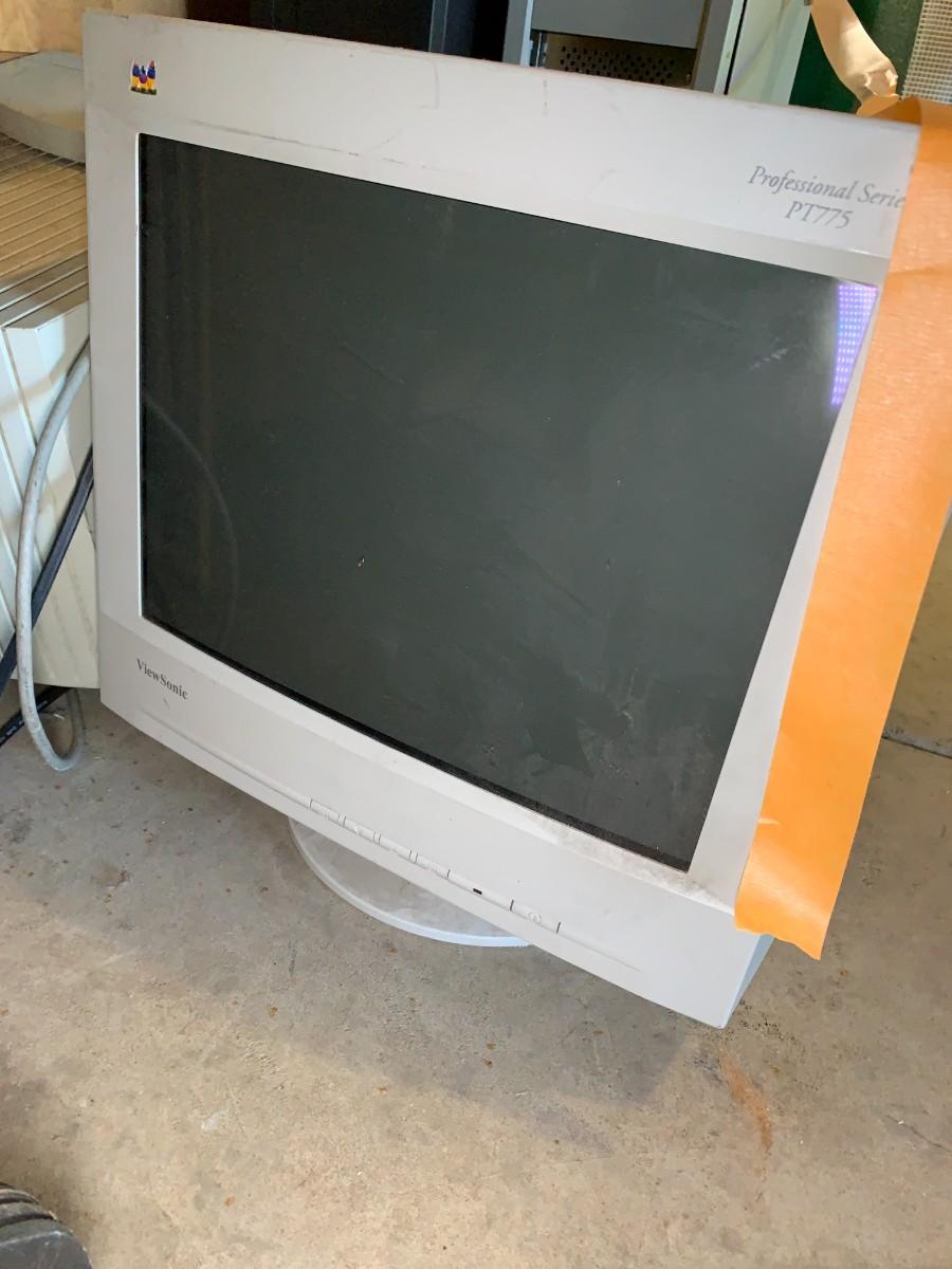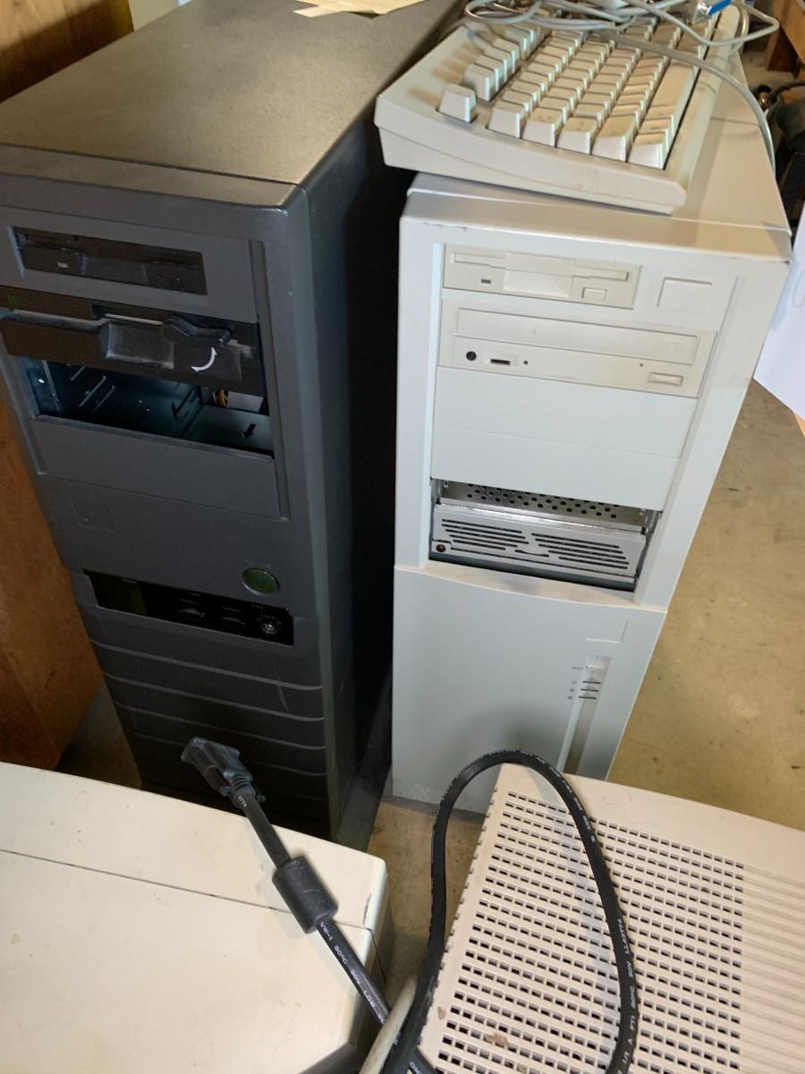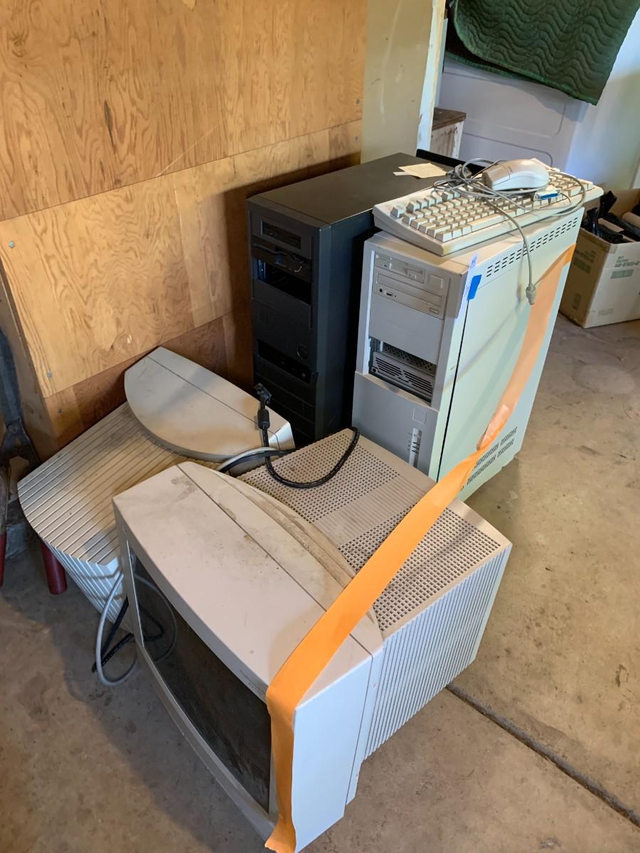 2 tall computer towers, have all inner workings except hard drive. 2 CRT monitors, great for set props, weight lifting and boat anchors. Keyboard and mouse included.
