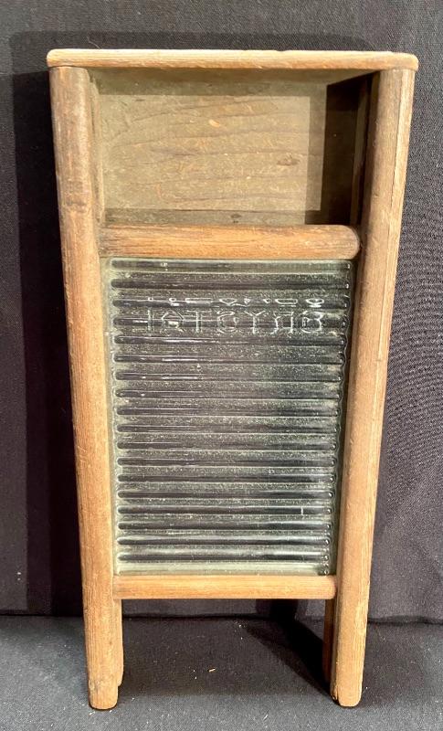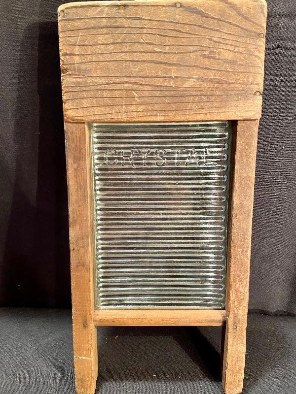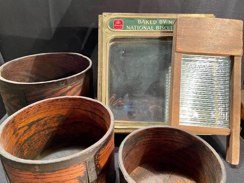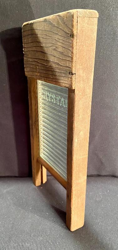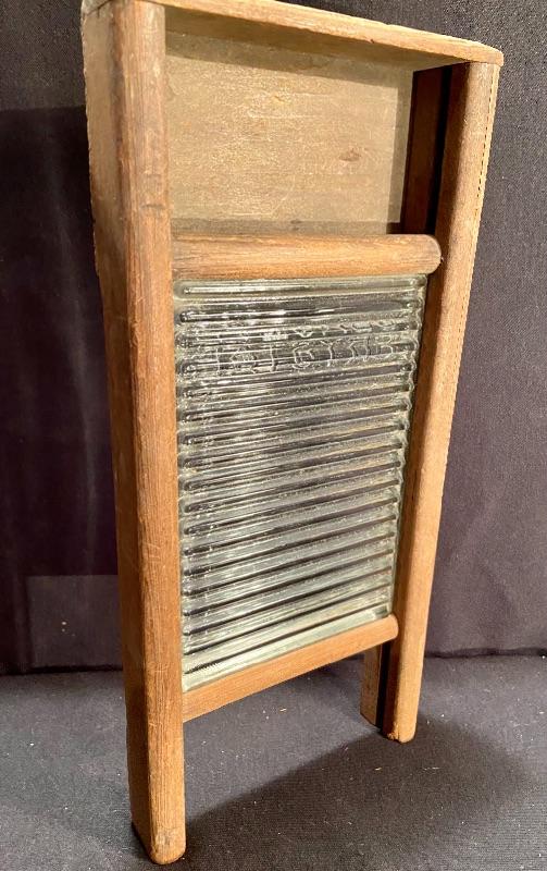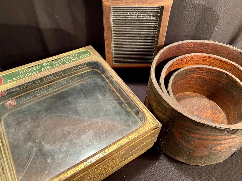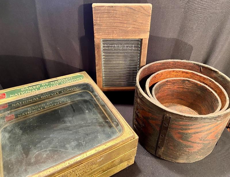3 vintage wooden pantry boxes 8.5x6, 6.5x5, and 5.5x4 inches, 3 vintage Nabisco Biscuit box covers with glass inserts 10.5x10.5 inches, and small vintage wood and crystal washboard about 11.5 inches tall. MHW Please see all pictures for content of the lot, condition of the lot, and measurements if taken. Pictures are the best representation of the items listed and items are untested unless indicated in description. Thank you for looking and have fun bidding