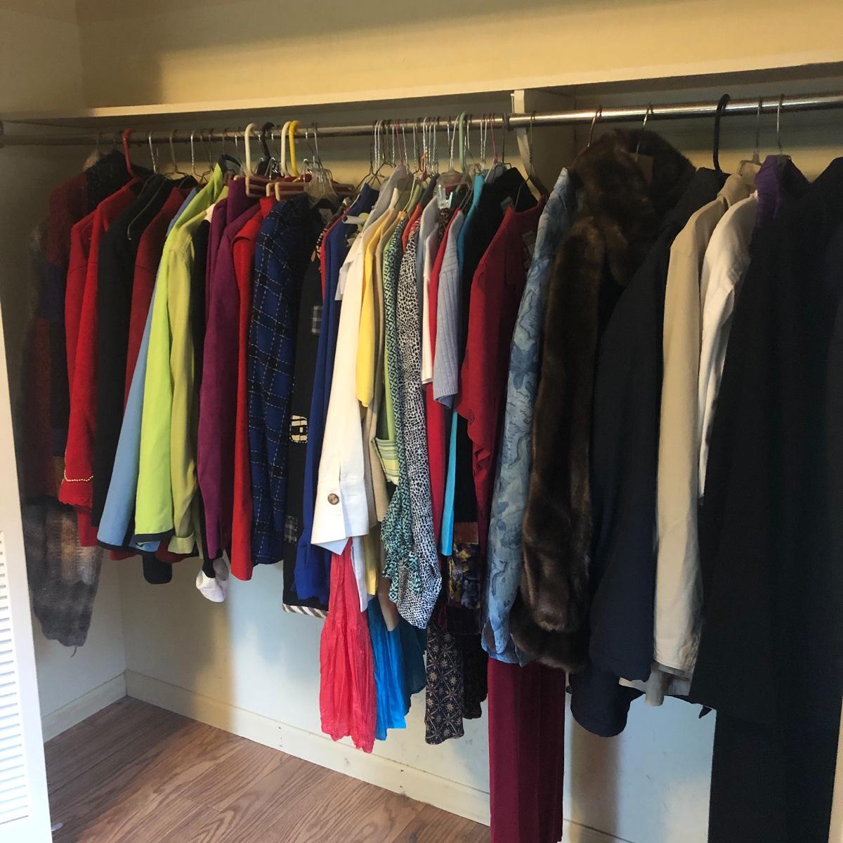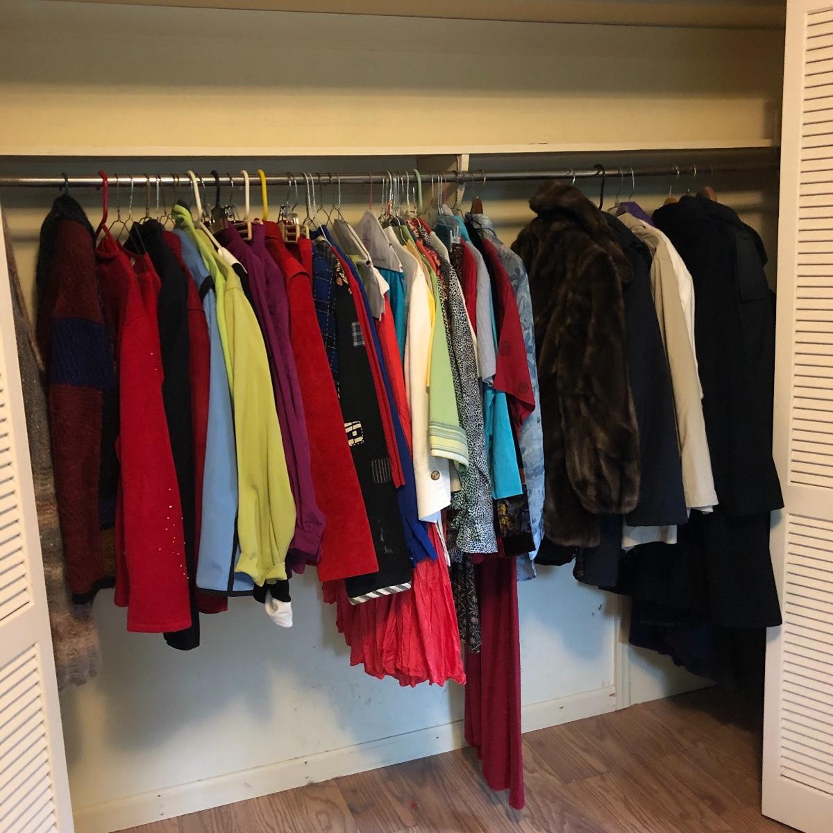 What an addition to your wardrobe! In this closet of approximately forty-seven items, there are four sweaters, seven coats, twenty three blouses, two complete sweat outfits and about six blazers with three having slacks. This lot even includes a Fur Coat. Most sizes start at large and run from 1X to 2X. Local pick up only.