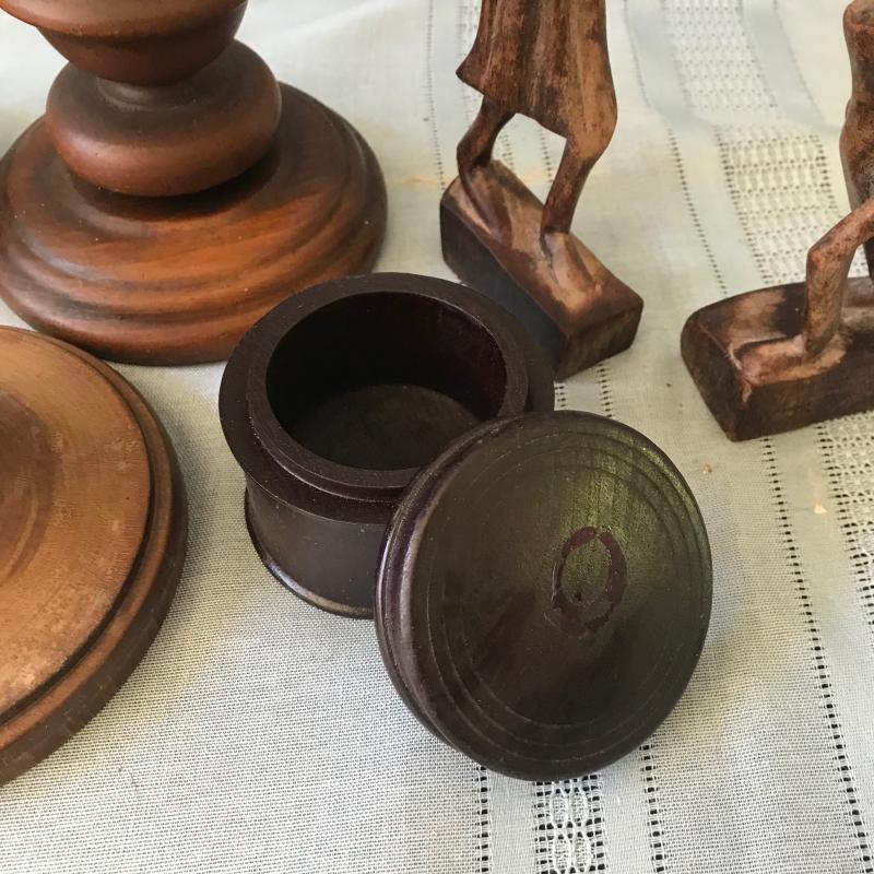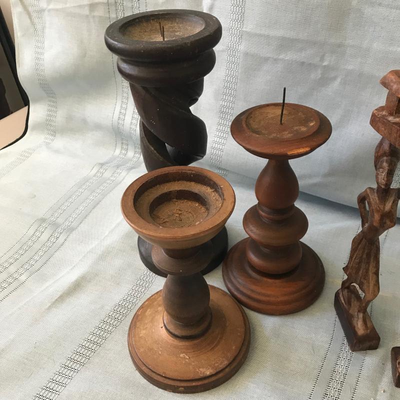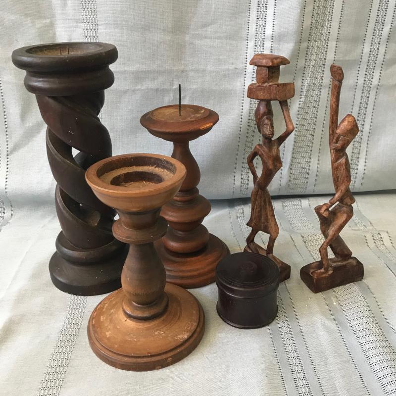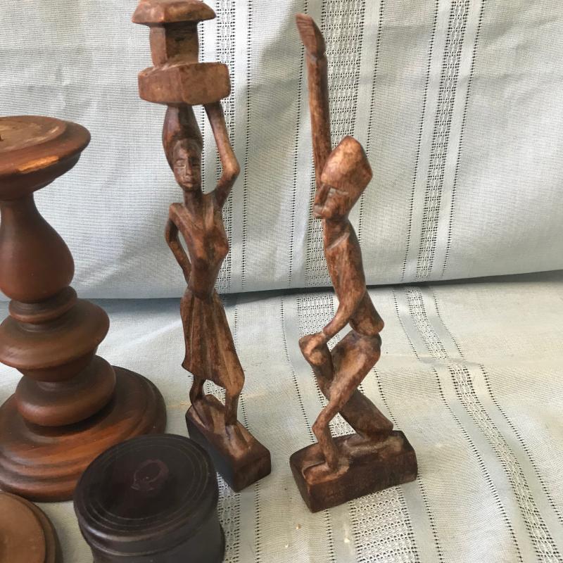 Several nice wooden candle holders. Tallest one measures 5”d and 12”h. Pair of figurines are 11.5” tall. Also includes a small lidded box. Shipping or local pick up.