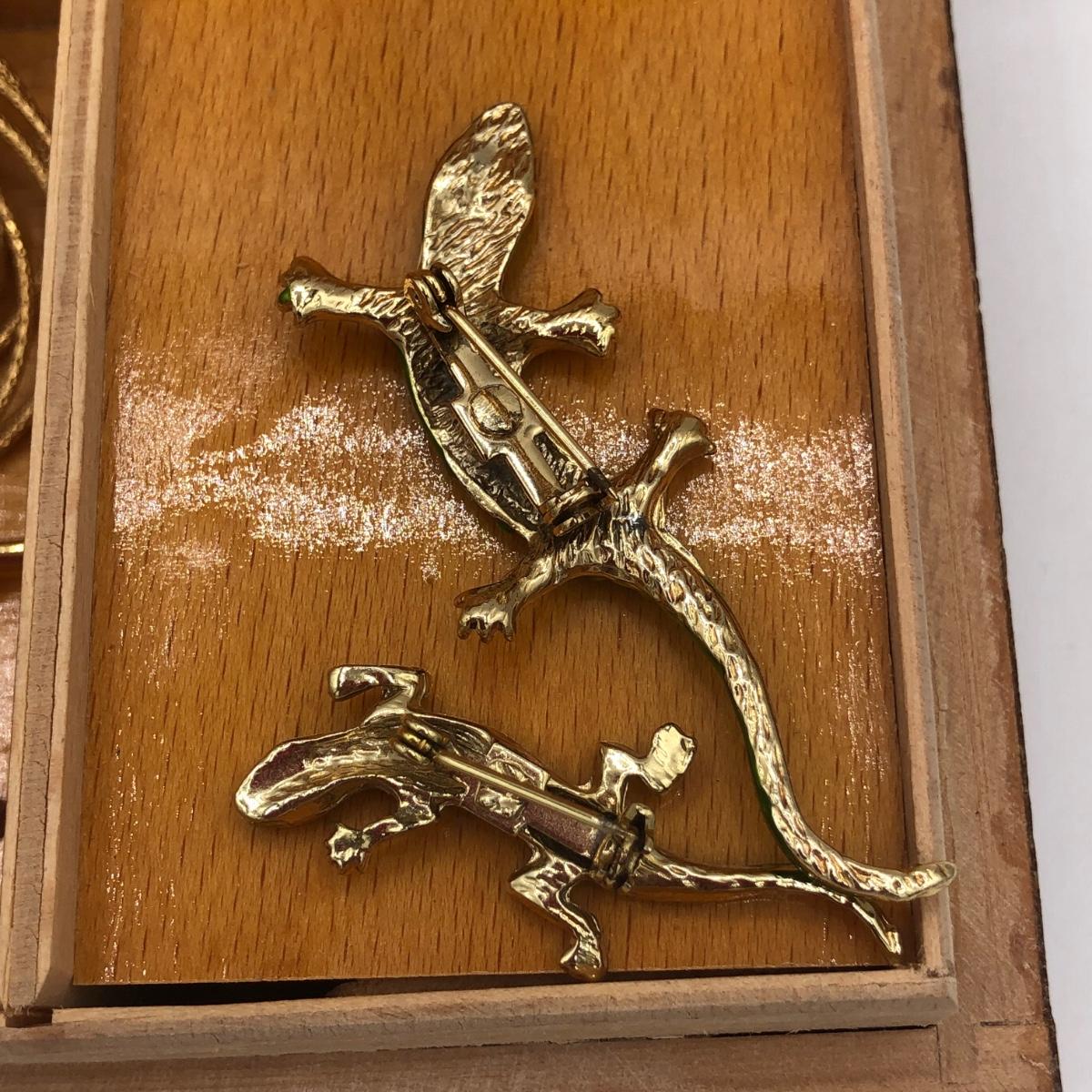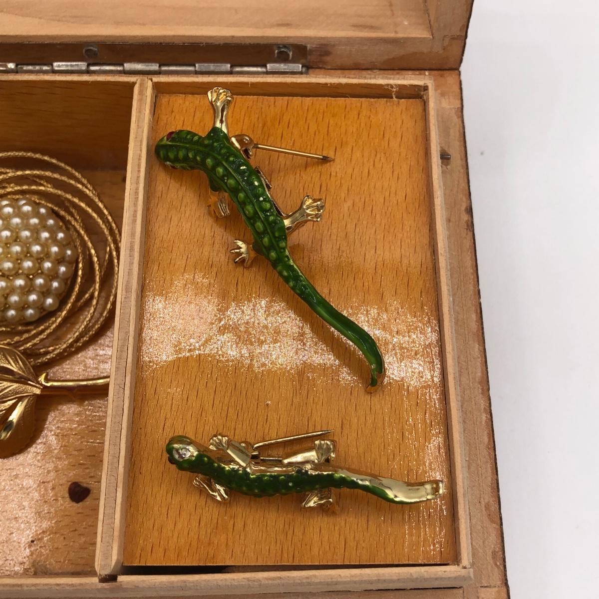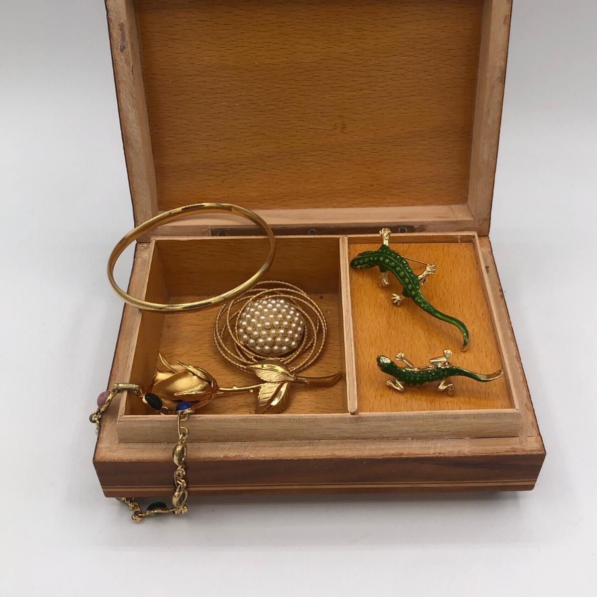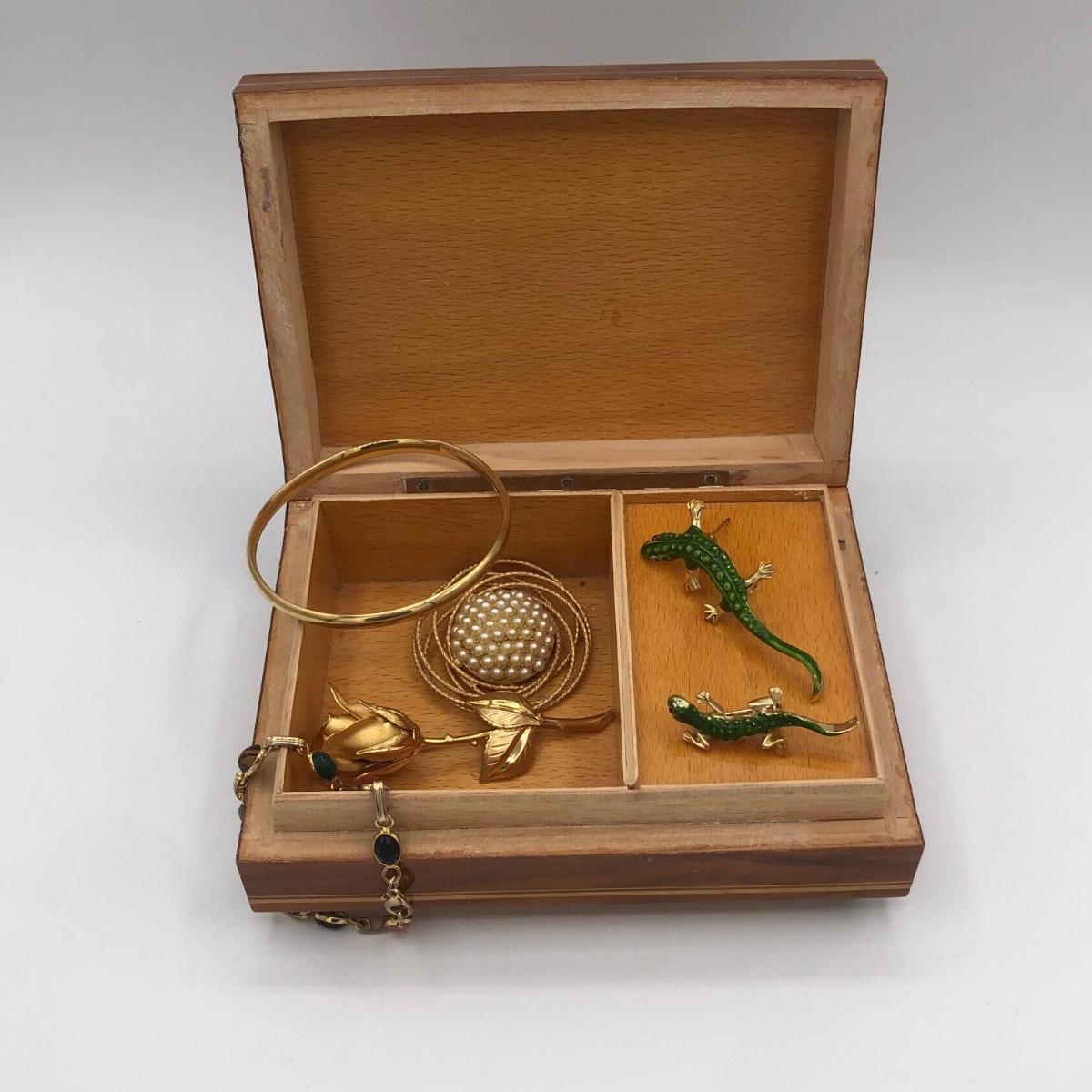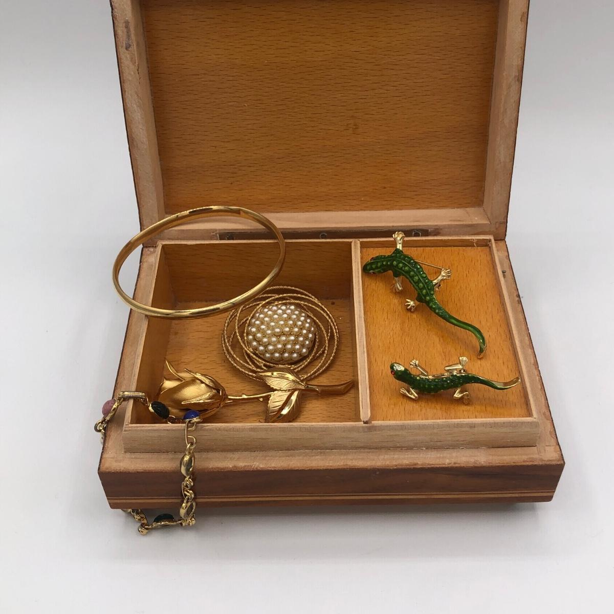 LOT 160J: Vintage Enameled Lizard Pins w/ rhinestone eyes, Scarab Bracelet & More in Wooden Music Box "Come Back to Sorrento"