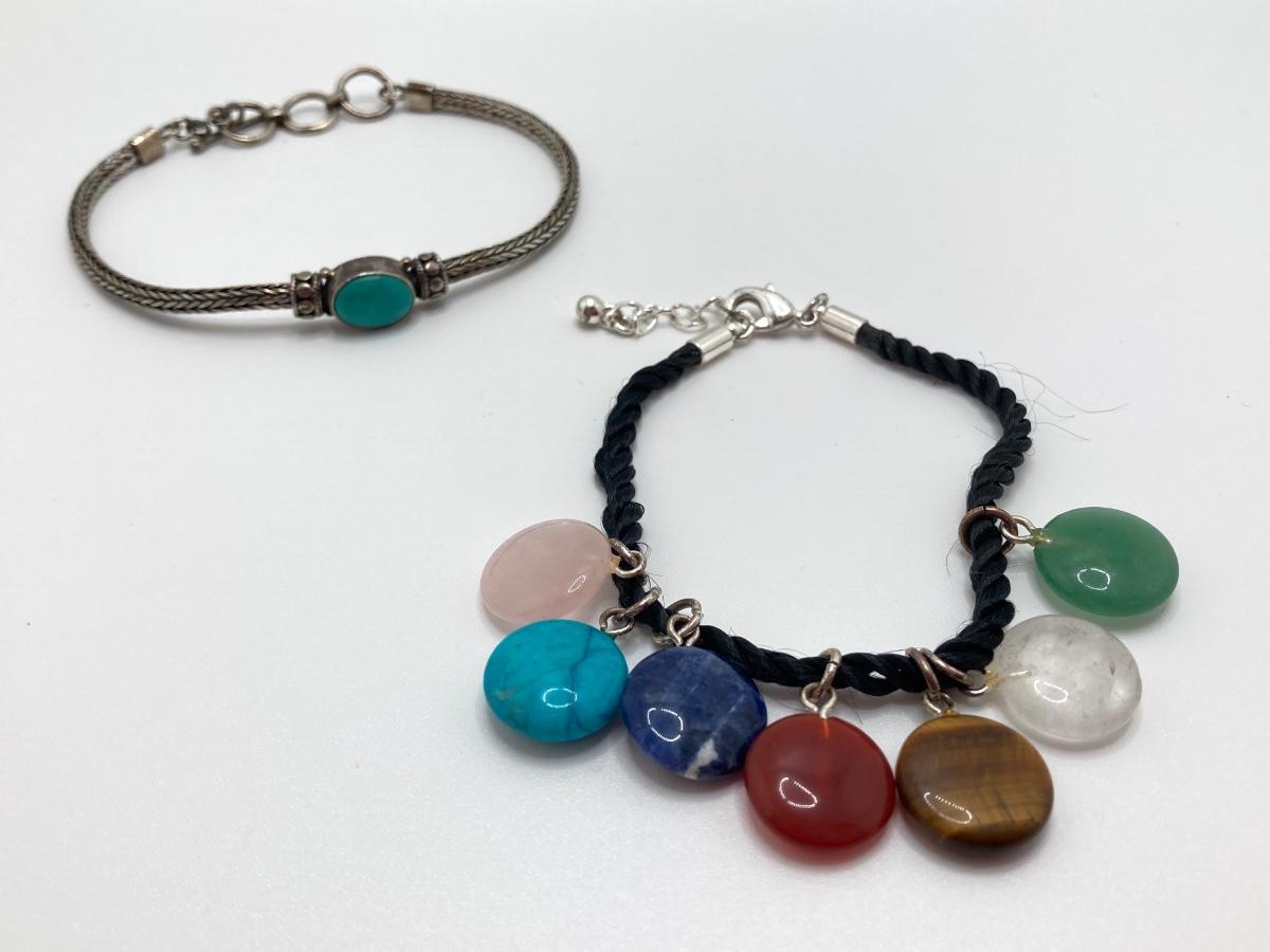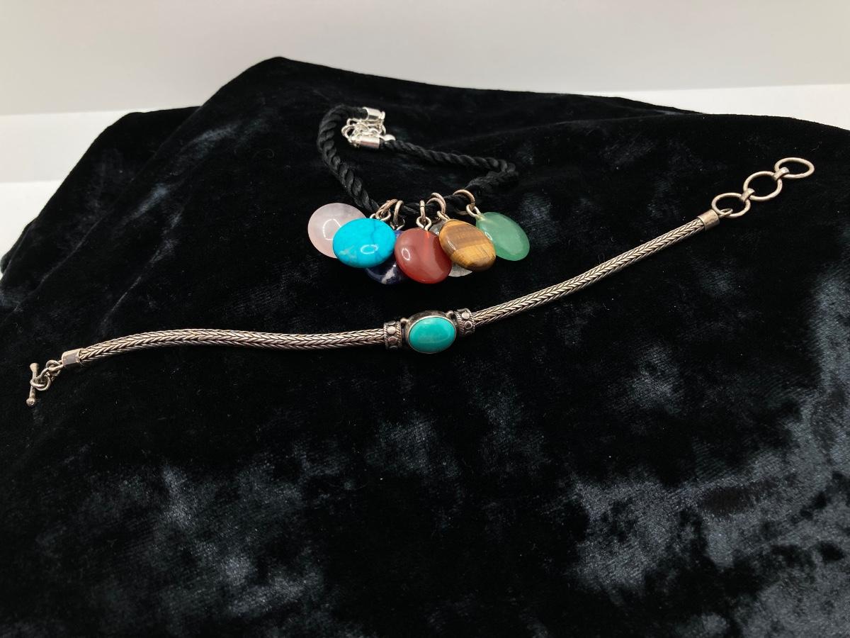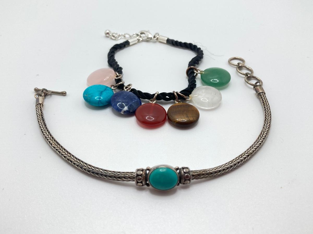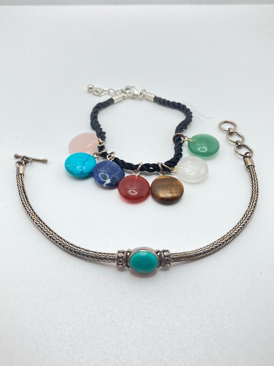 LOT 161: Bracelet Collection - Sterling and Turquoise and Semi Precious Discs on Silk Cord - Adjustable 7 - 8"