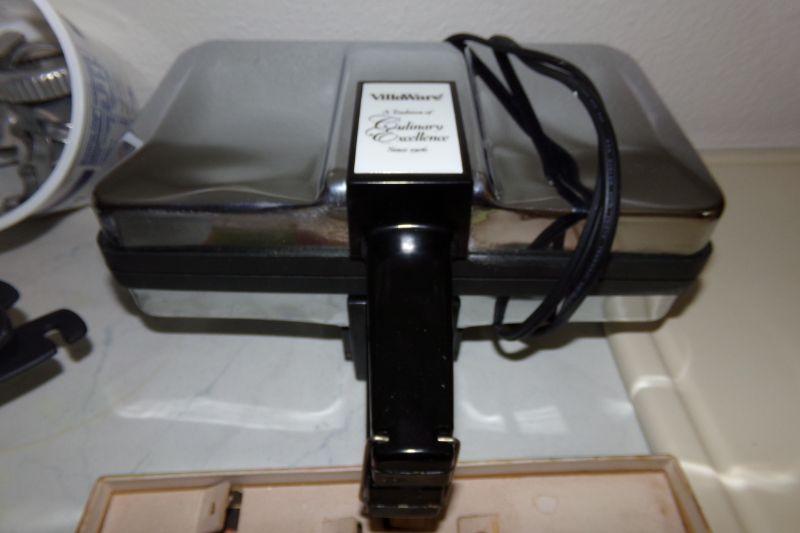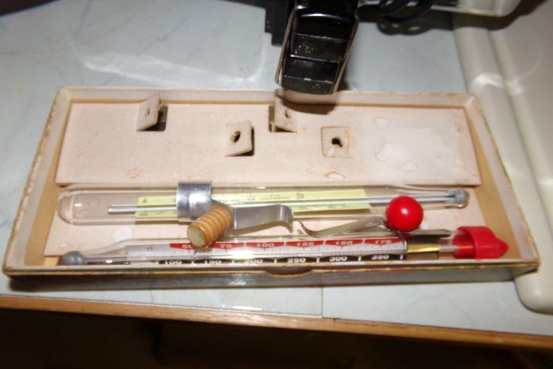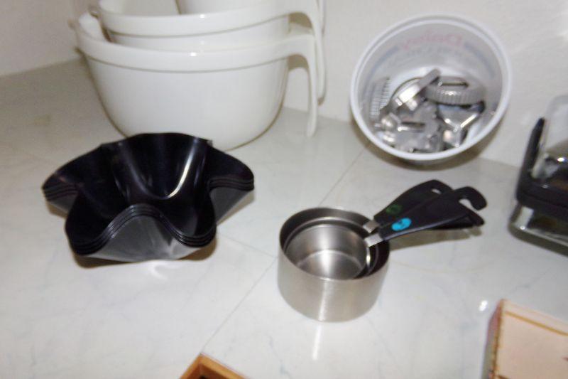 3 PLASTIC BOWLS WITH HANDLE AND RUBBER RINGED BOTTOM, PIZZELLE MAKER, 2 CANDY THERMOMETERS, COOKIE CUTTERS AND MORE