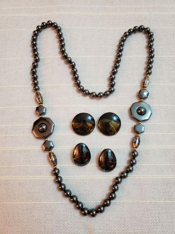 Hematite & Cloisonne Necklace & 2 pairs of Earrings (not Hematite)