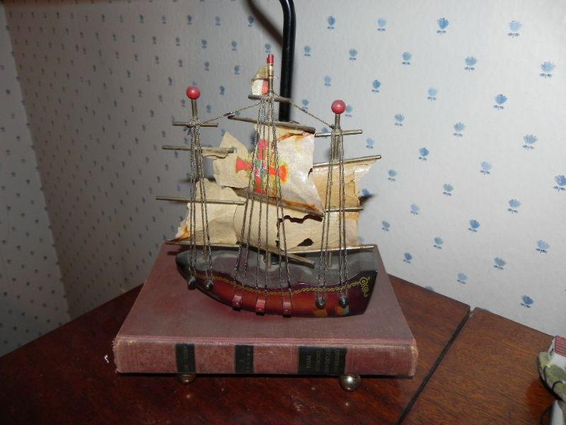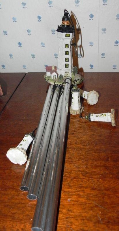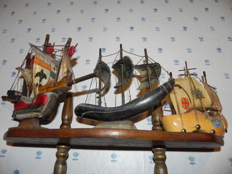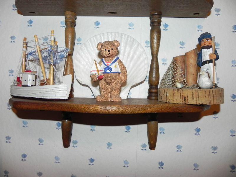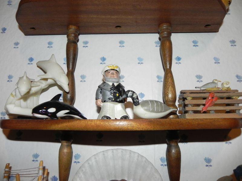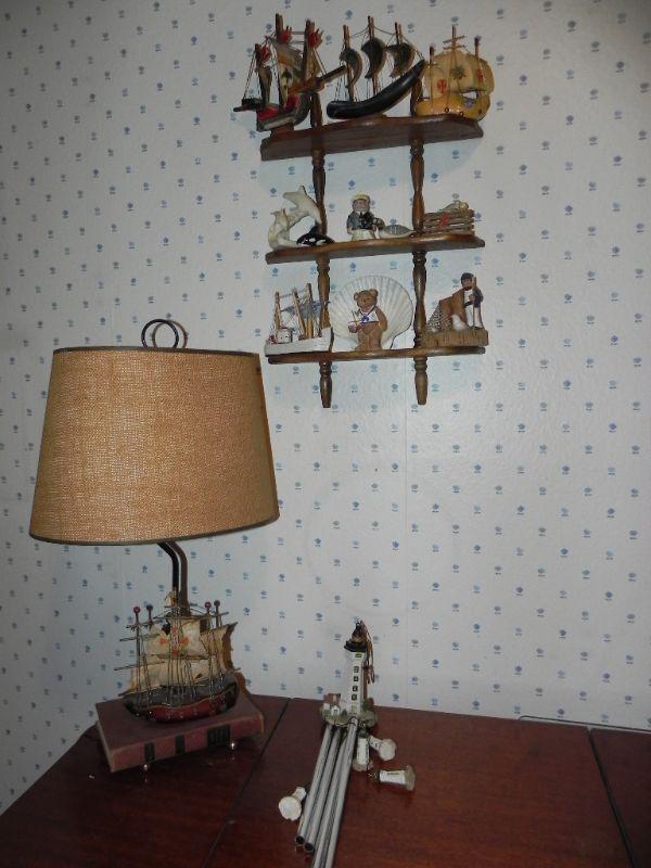 SHIP LAMP, LIGHTHOUSE WIND CHIME, SHIPS MADE OUT OF A WOODEN SHOE AND BONES, SMALL FIGURINES AND THE 3 TIER WALL SHELF