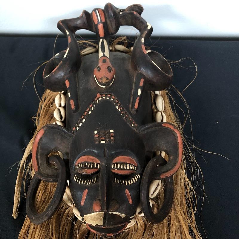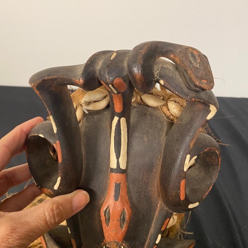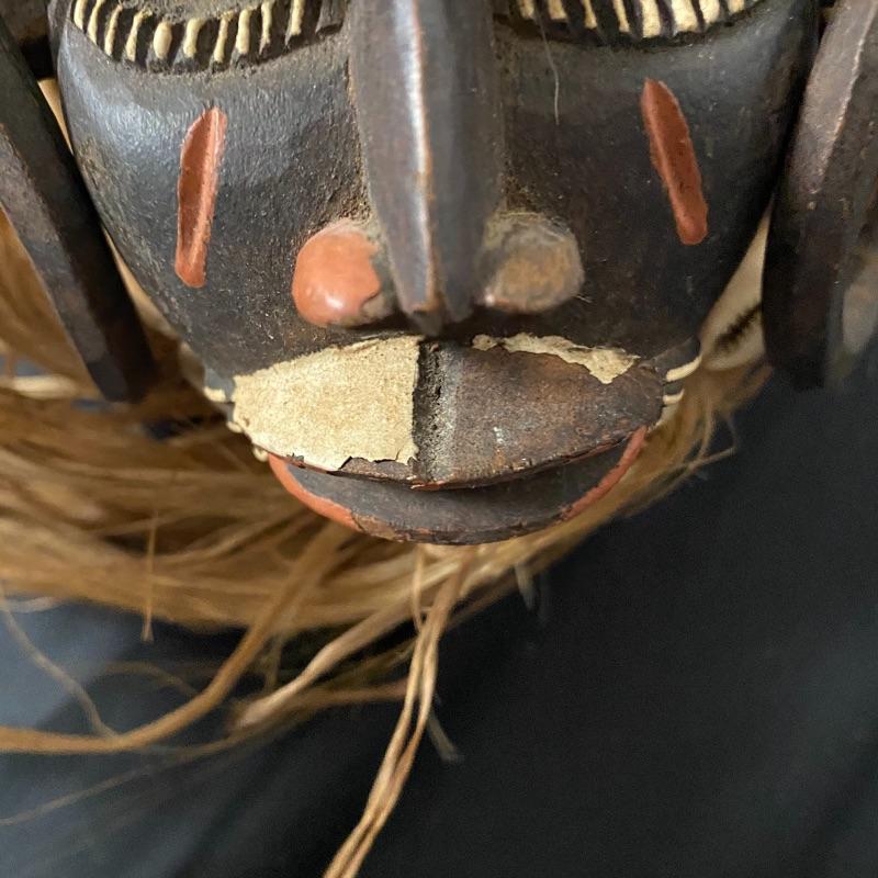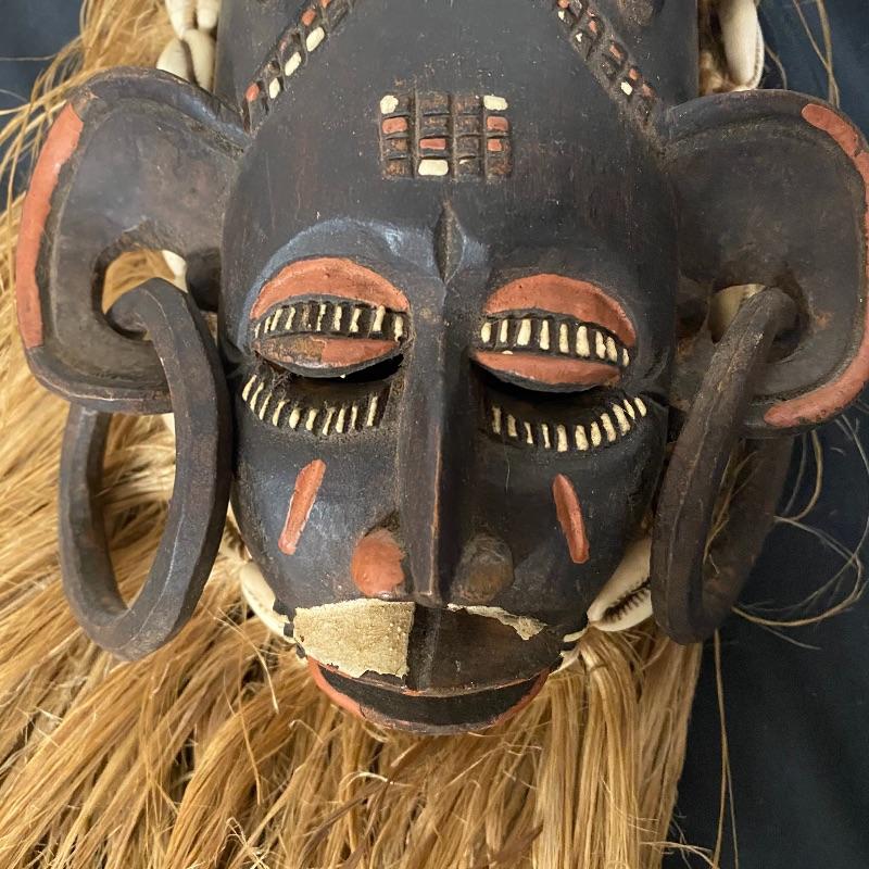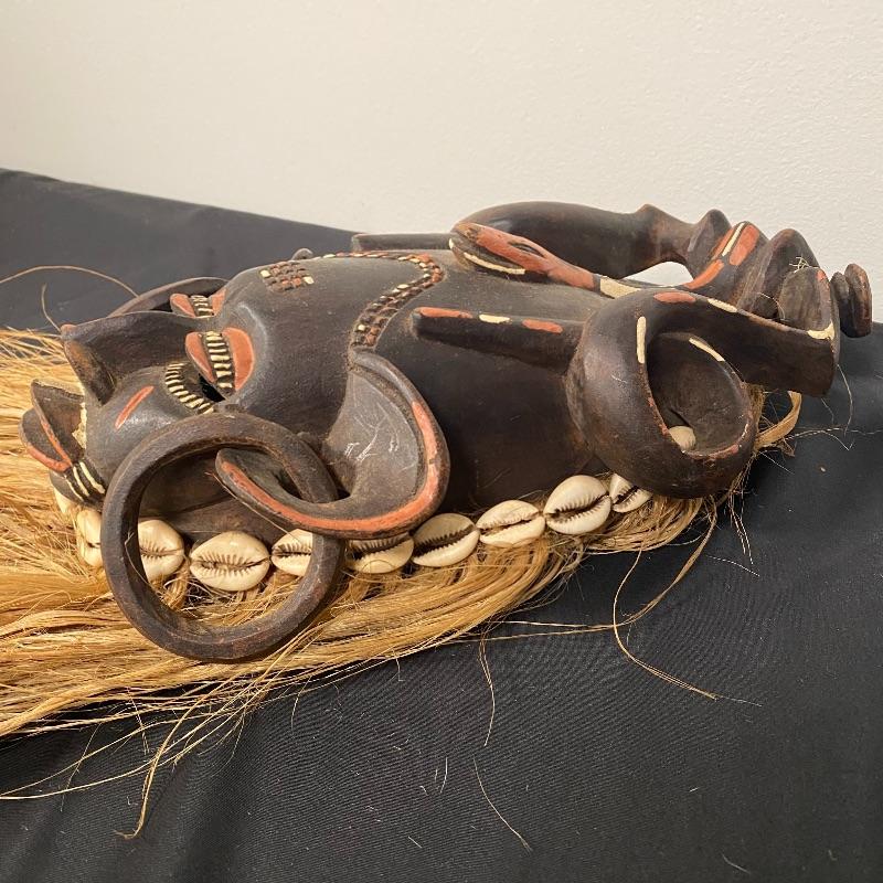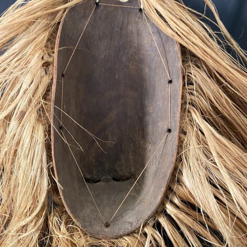 This mask (7” x 26”) is made out of wood, with a beautiful headdress, earrings and intricate facial designs. It also has long straw/rope hair and shell accents.