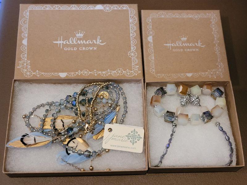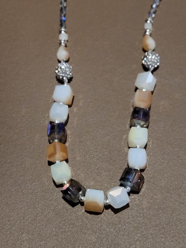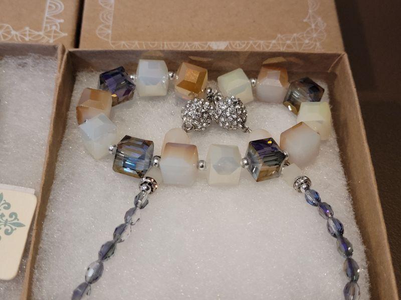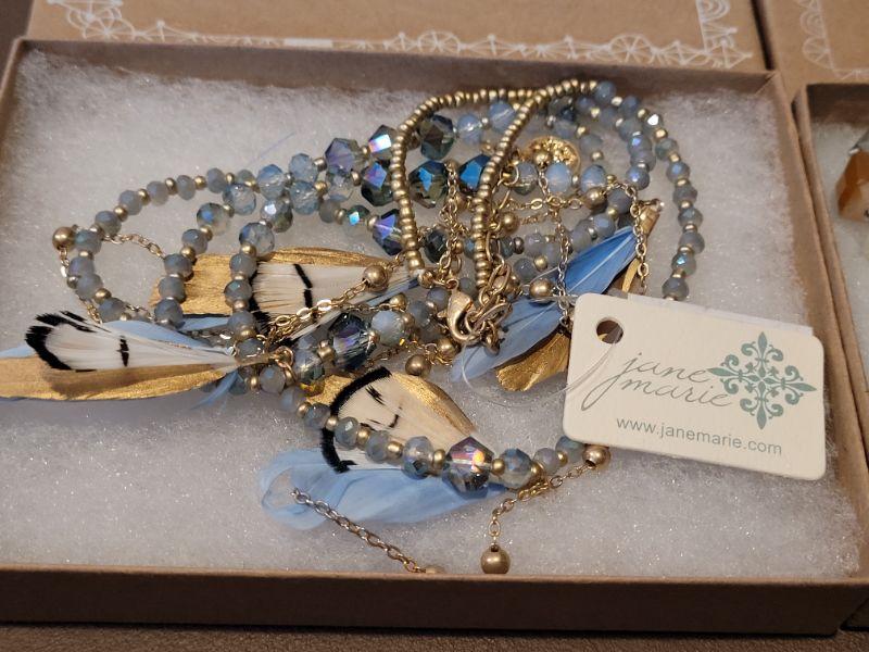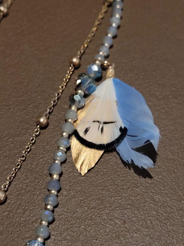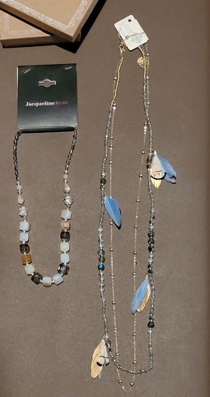 Lot 161: New Hallmark Long Blue Beaded & Chain Necklace with Blue & Gold Feathers & New Square Polished Stone & Glass Beaded Necklace (Square Beaded Area can Detach & be worn as a Bracelet)