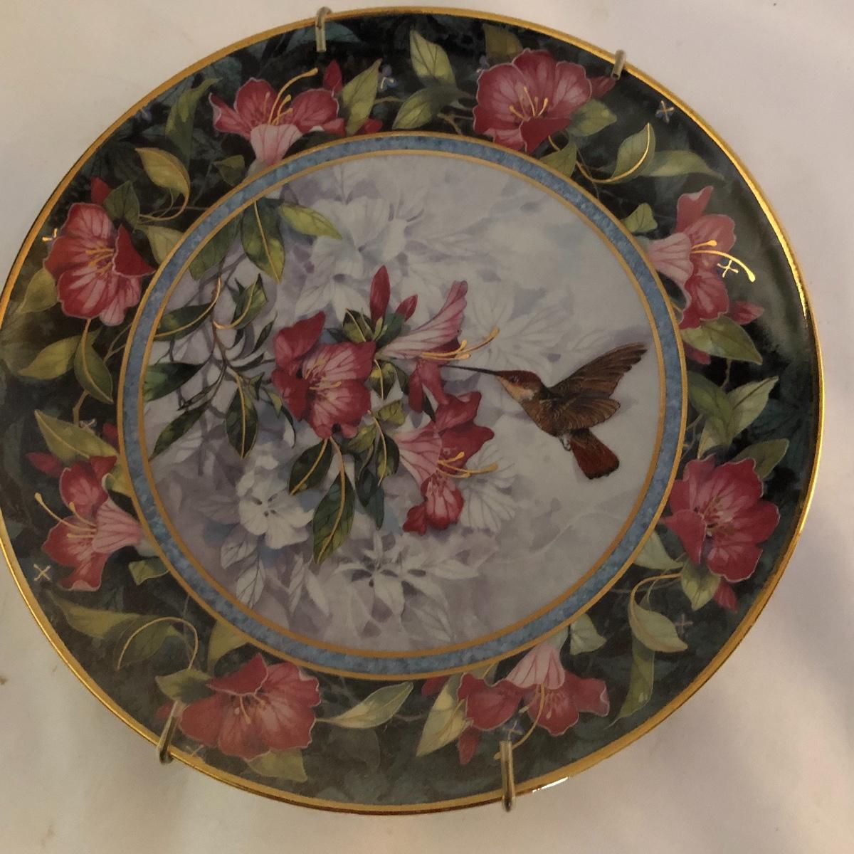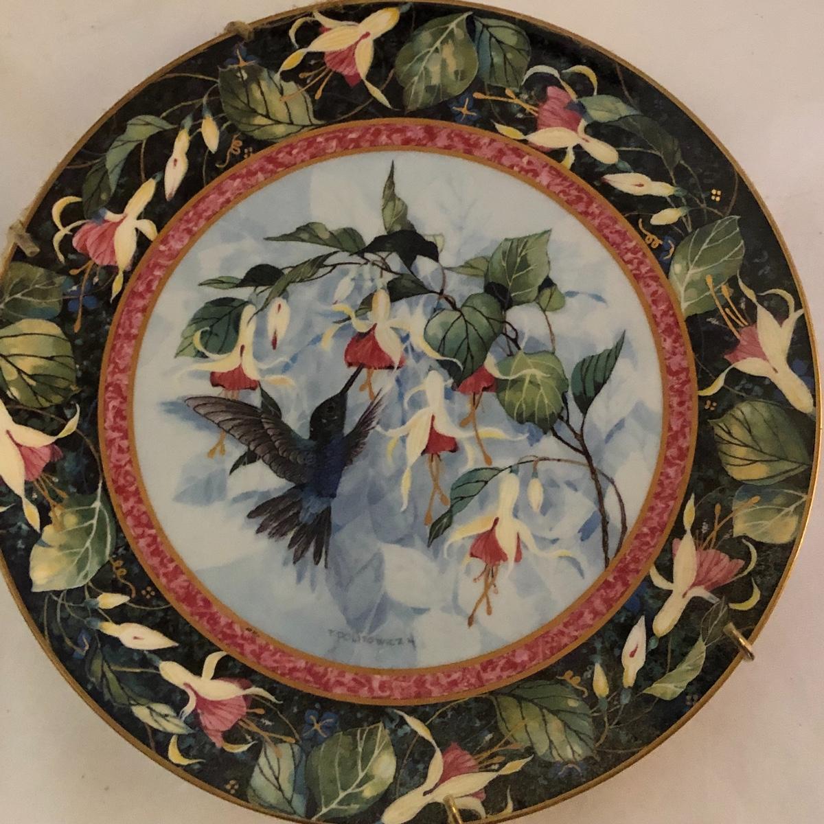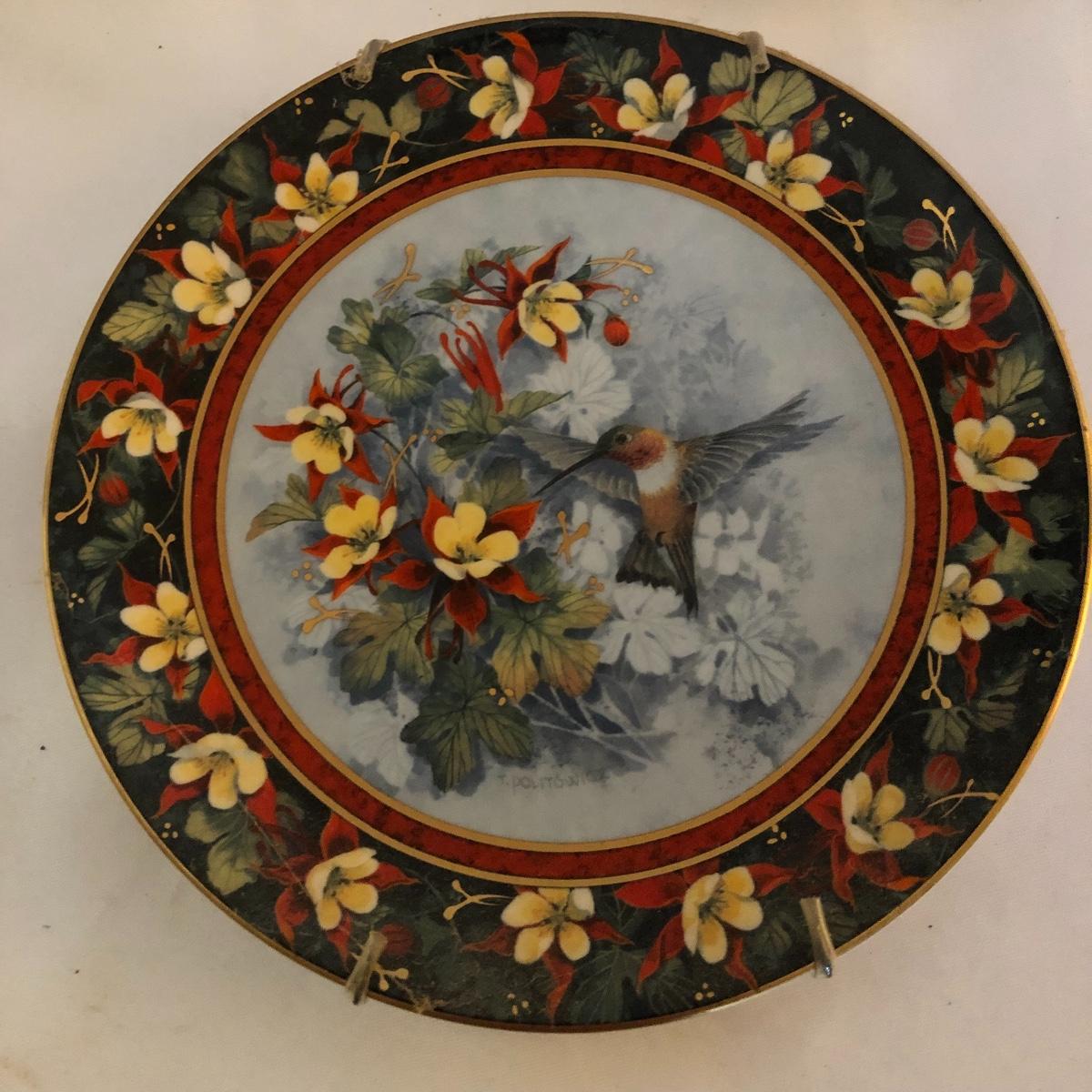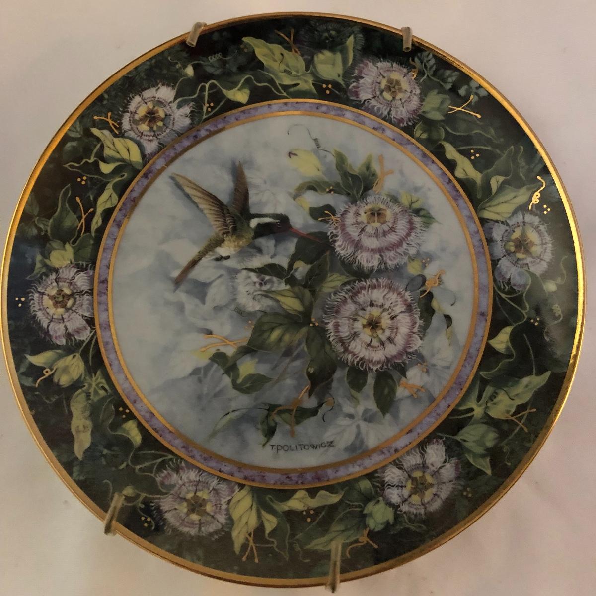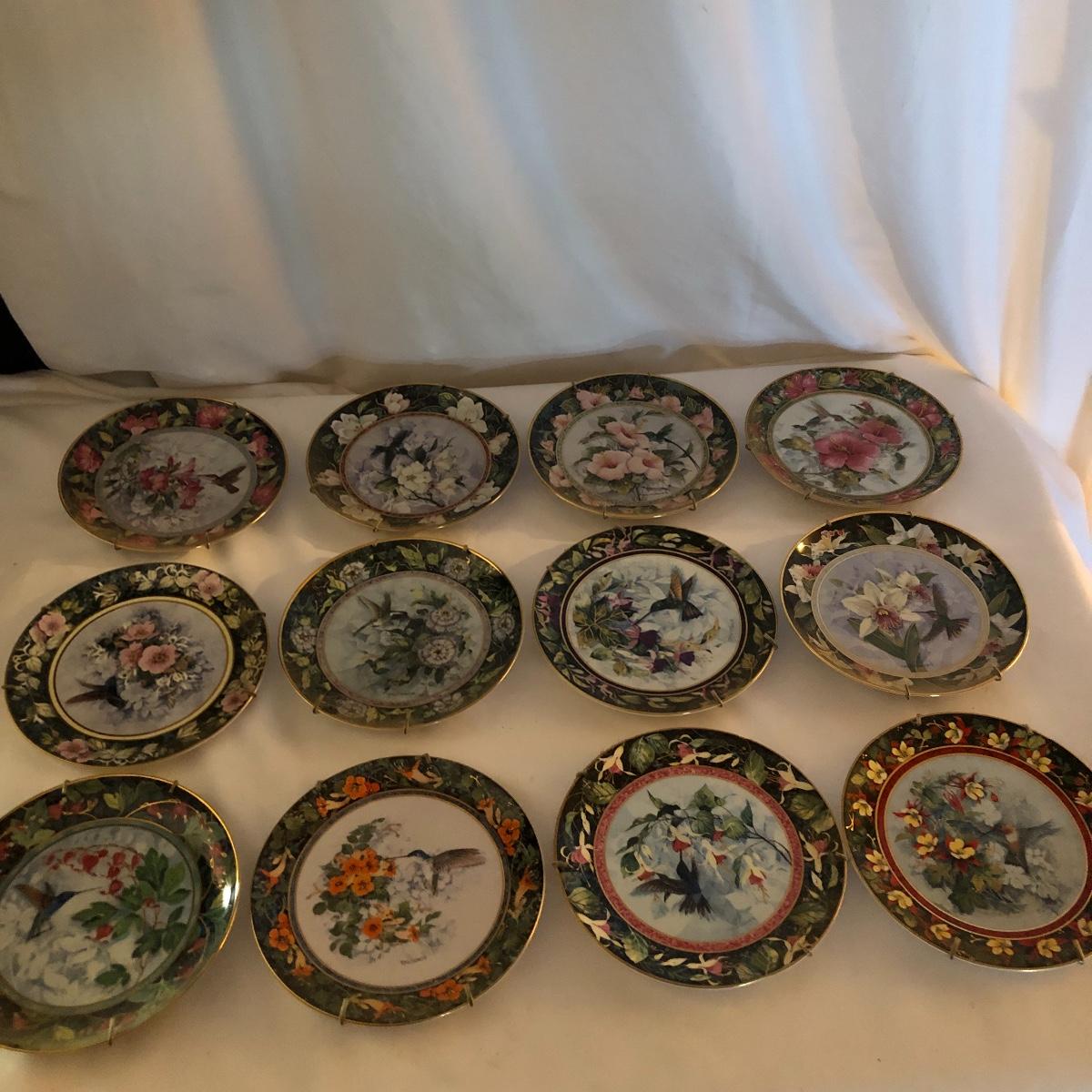Decorate your home while paying homage to the small and mighty hummingbird. Each signed plate is a piece of art with vivid colors and gold edged! This lot contains twelve plates - all equipped with plate hangers and different scenes with hummingbirds! Each plate measures 8” in diameter. Shipping Available.