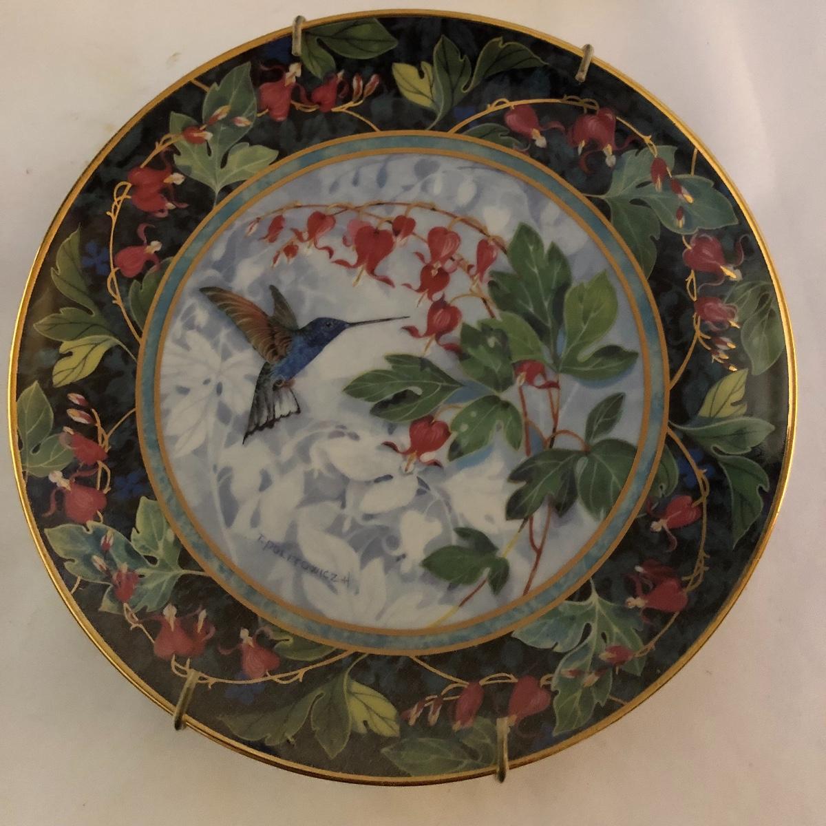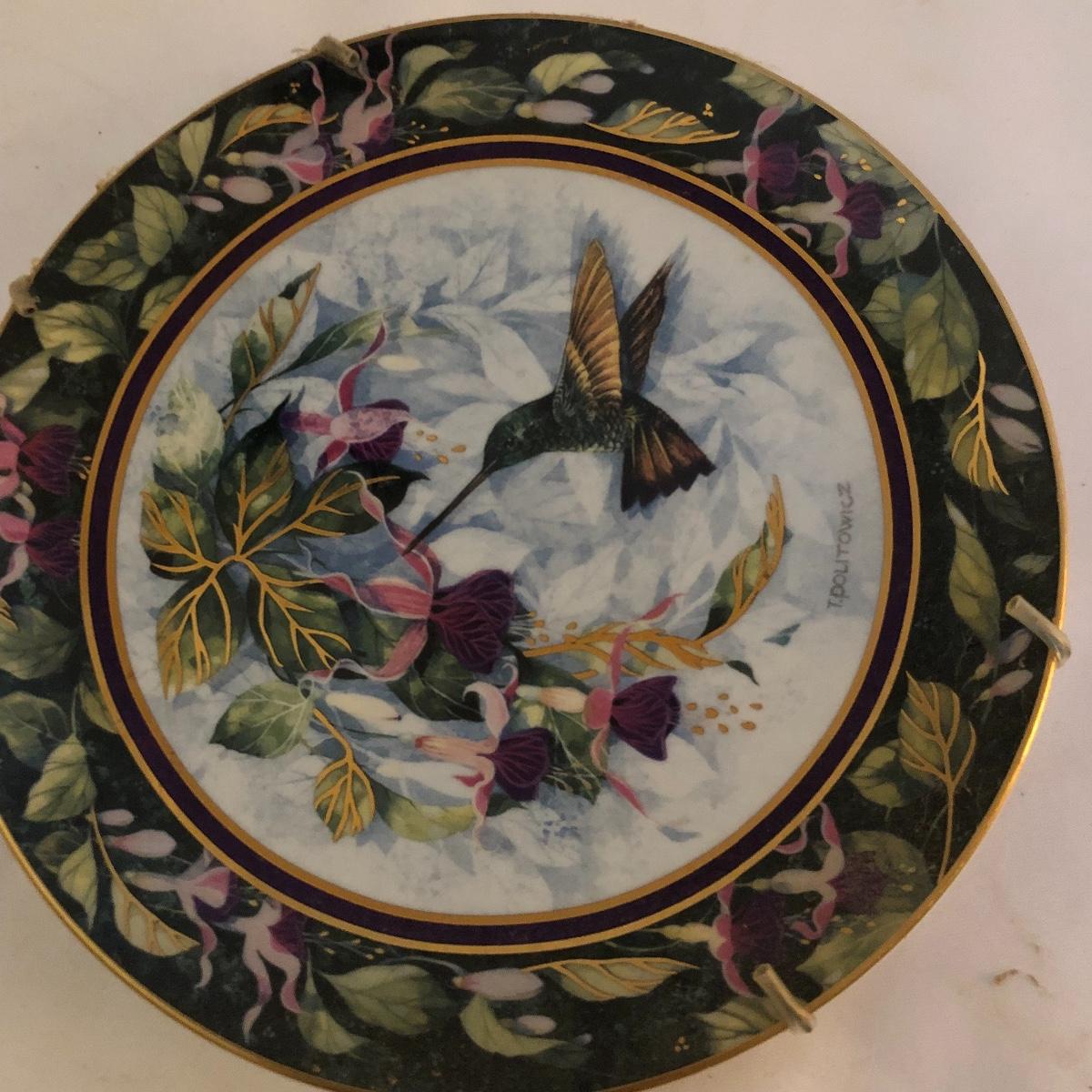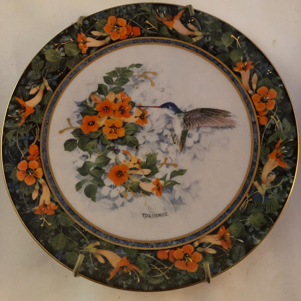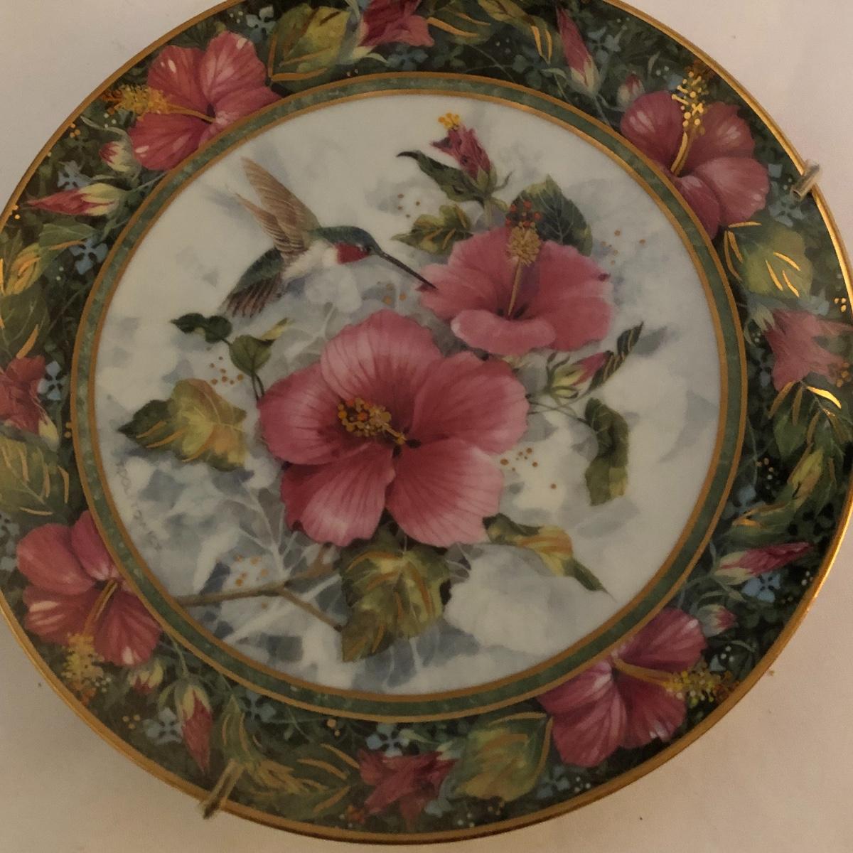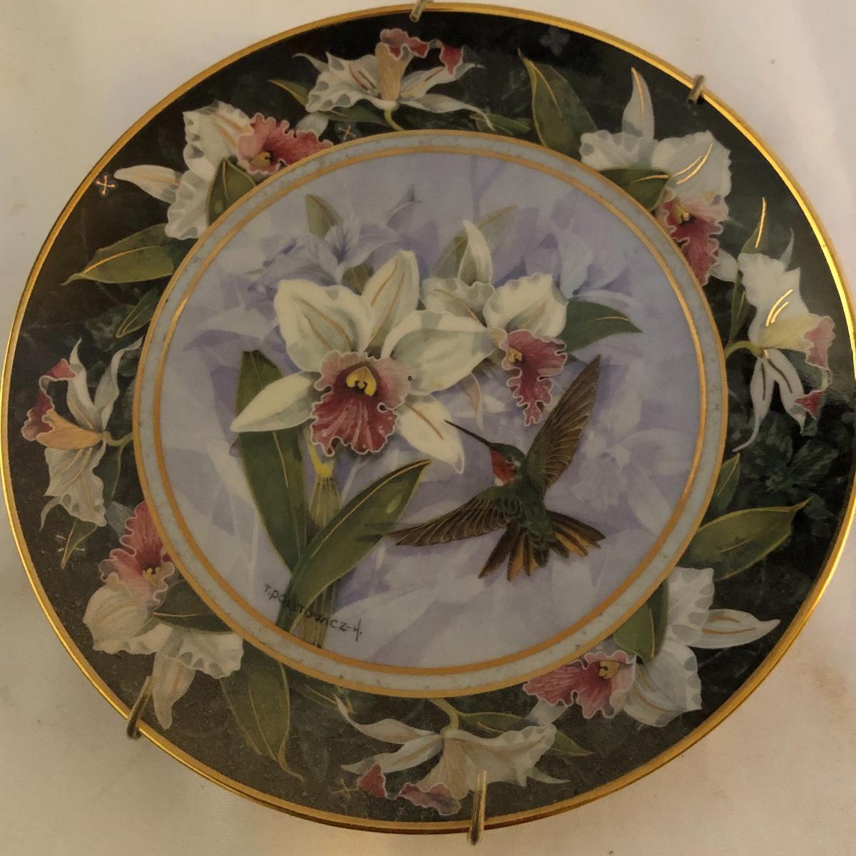 Decorate your home while paying homage to the small and mighty hummingbird. Each signed plate is a piece of art with vivid colors and gold edged! This lot contains twelve plates - all equipped with plate hangers and different scenes with hummingbirds! Each plate measures 8” in diameter. Shipping Available.