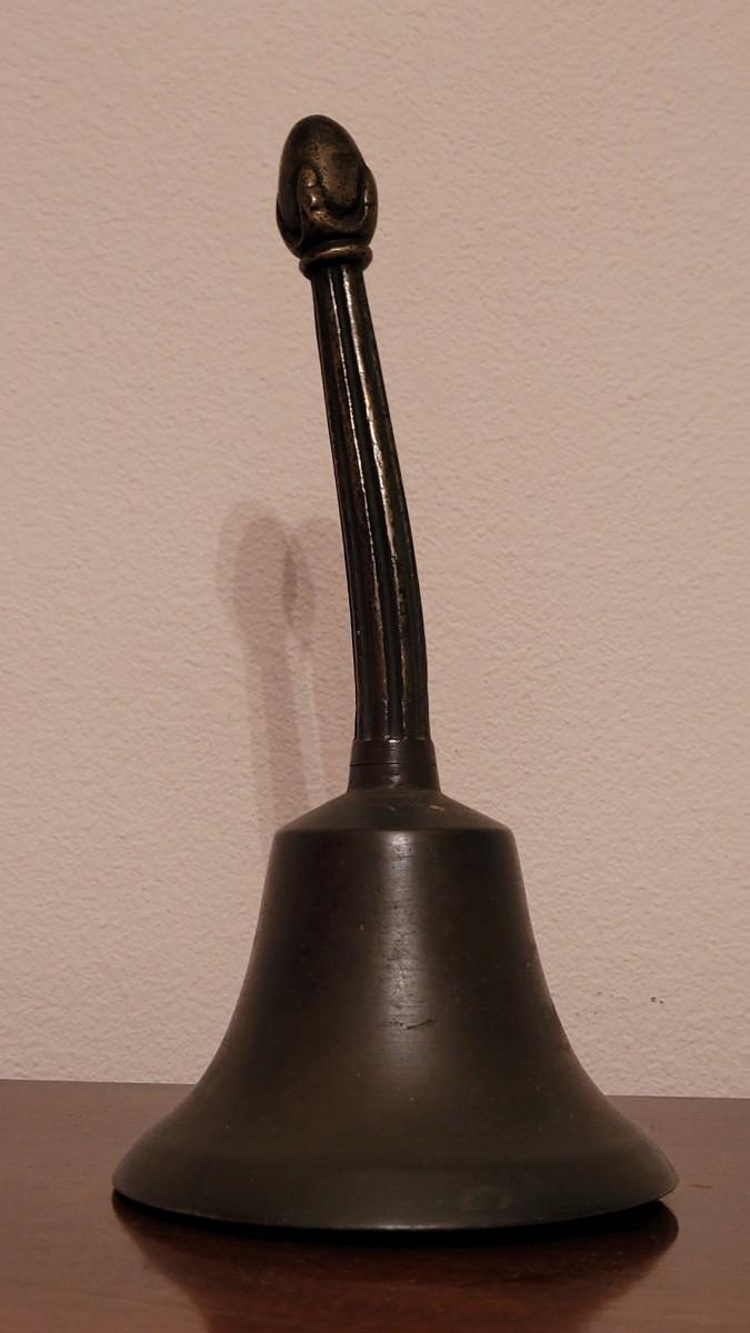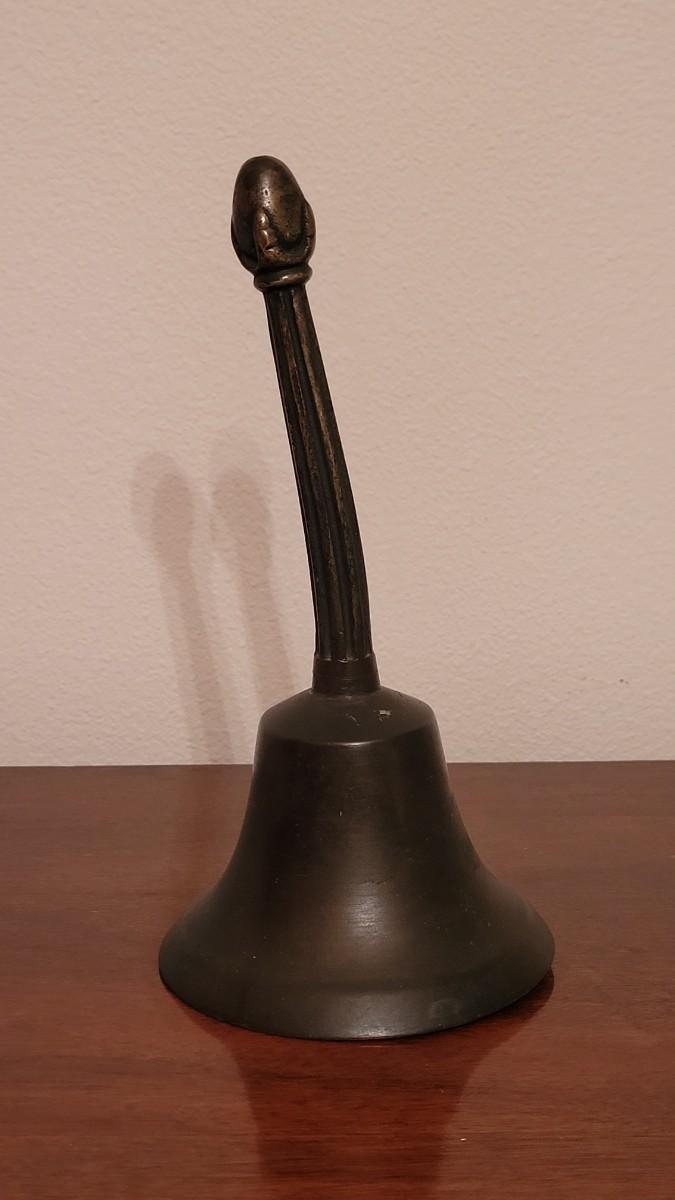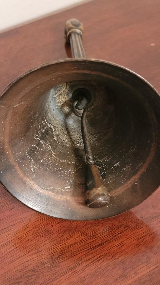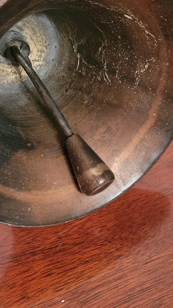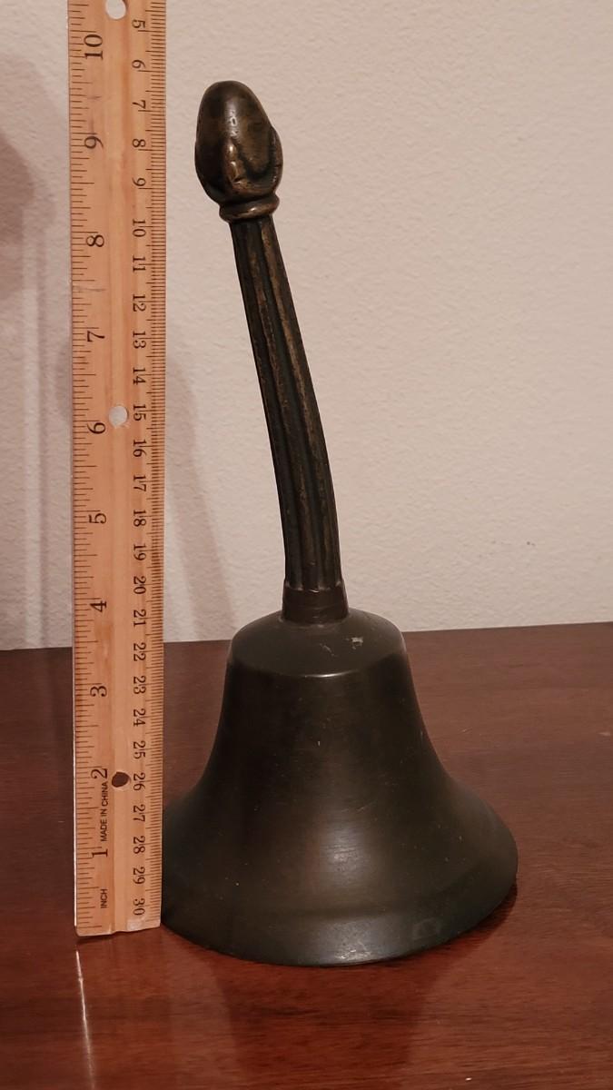 The handle is brass and the bell is copper. The handle has a curve. Nice and heavy.