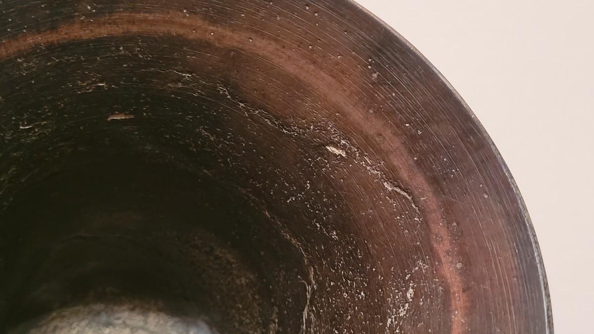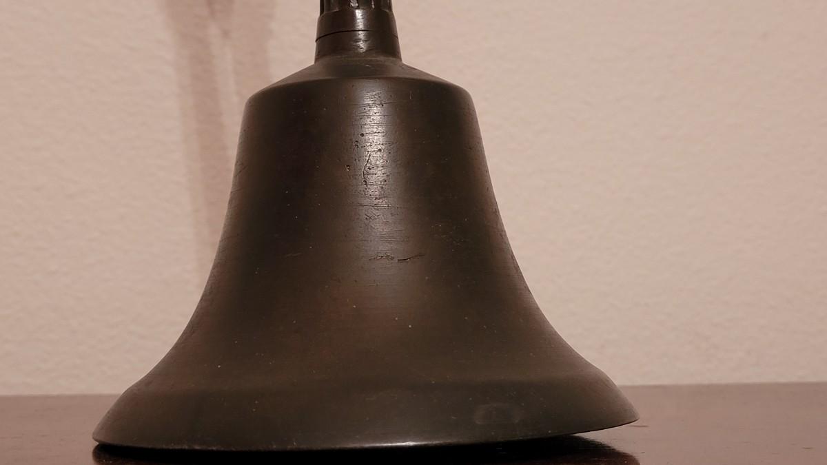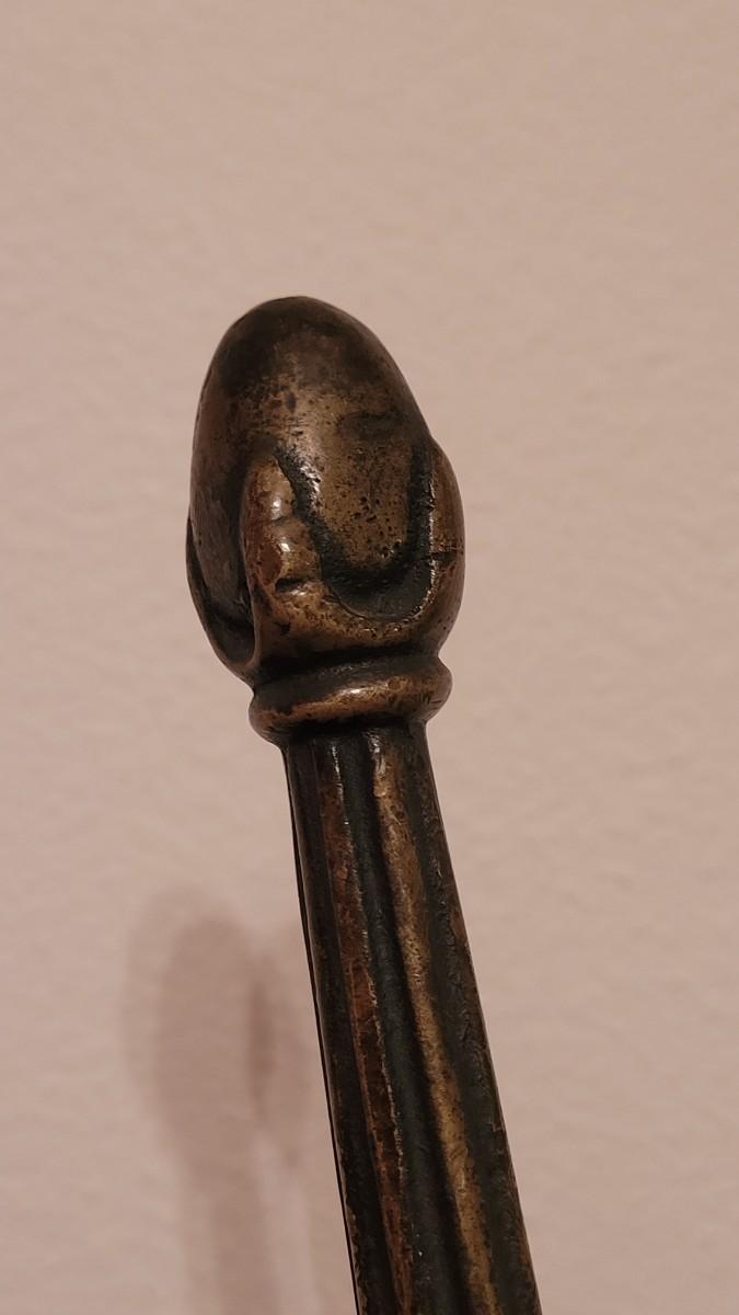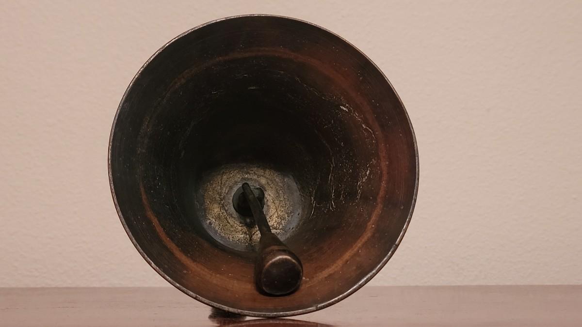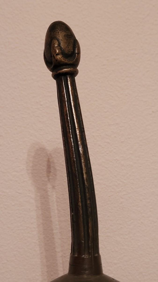 The handle is brass and the bell is copper. The handle has a curve. Nice and heavy.