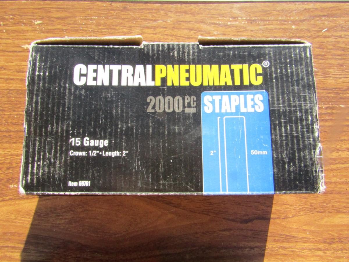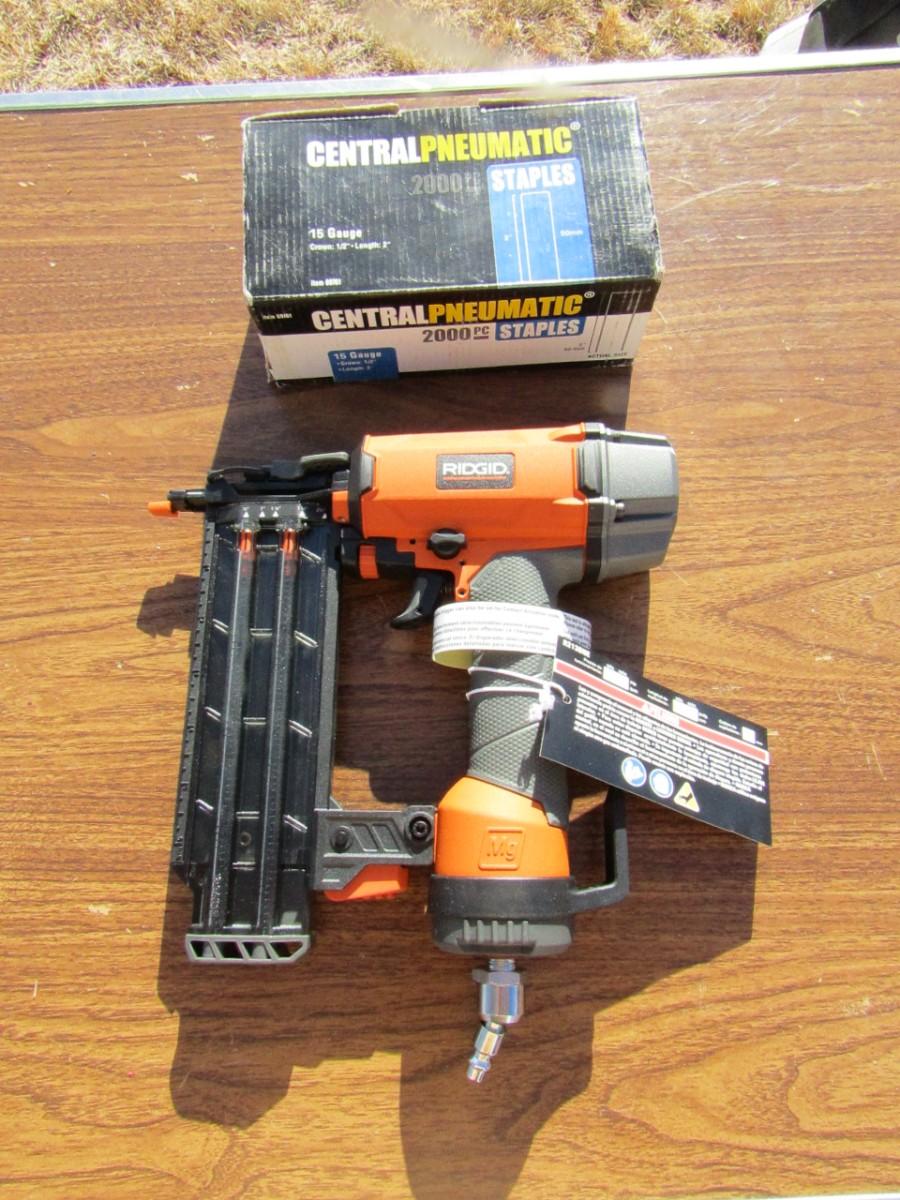 RIDGID 18 GAUGE AIR NAIL GUN AND A BOX OF 15 GAUGE STAPLES