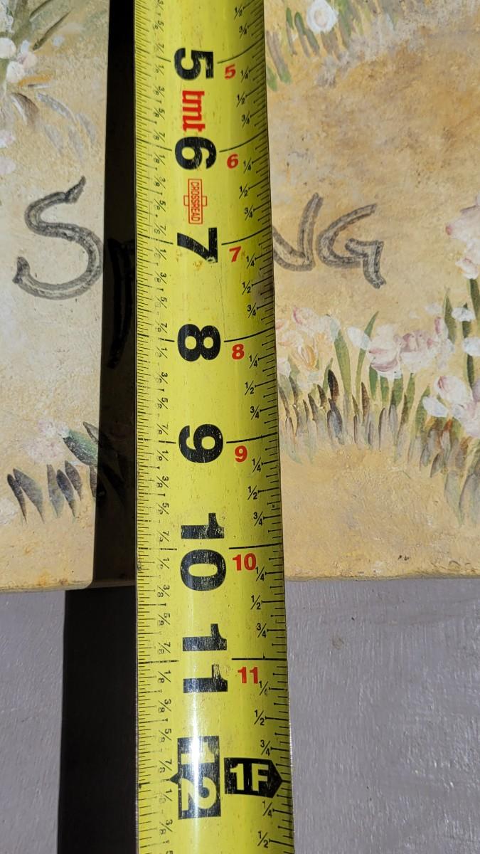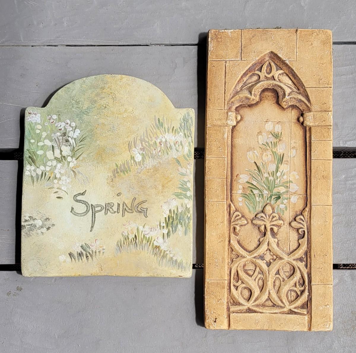 These garden plaques have handpainted flower details. They have been displayed on porches.