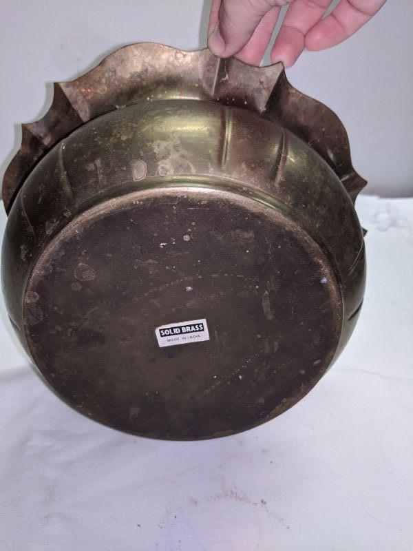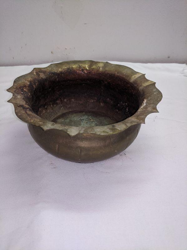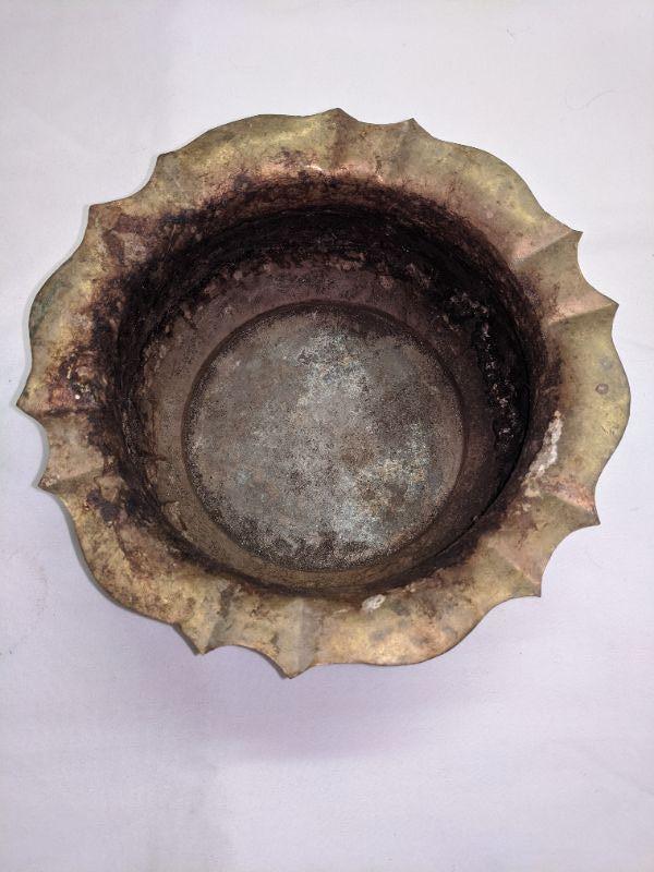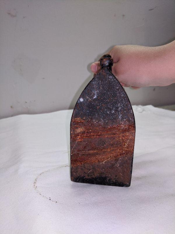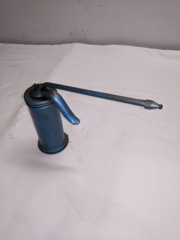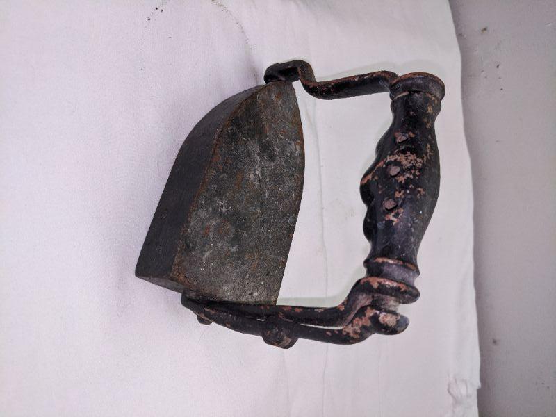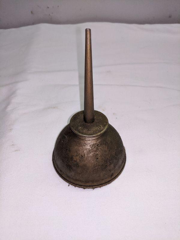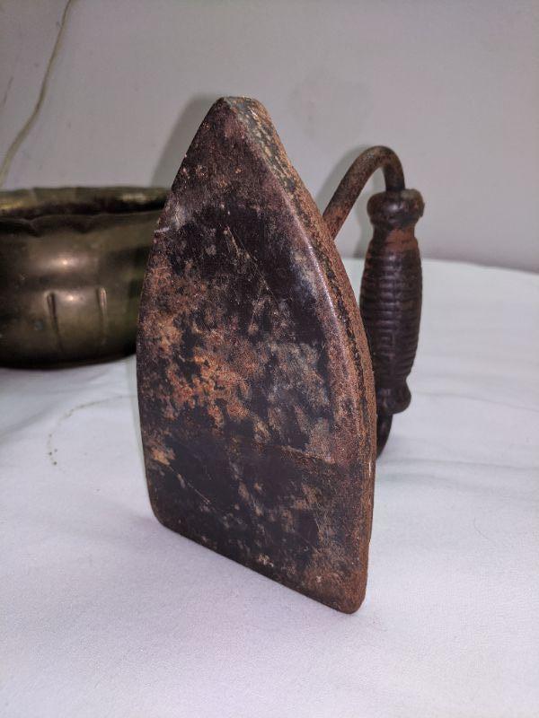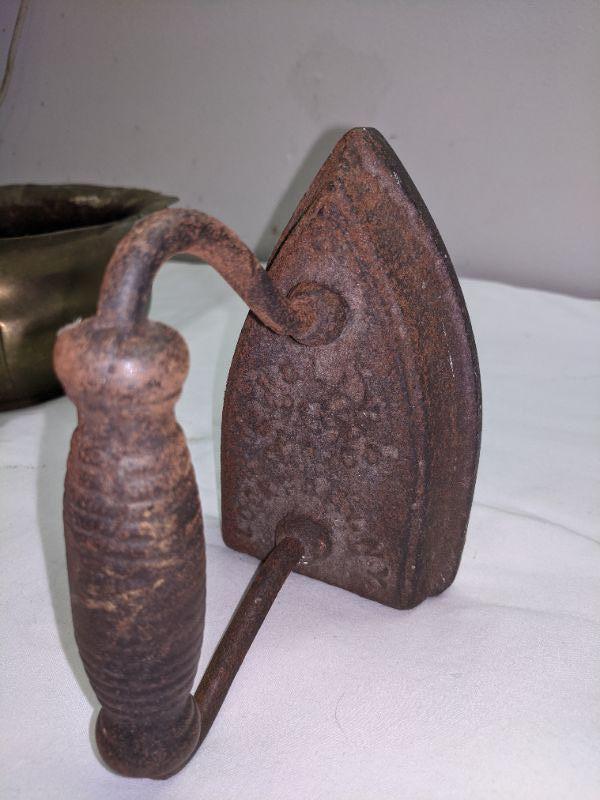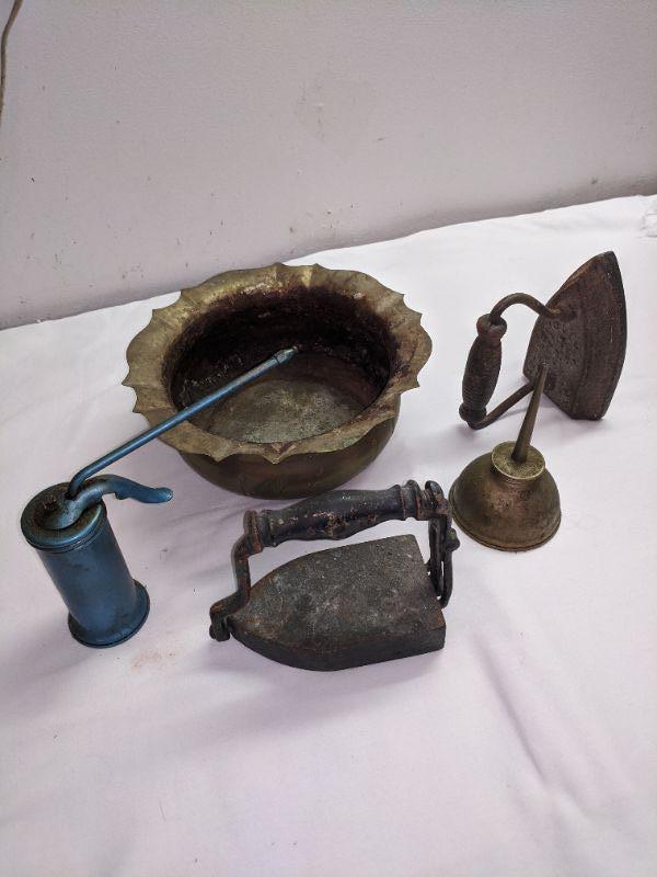 Fun antique metal lot with two heavy irons (3.5x6 inches) a brass planter (10 inches) and two oil cans (the blue can has liquid in it). There is rust on both irons and the planter. Use the irons as a door stop of fun decor! Shipping available.