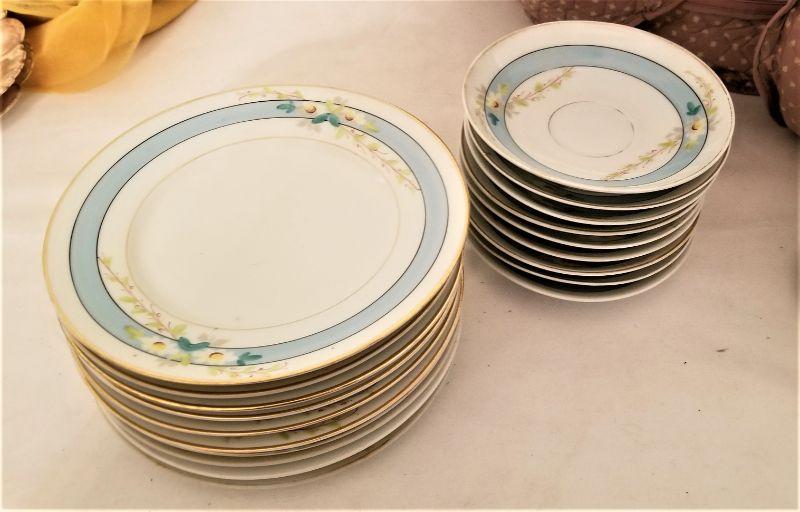 You get all you see here - Teapot, Creamer, Sugar with lid, 2 platters, waste bowl, 4 cups (one a bit discolored), 9 saucers and 10 plates. Good antique condition. Teapot is 9.5" tall, Platter 11.5" across. Old Paris porcelain in a delicate pattern. Ca. 1850-1860.