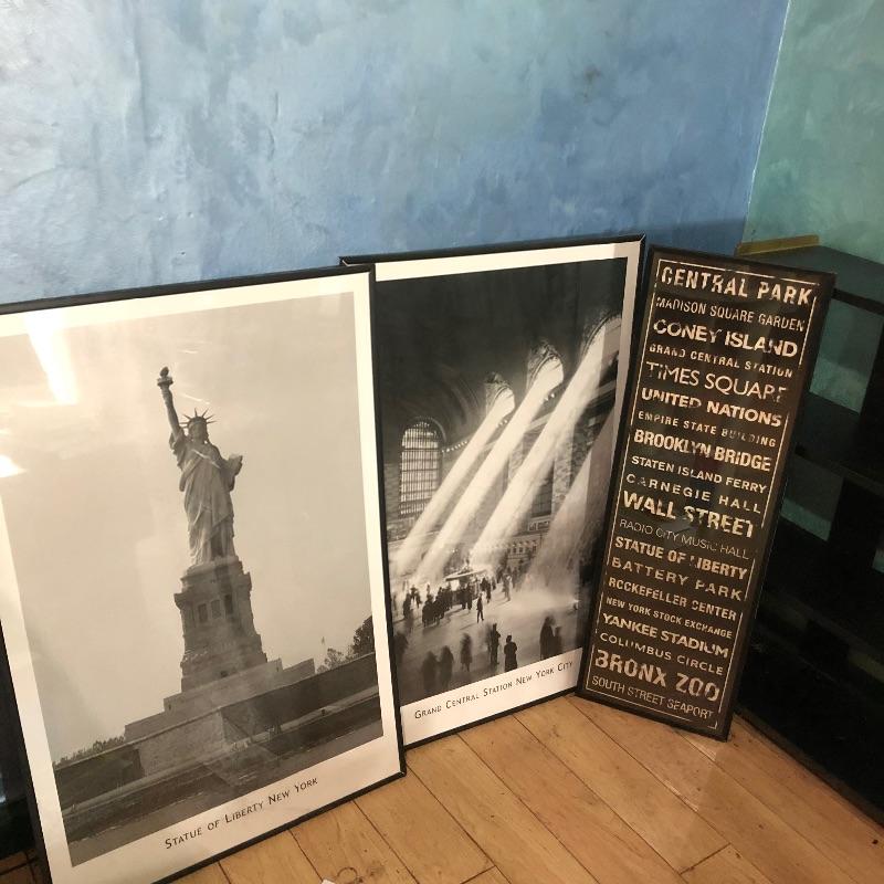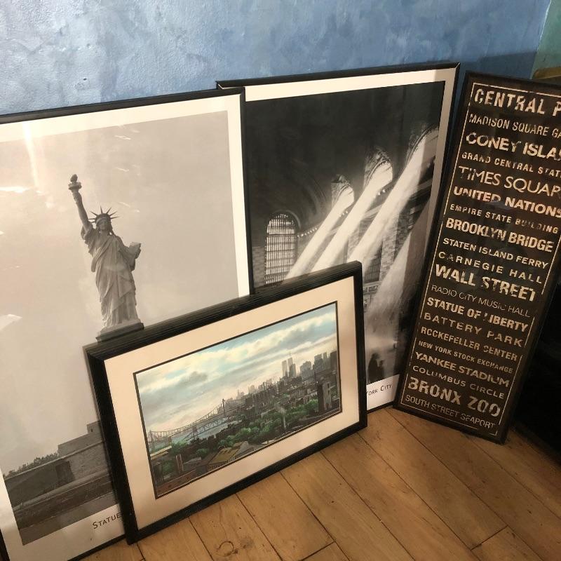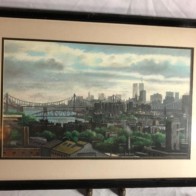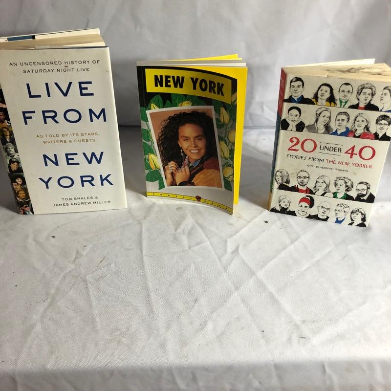 A great assortment of both art and books about the Big Apple. First we have a wooden framed, matted and signed print of the city, signature illegible, the year is 91, see image. This signed print measures 18.5” x 26.5”. Then we have two full sized metal framed posters and a third narrower one. The book assortment all have the big apple in common and celebrate it and also commemorate the fateful September 11th attacks,