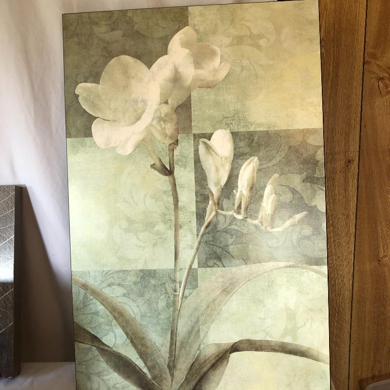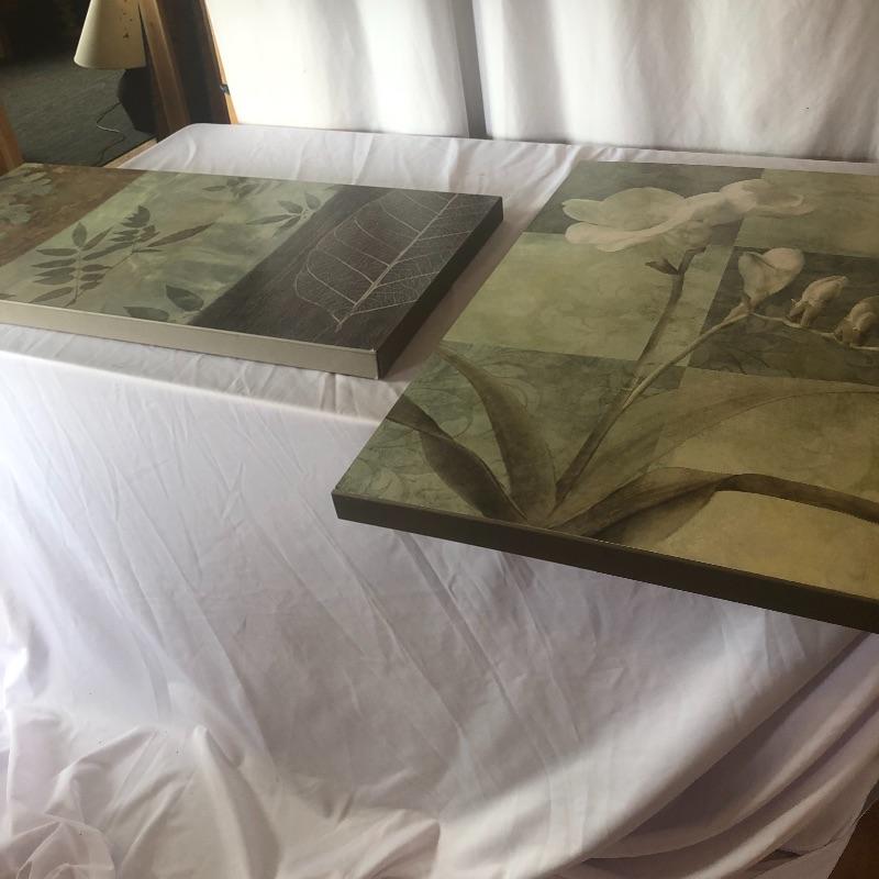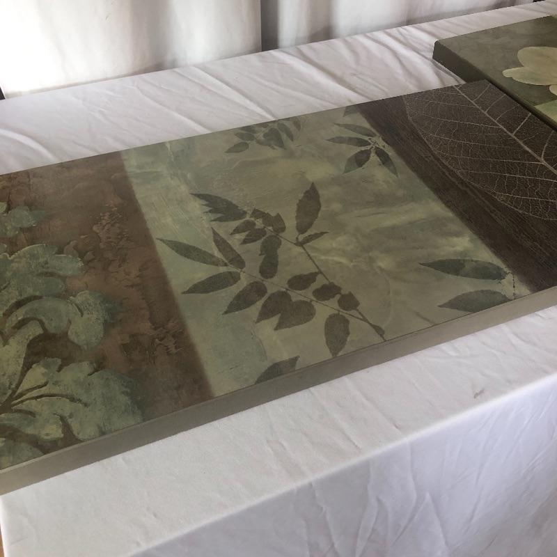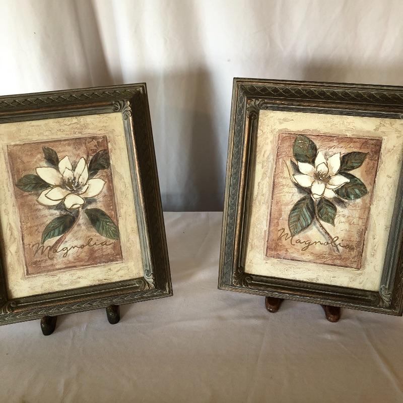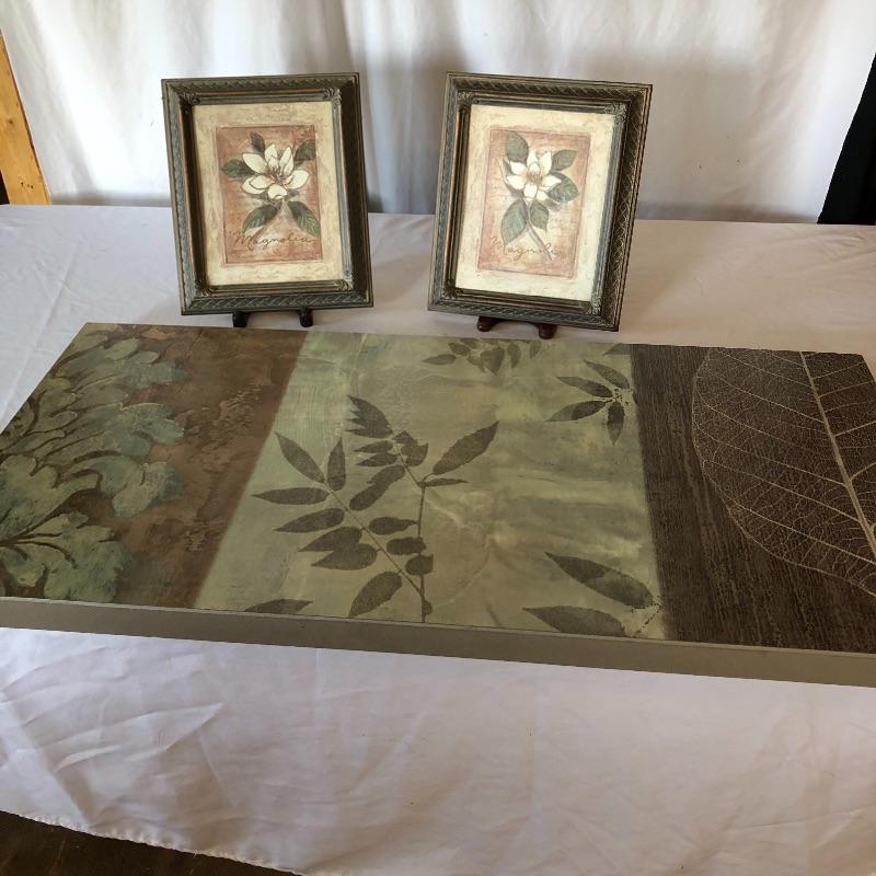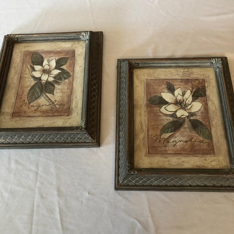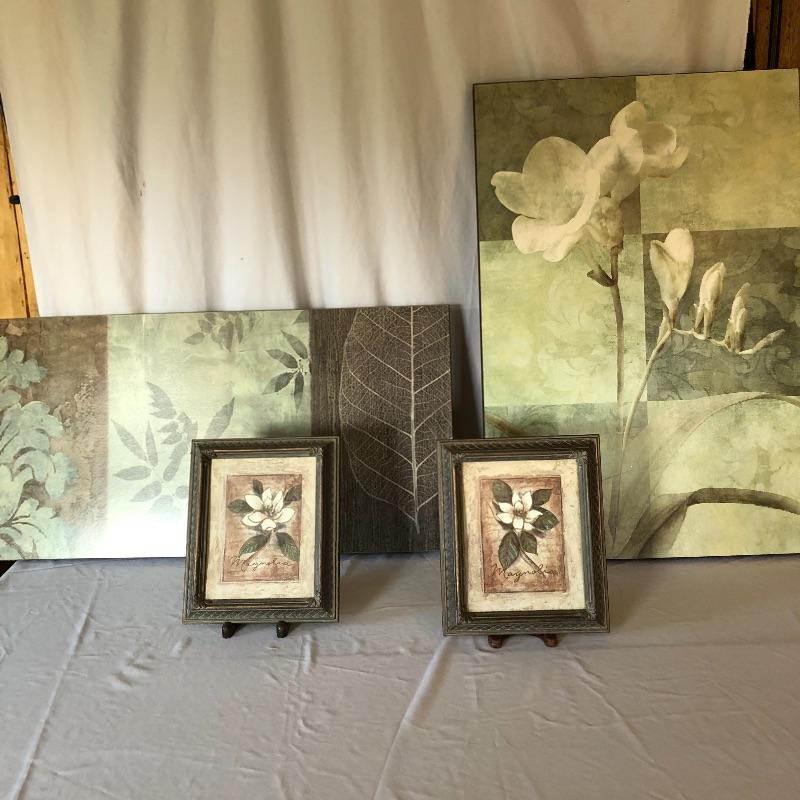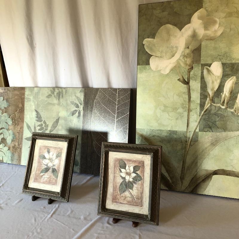 This lot includes two large botanical art pieces. The taller art measures 35.5” x 23.5” and the horizontal art piece is 39”X 19”. The two framed magnolia pictures are 12” x 10”. Local pick up only.