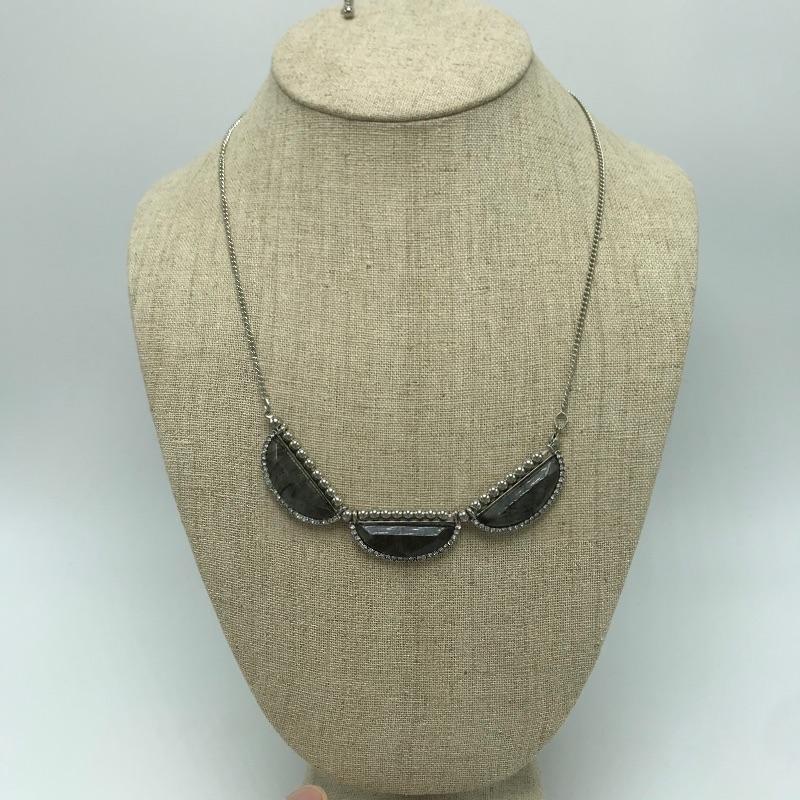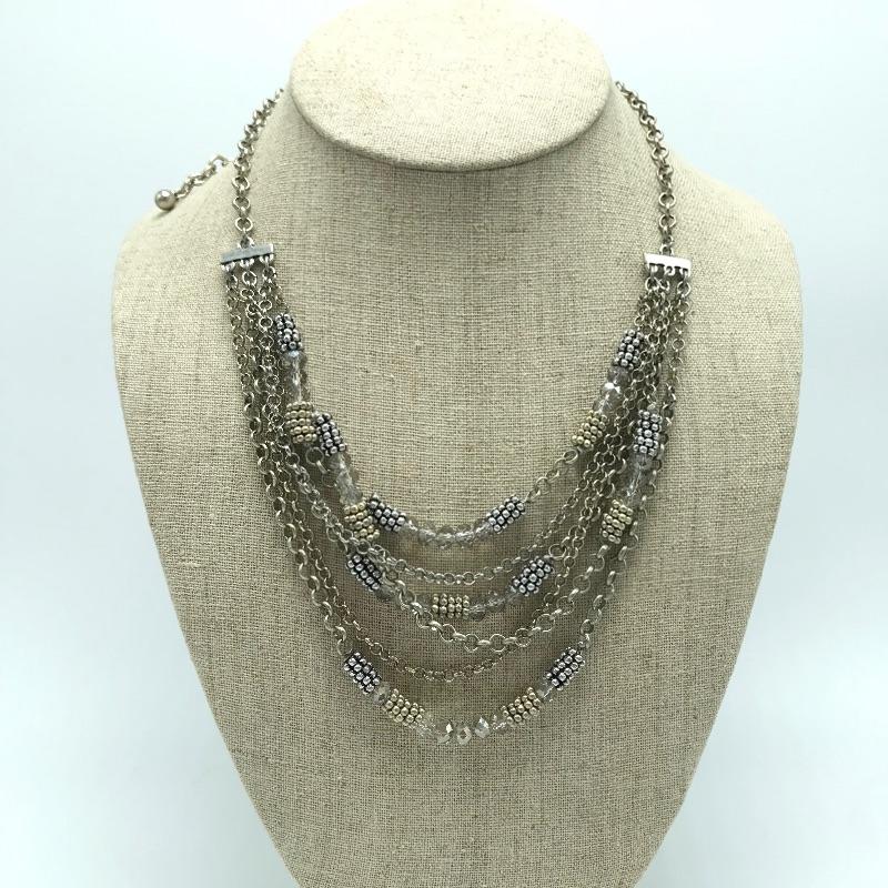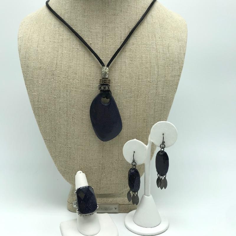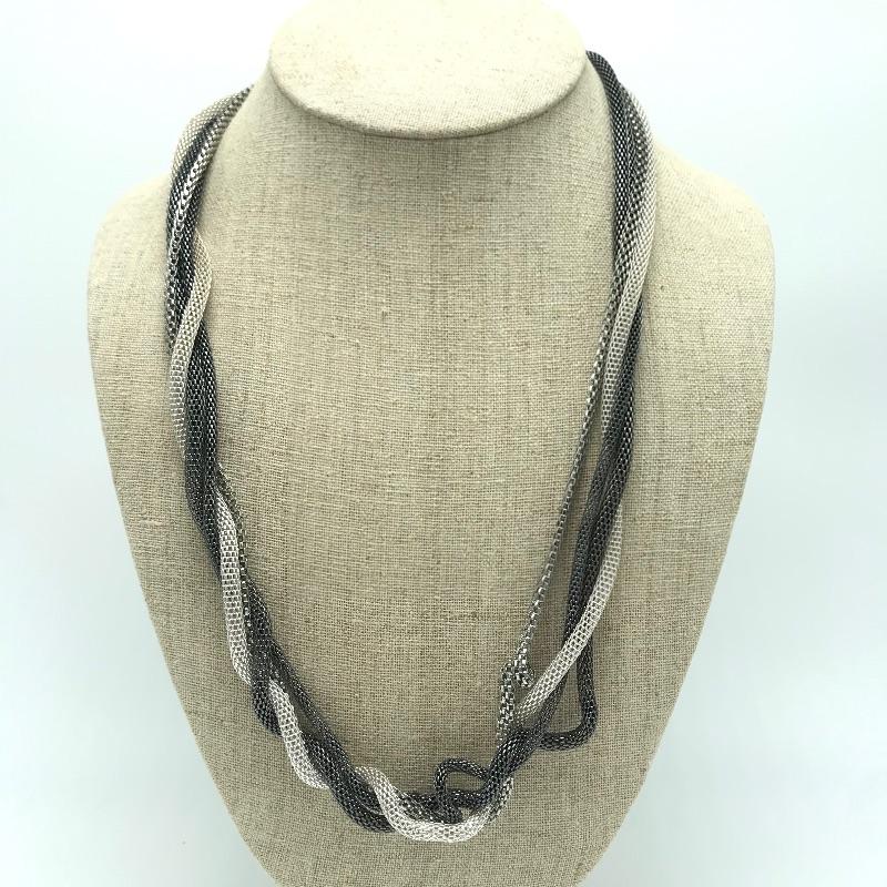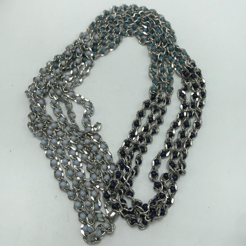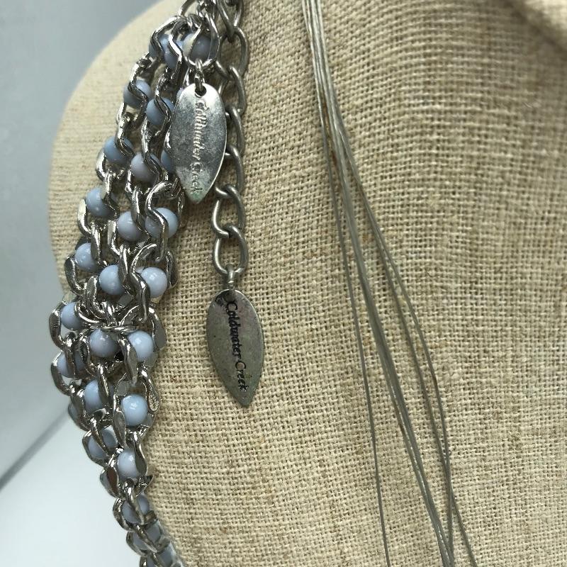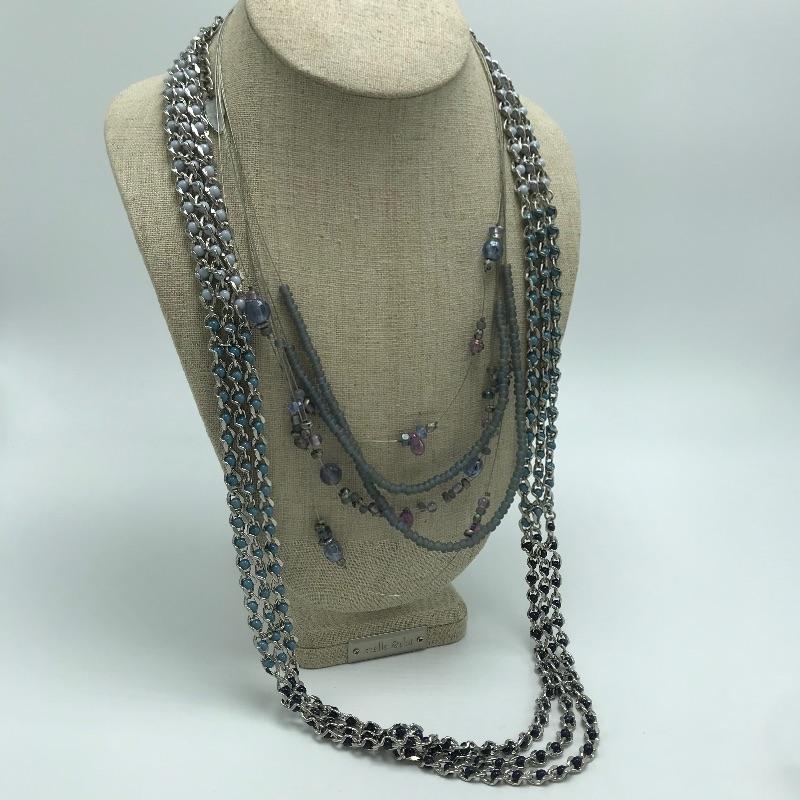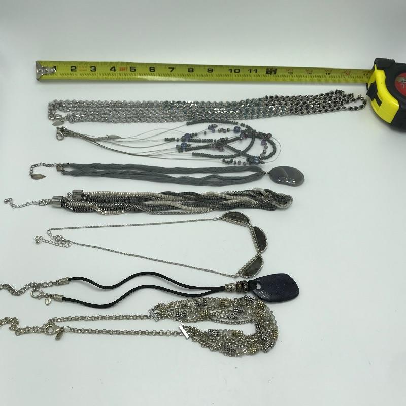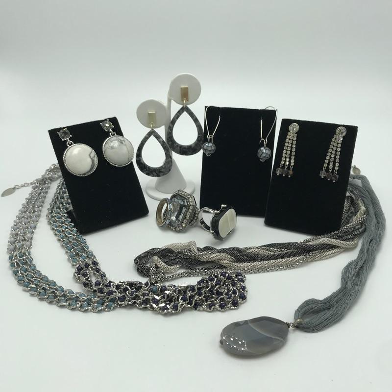 Nice gray toned jewelry collection. Some pieces marked Coldwater Creek, Chico’s and Express. Lot includes metals, stones, linen and wire cords and more. The Chico’s bronze colored ring is expandable. See photos.