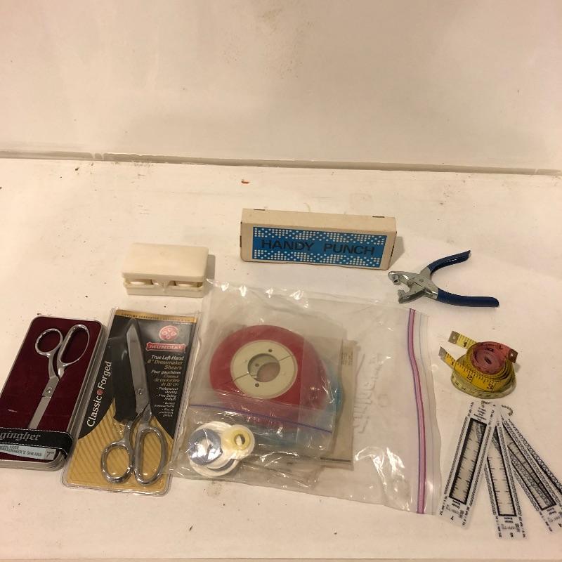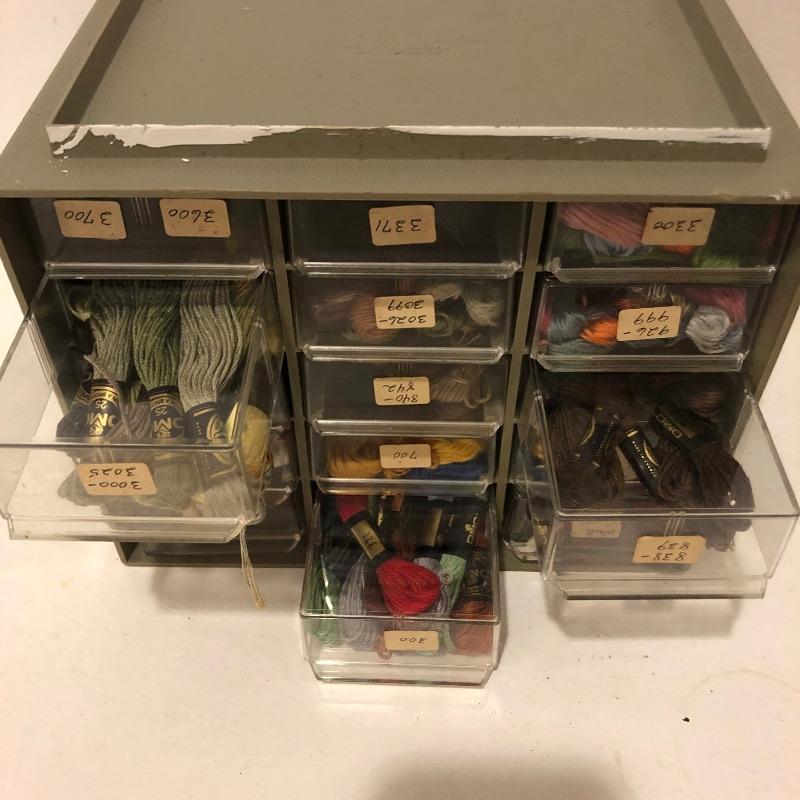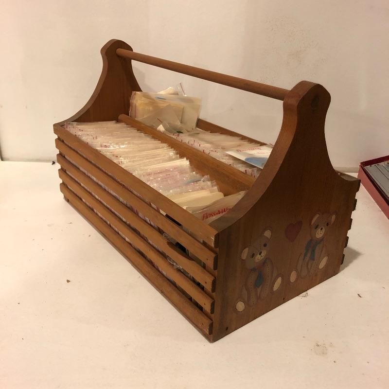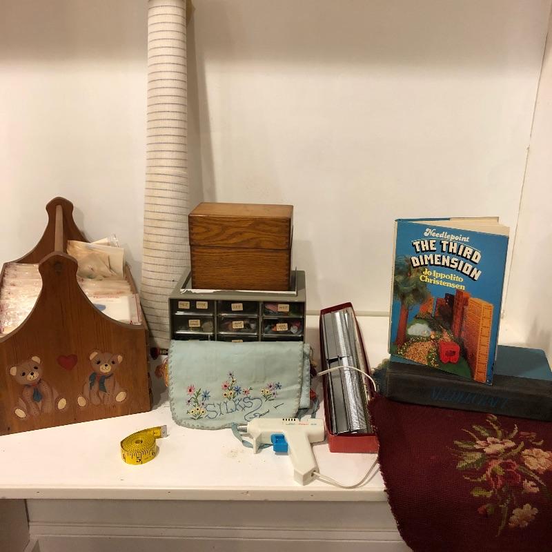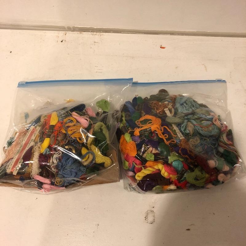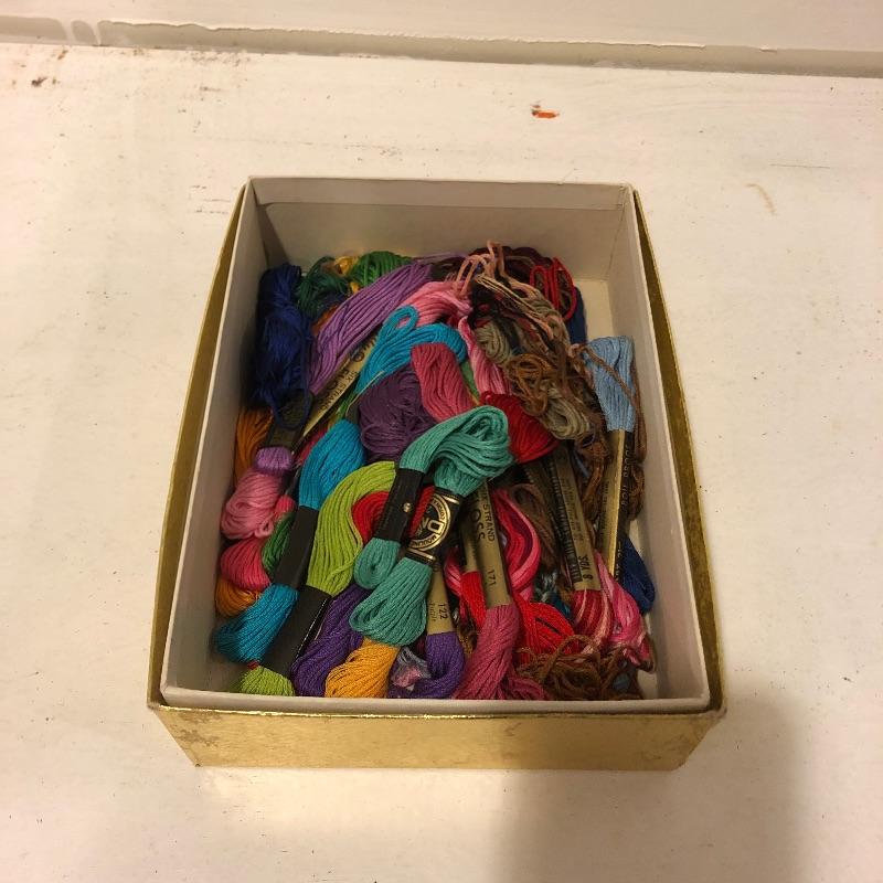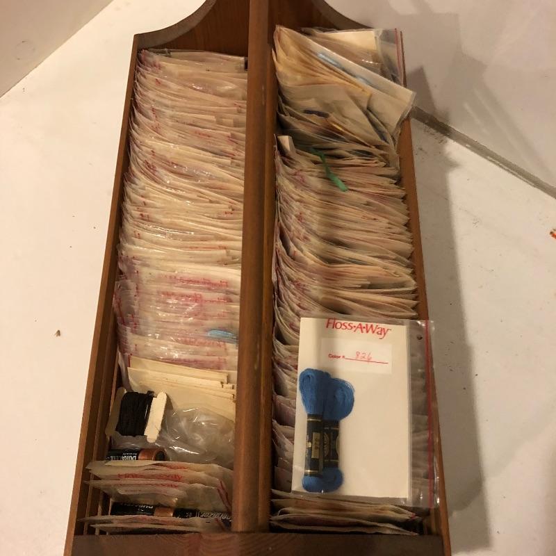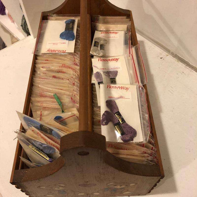 This is a humongous lot of both cross stitch and embroidery items. The wooden slatted box is completely full of floss and there is almost double that amount elsewhere in this lot; it measures 9.5” deep x 17.5” wide x 11” tall. There is too much to list so take a look at the images; to name but a few of the things included - patterns, books, cross stitch fabric, dress maker scissors, punches, low temp glue gun, garter bar and much more.