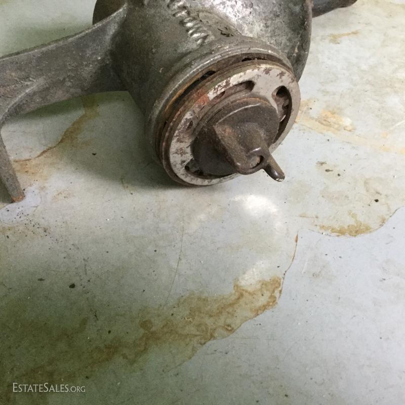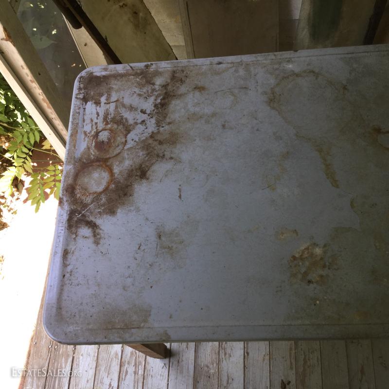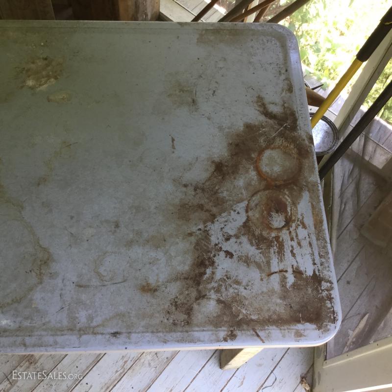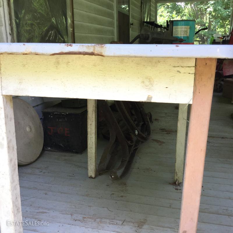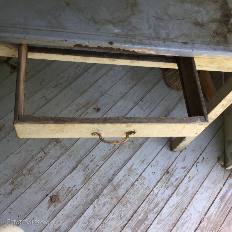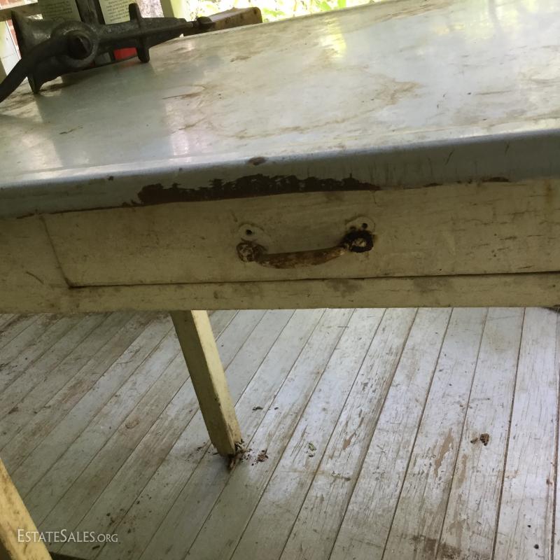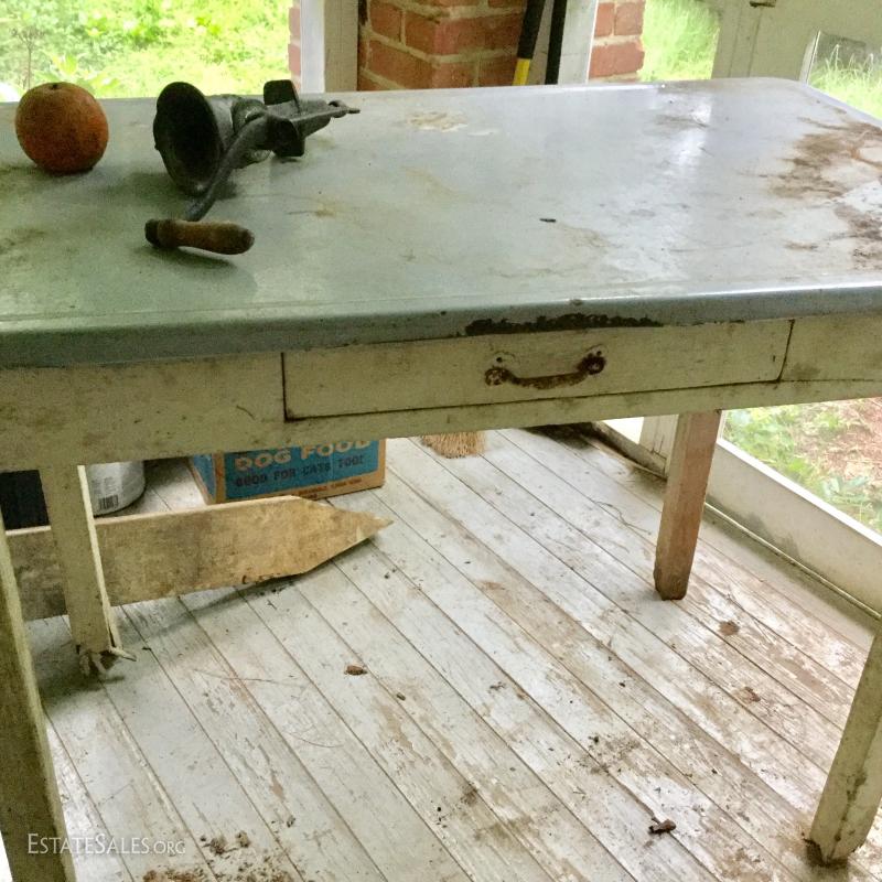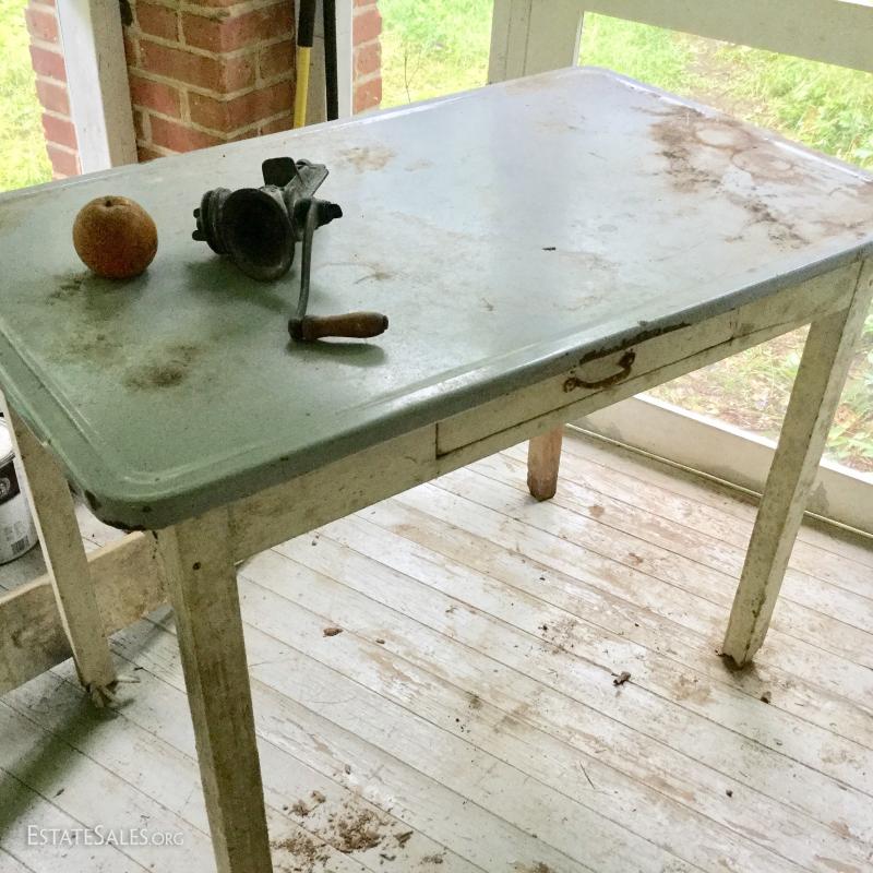 Cute table needs TLC. Table legs are rotted at the bottom. Drawer is missing bottom. Also includes a Keystone meat grinder and decorative metal orange!. Table measures 40.5"l x 25"w x 30"h. Lot is available for local pick up only in Saluda, NC.