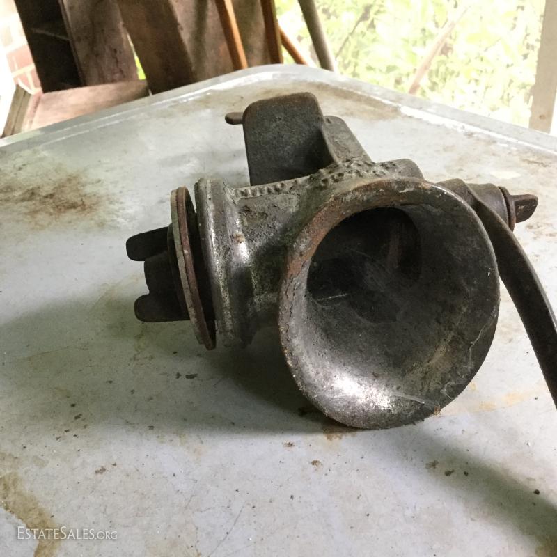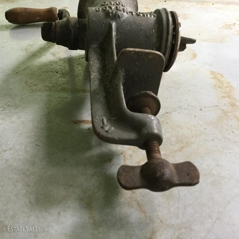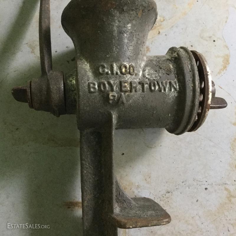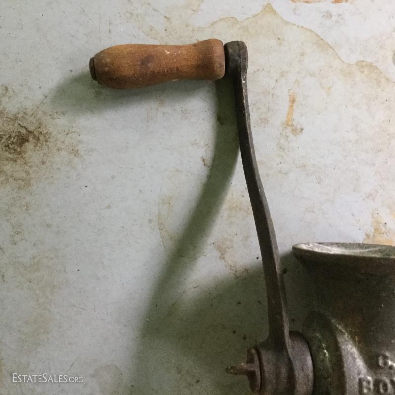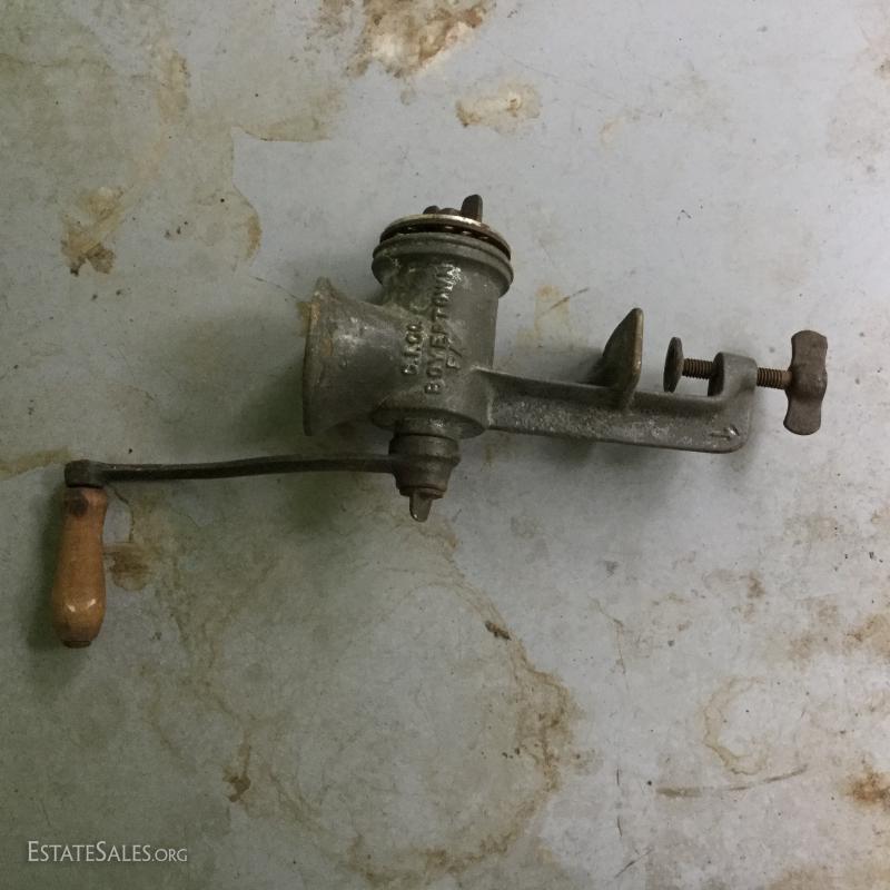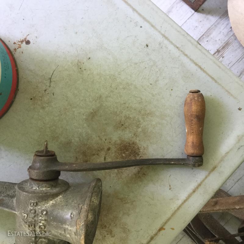 Lot 161: Enamel Top Table, Meat Grinder and Decorative Metal Orange