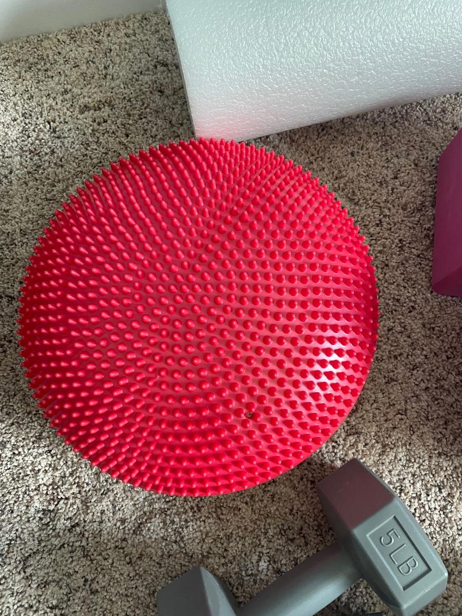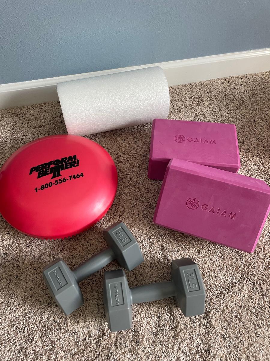 Pair of yoga blocks, a balance pad, a pair of 5 lb hand weights and a foam roller