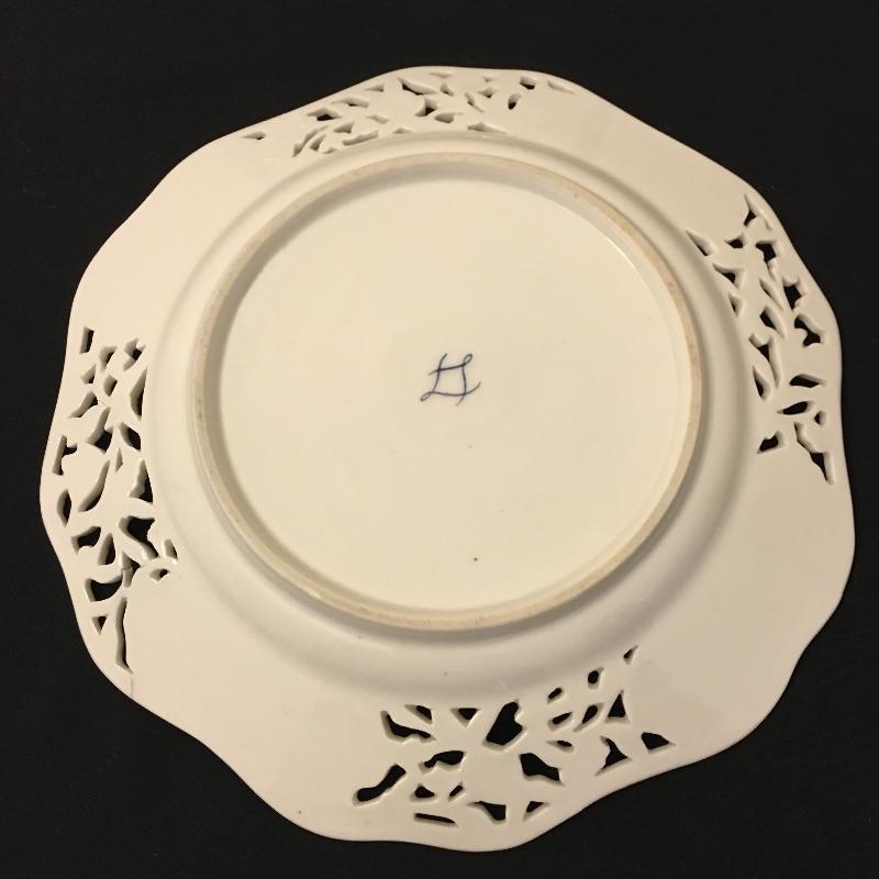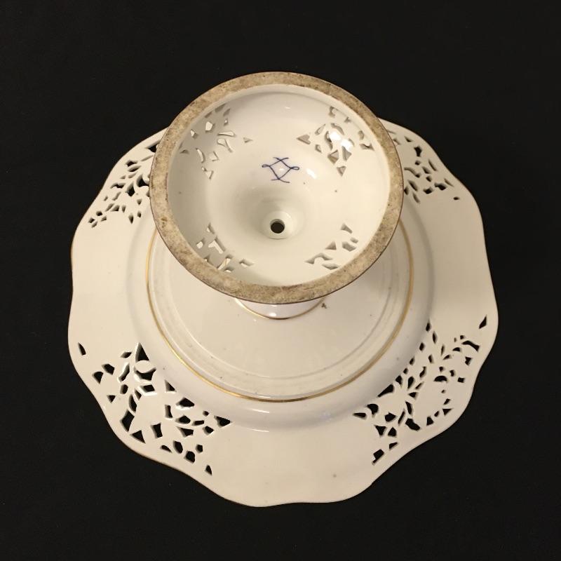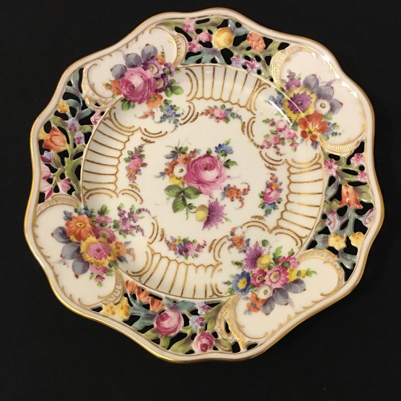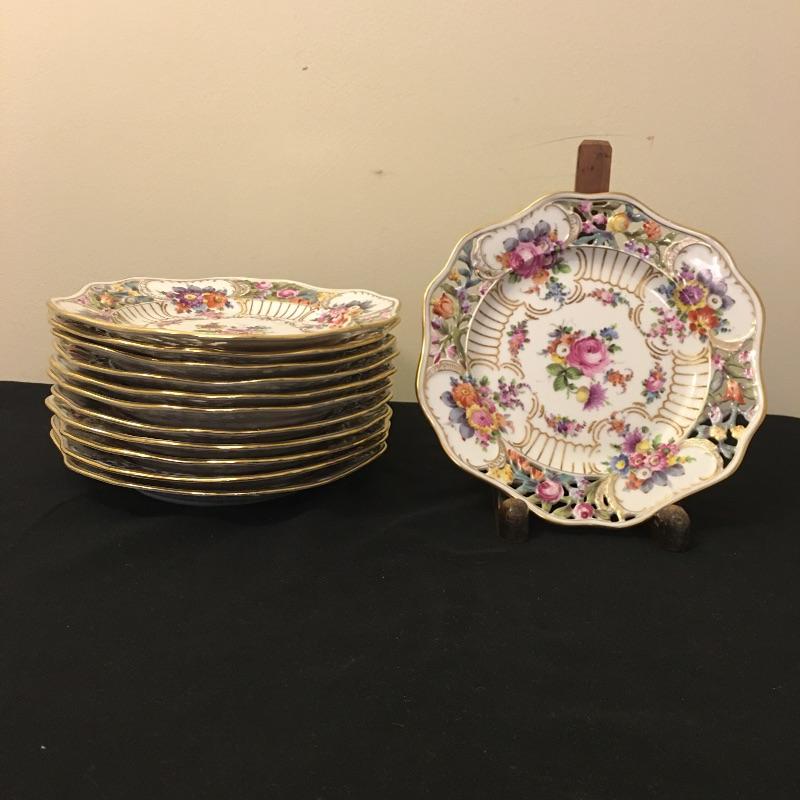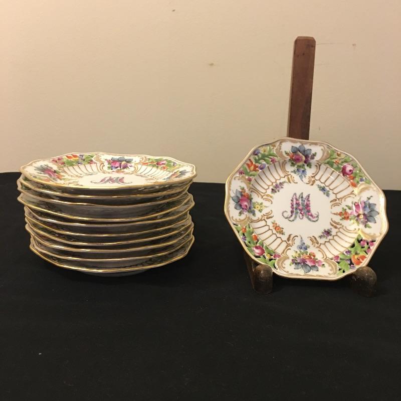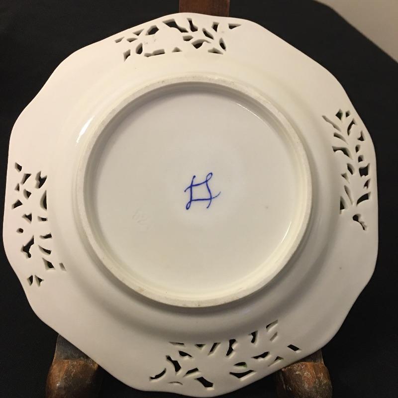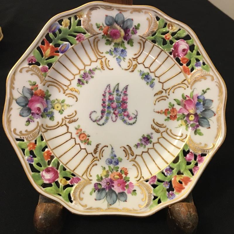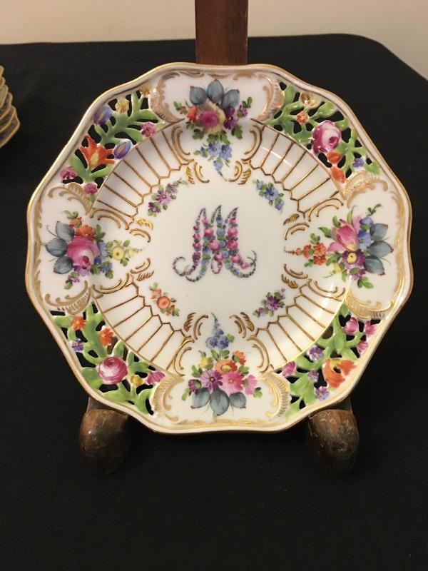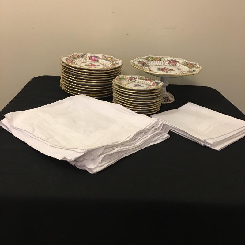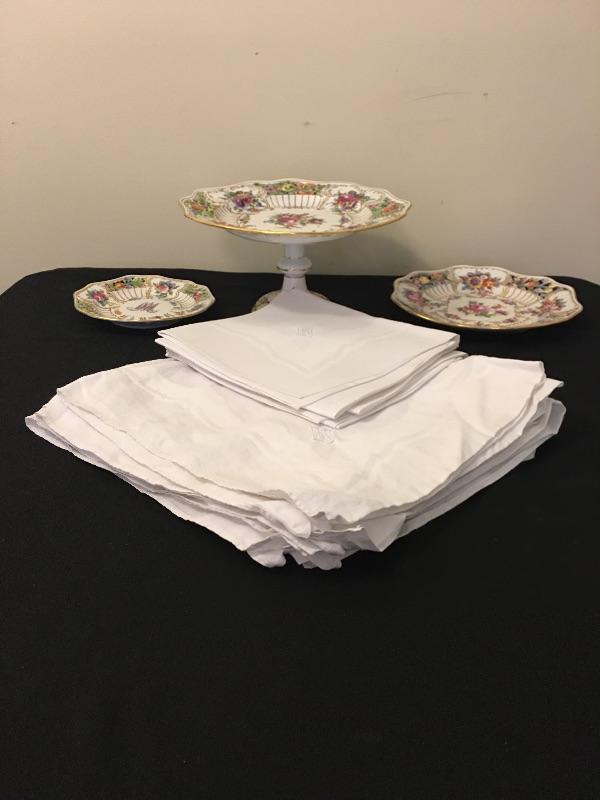 A unique collection of pierced china that includes twelve dinner plates, eleven small plates and a compote. Small plates have the letter M in middle. Also includes six large and four smaller monogrammed linens with the letter M. These are beautiful plates that appear to be hand painted with Gloria and accents. All items are signed, see pictures. Compote measures 10”D x 5” tall.