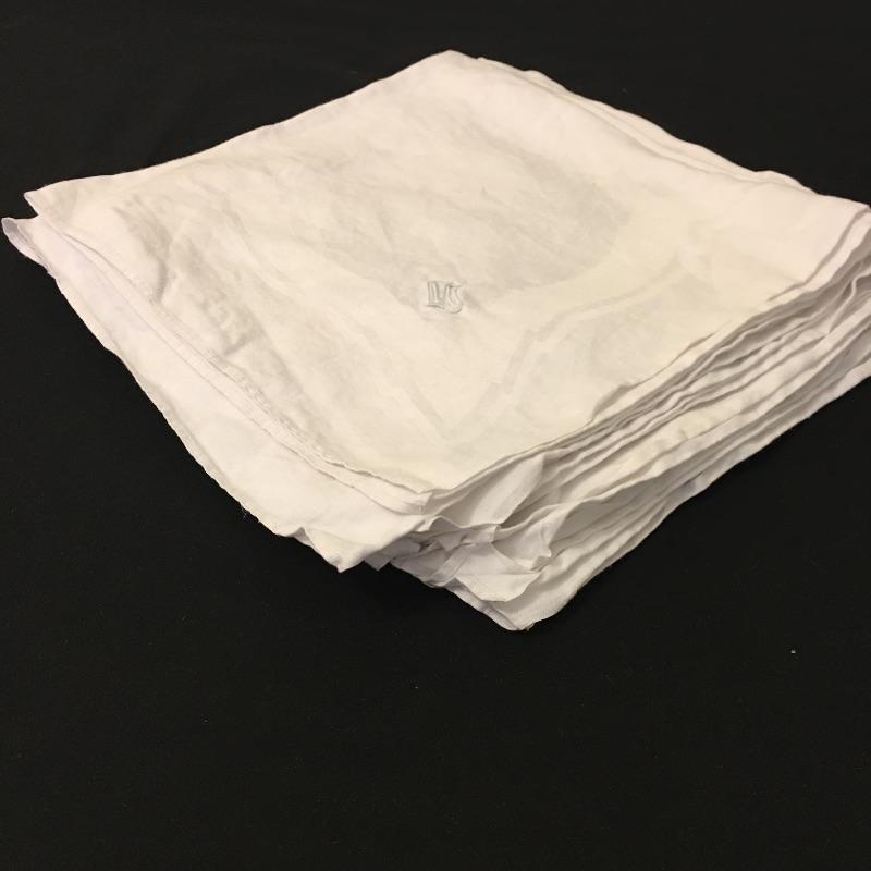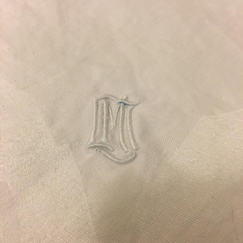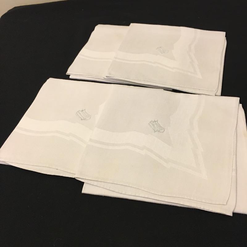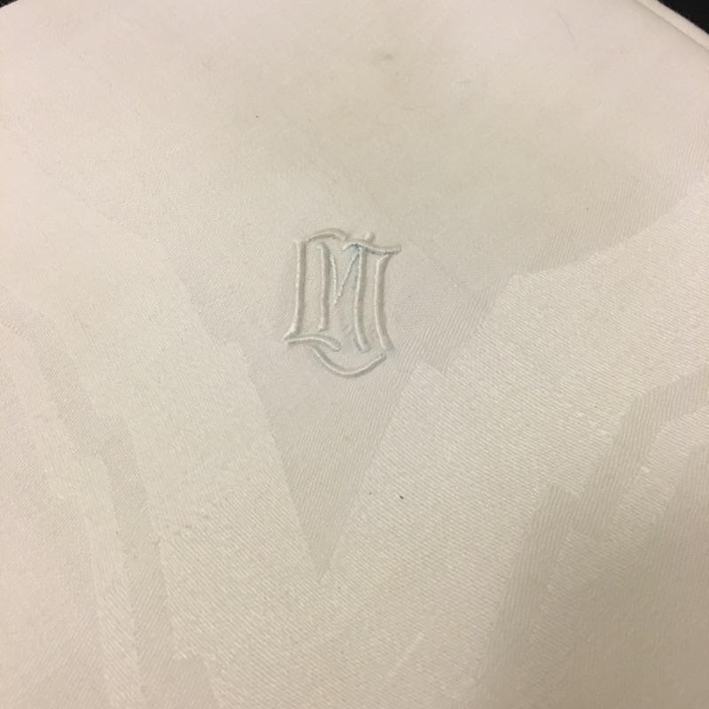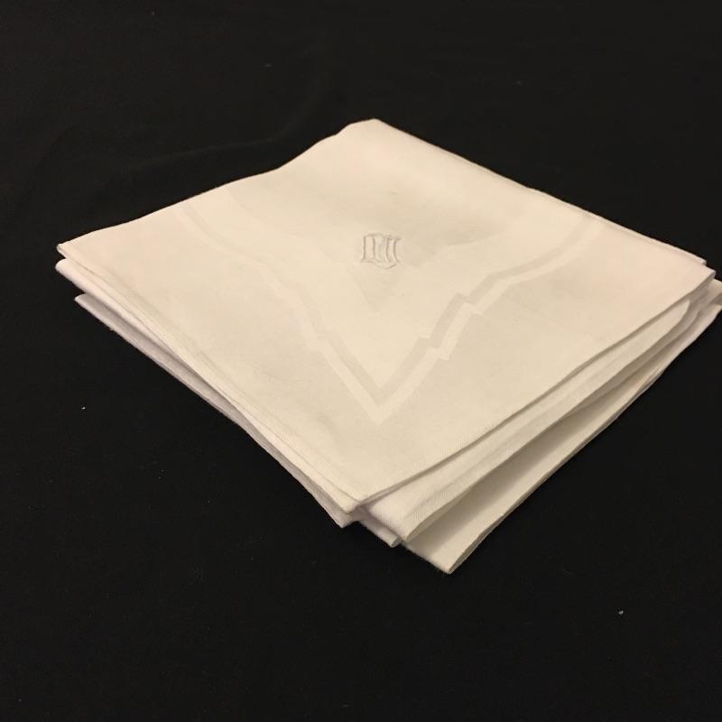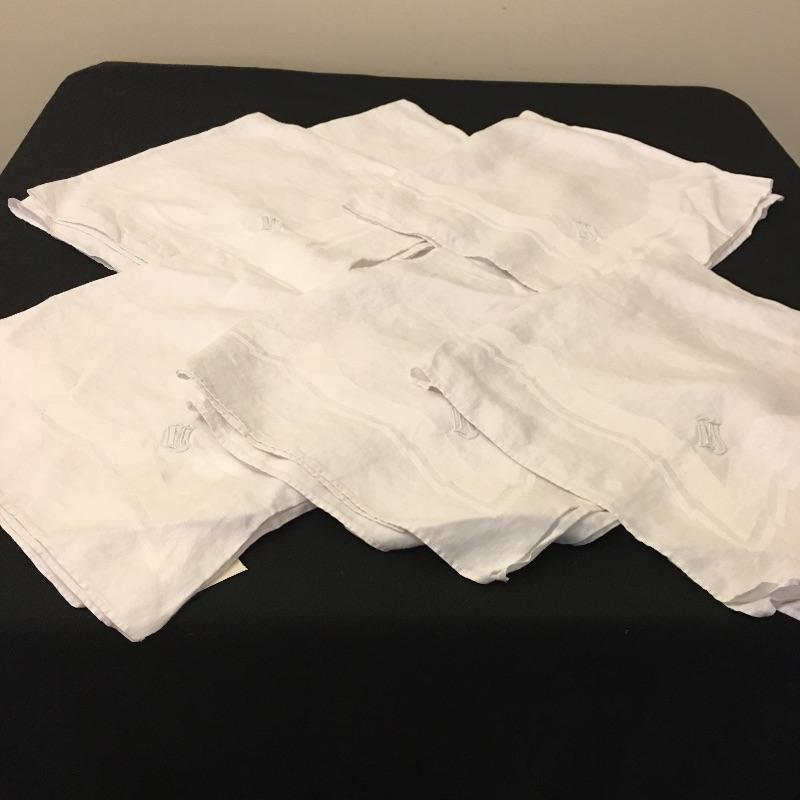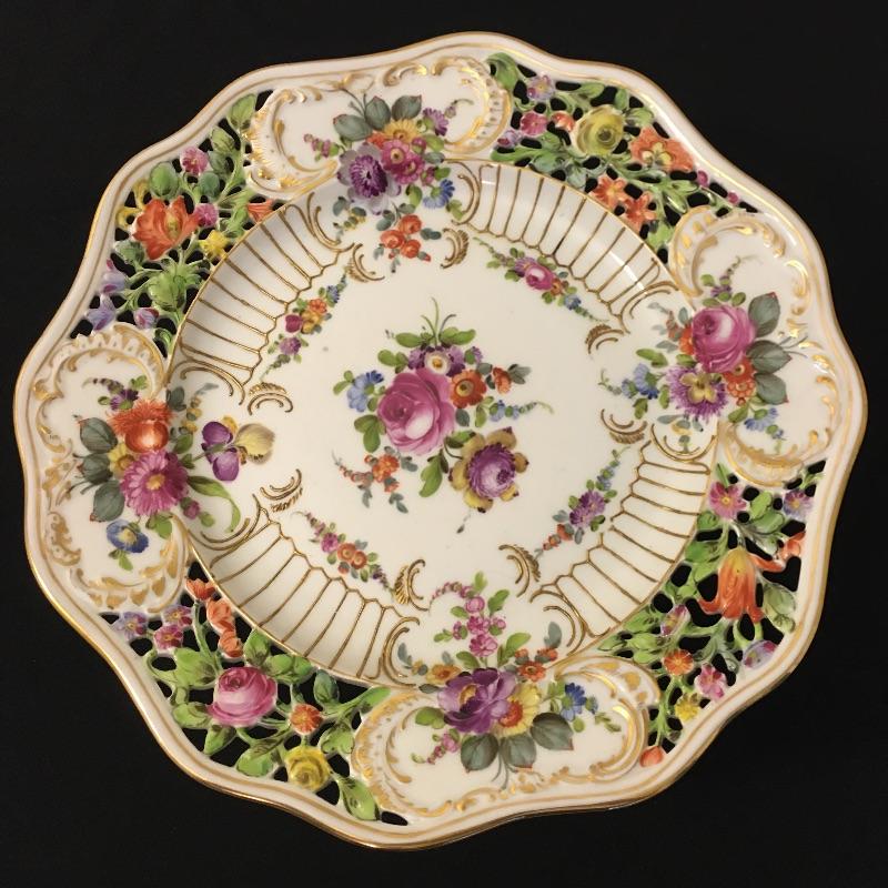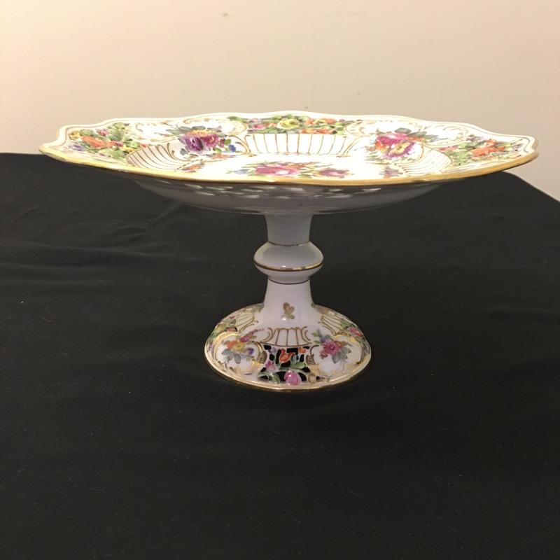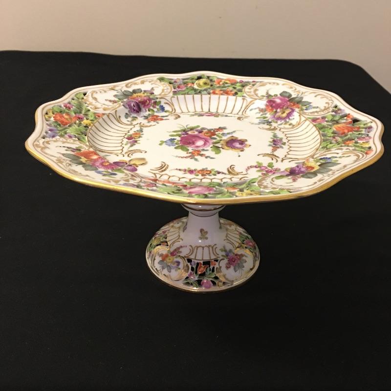 A unique collection of pierced china that includes twelve dinner plates, eleven small plates and a compote. Small plates have the letter M in middle. Also includes six large and four smaller monogrammed linens with the letter M. These are beautiful plates that appear to be hand painted with Gloria and accents. All items are signed, see pictures. Compote measures 10”D x 5” tall.