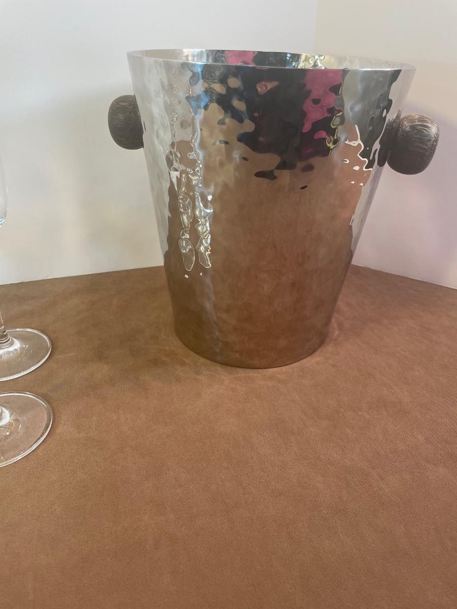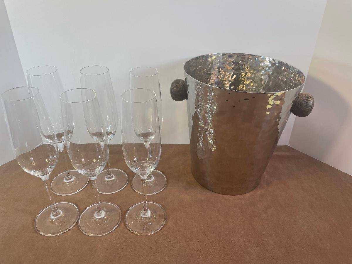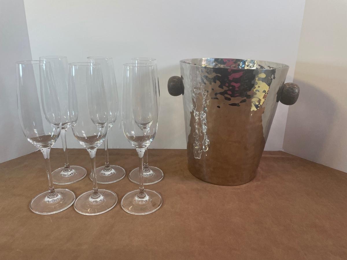 Lot 161. Hammered Metal Ice Bucket and Champagne Flutes