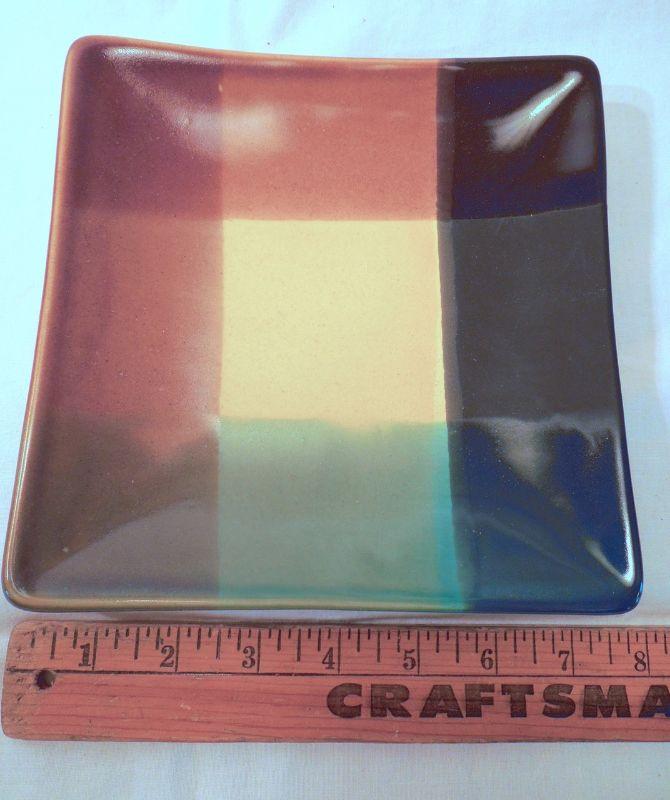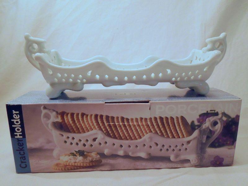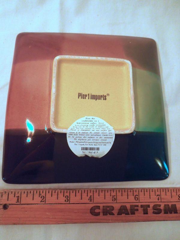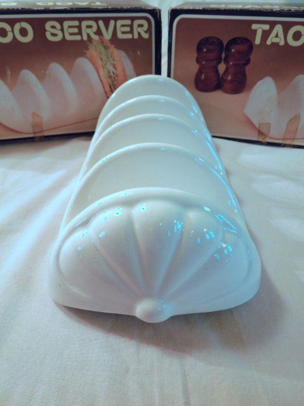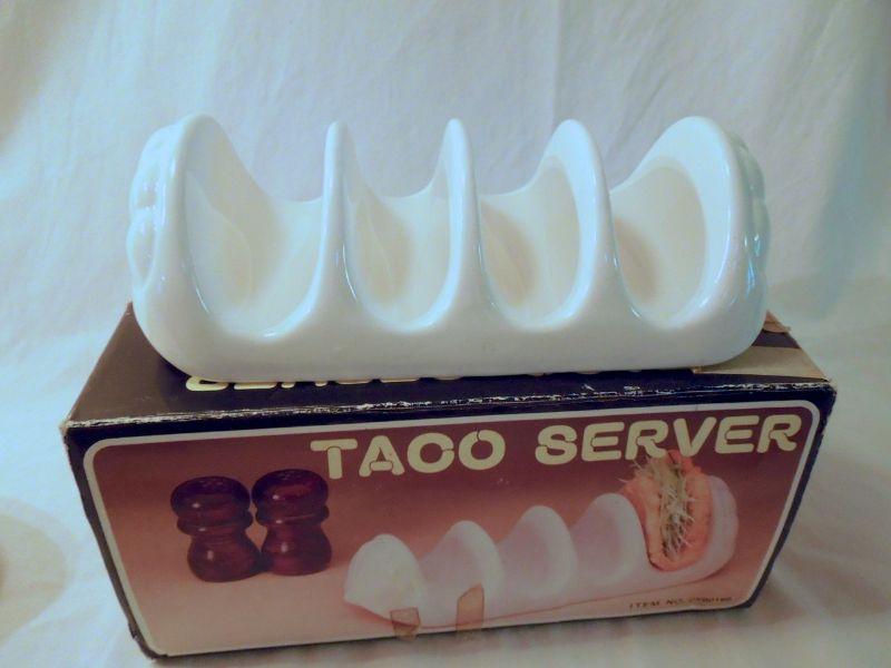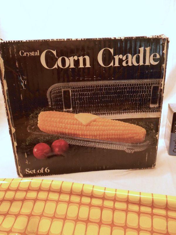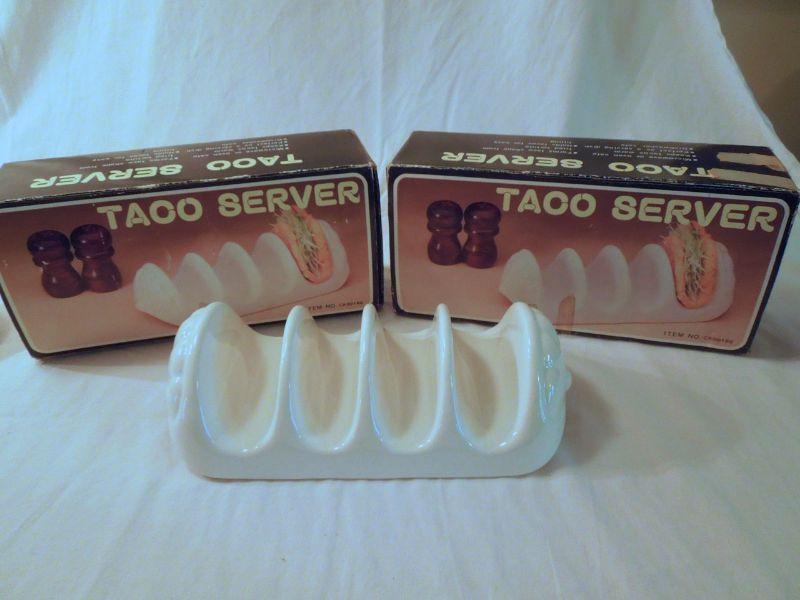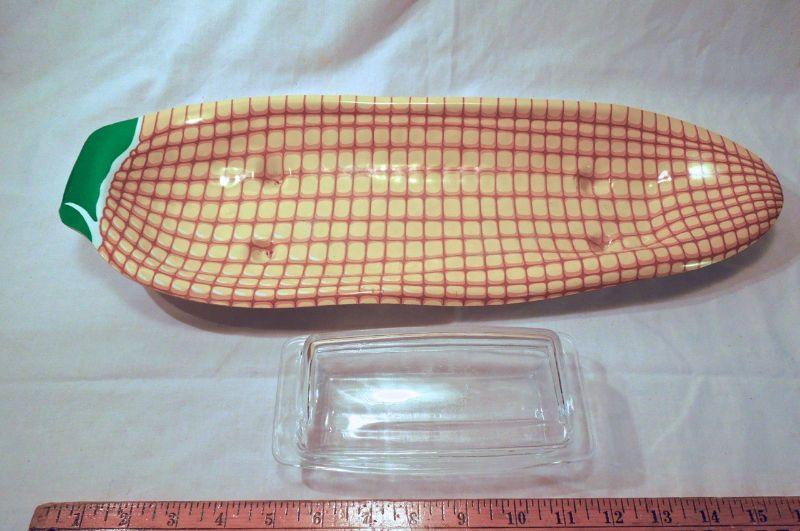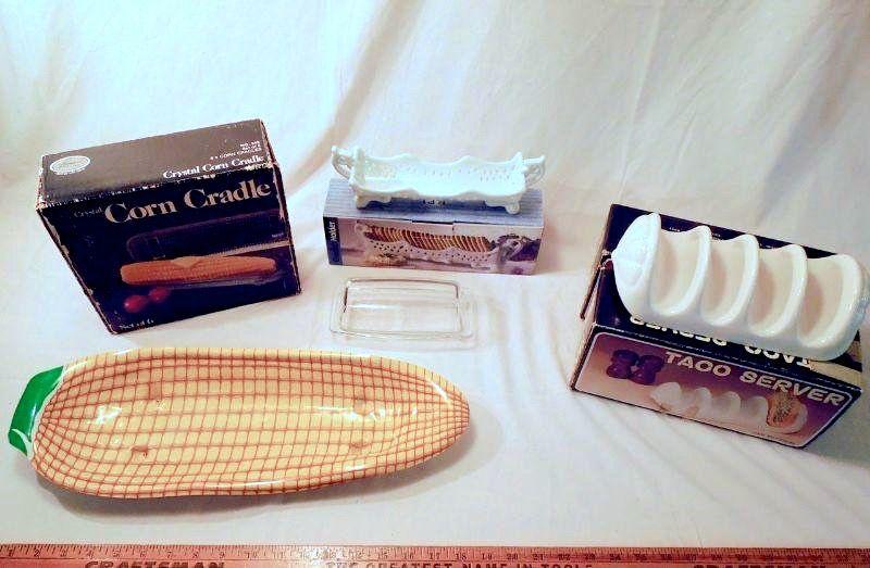 Boxed set of 6 clear glass corn trays; a white porcelain boxed crocker tray; a plastic corn serving tray; a covered glass butter dish; two ceramic taco servers in boxes and a multi colored Pier 1 square ceramic platter.
