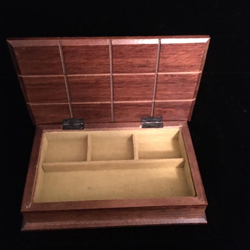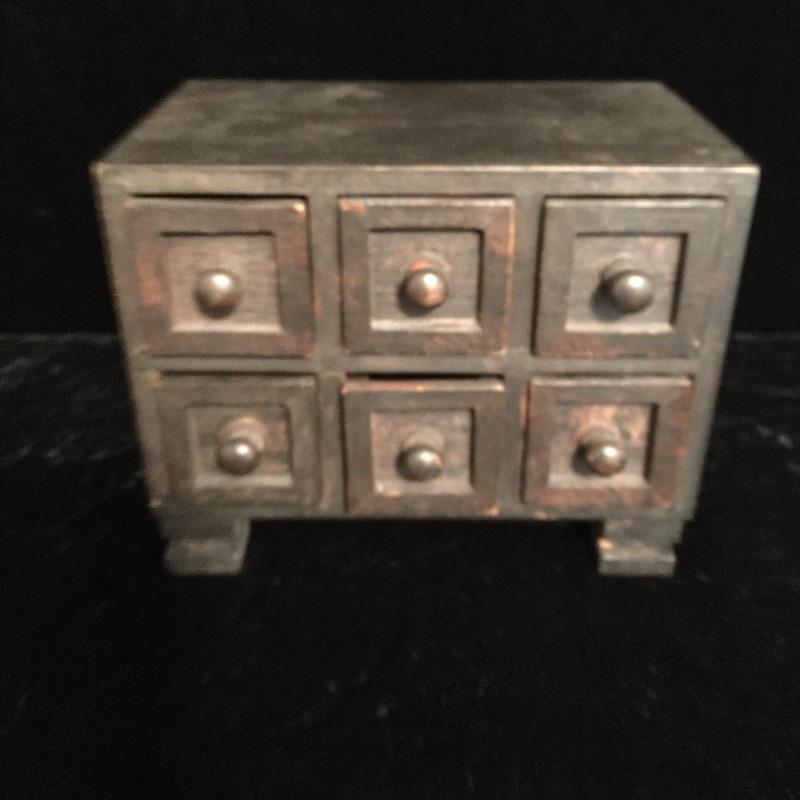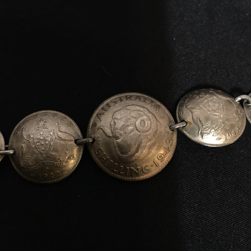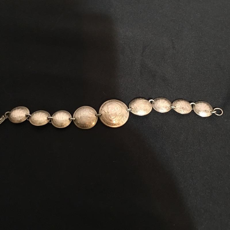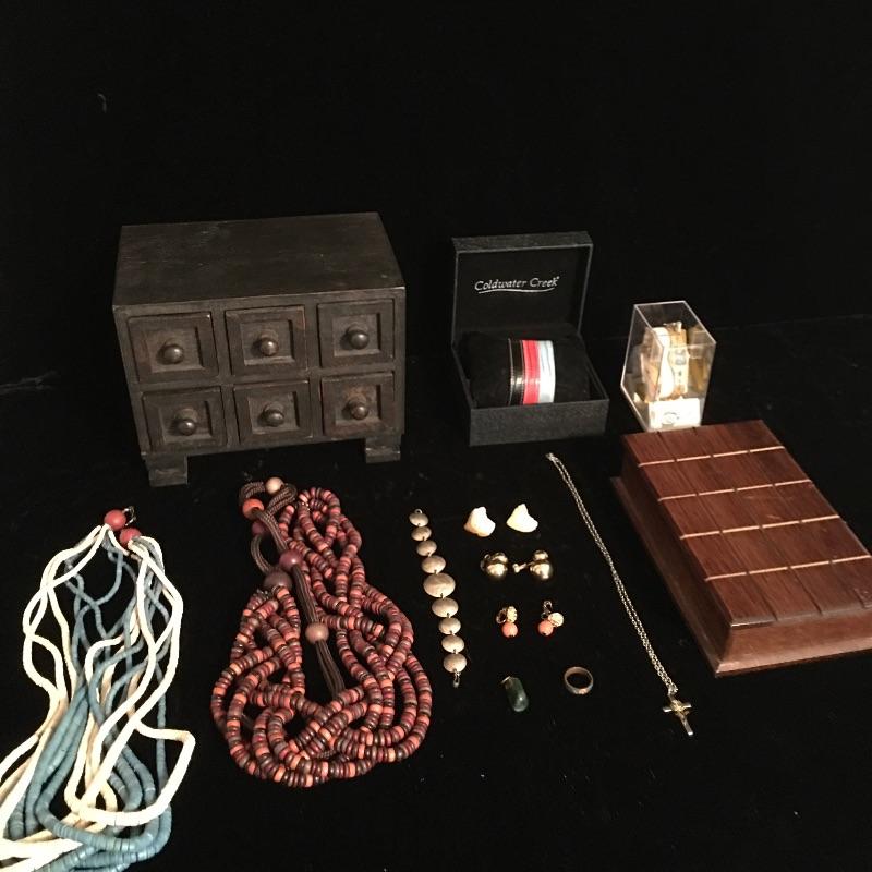 Ladies jewelry and jewelry boxes. Lot includes six drawer box, lidded box, Wittnauer watch, two tone necklace, wooden bead necklace, Australian coin bracelet made from what appears to be 1943 shillings and three pence coins, jade colored pendant, copper ring with enamel design (size 5), cross necklace and more. Watch could not be tested. Six drawer jewelry box measures 5.5” x 8” x 6.5”.