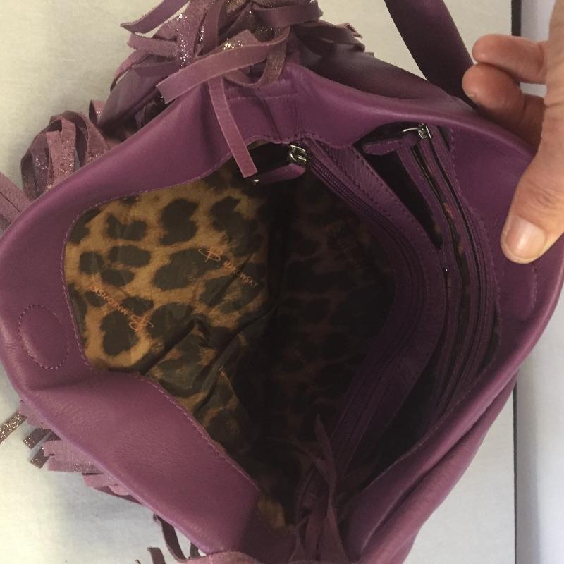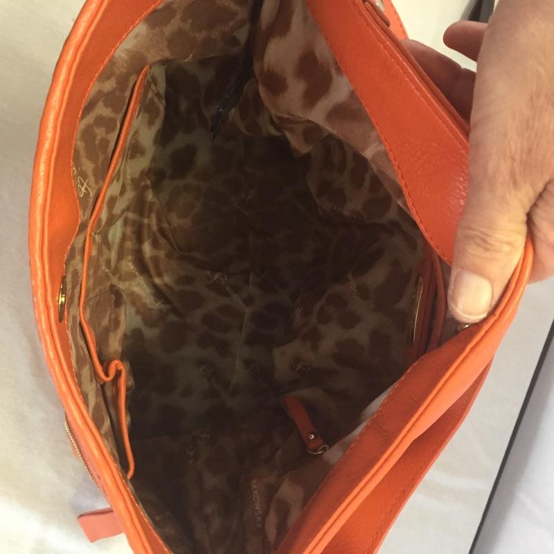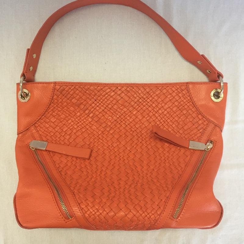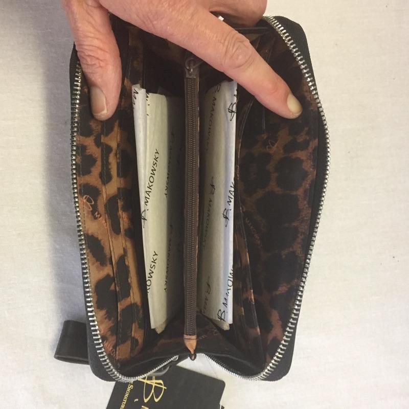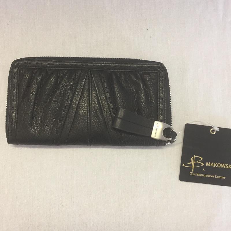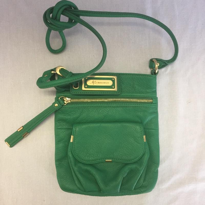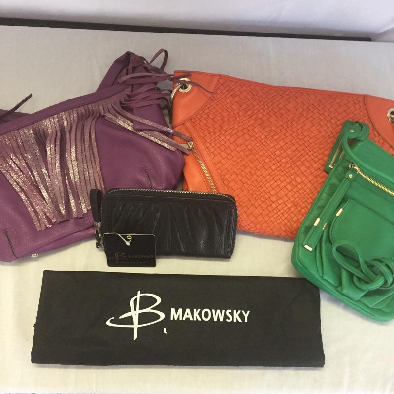 Signature of luxury with these three designer B. Makowsky purses and a large black wallet. Bold colors include orange, purple and green. All come with their original storage bags and all appear to be in extremely good condition.