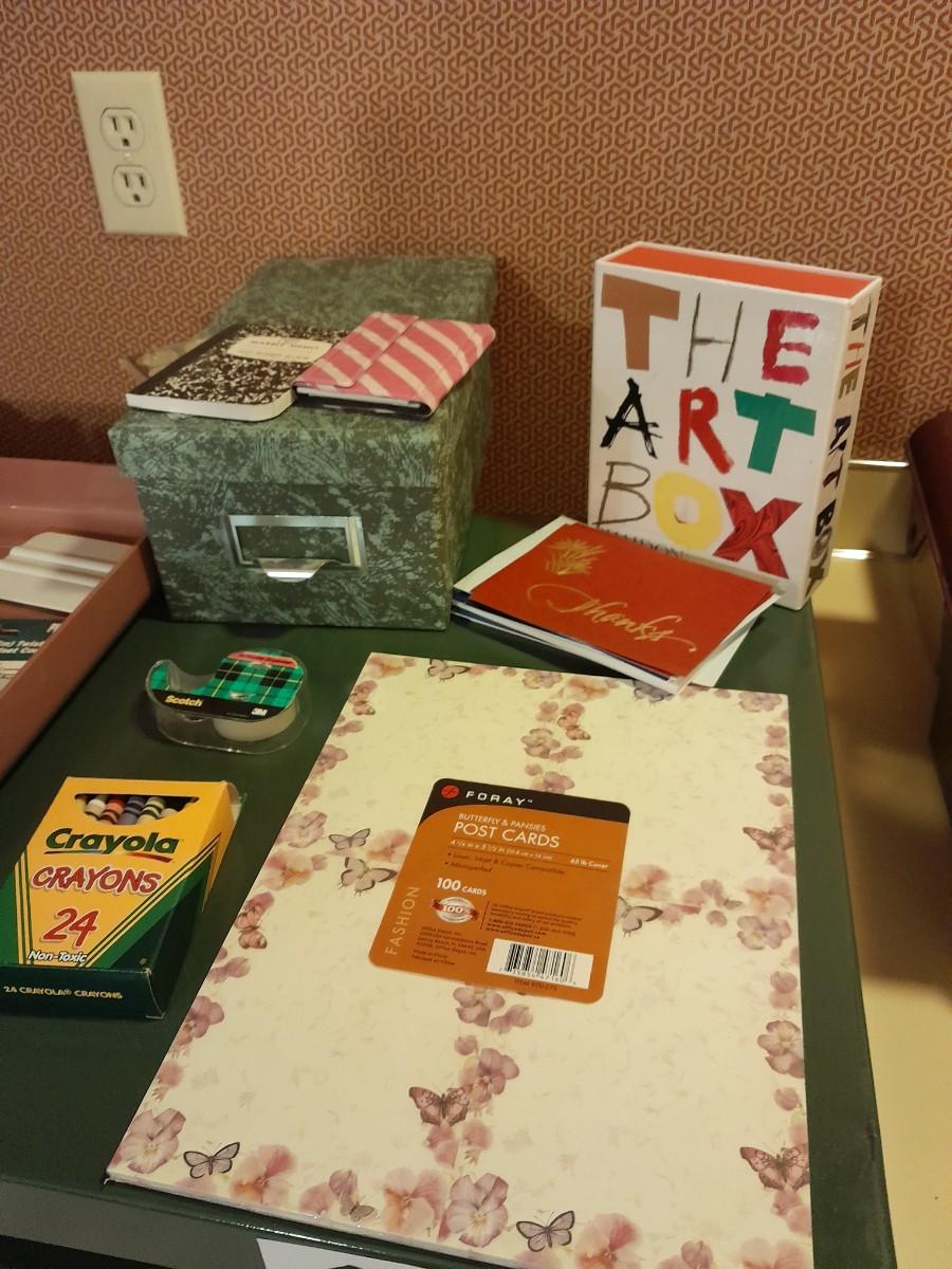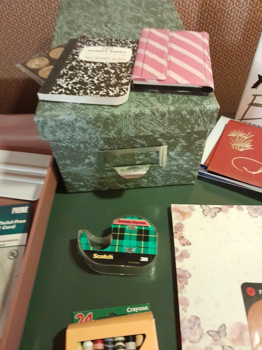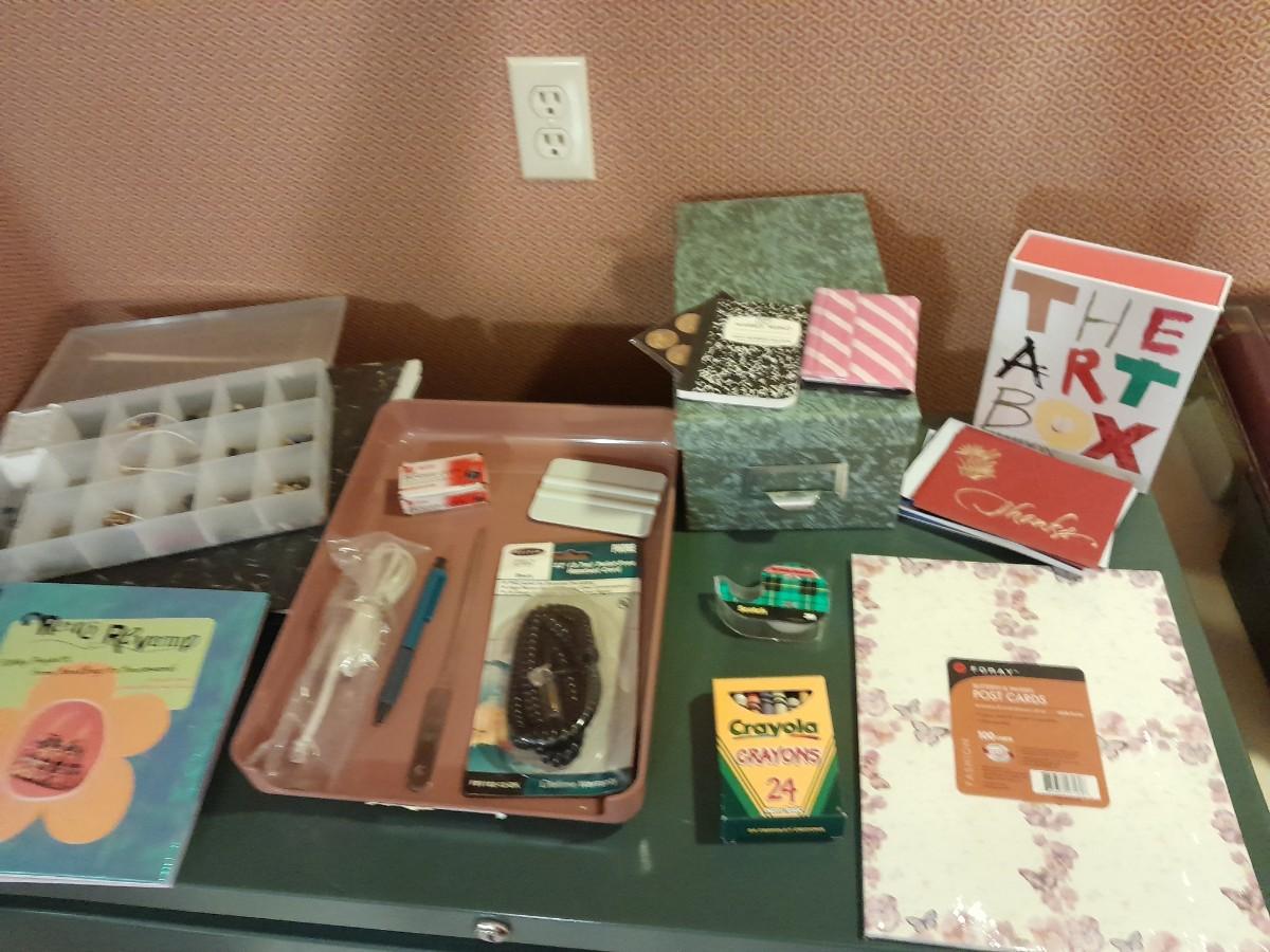 FILE BOX, TAPE, CARDS, CRAYONS, STATIONARY, ORGANIZING BOX WITH GEM BEADS, SCRAPBOOK, AND MORE