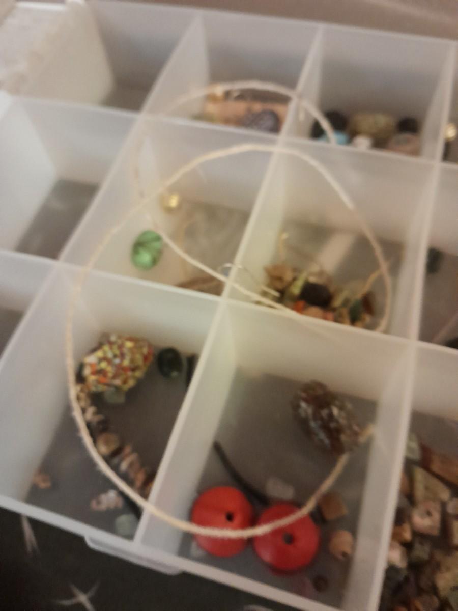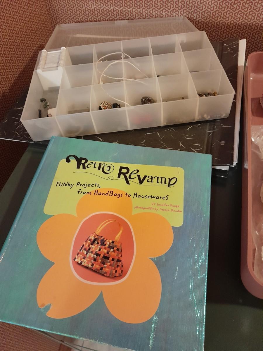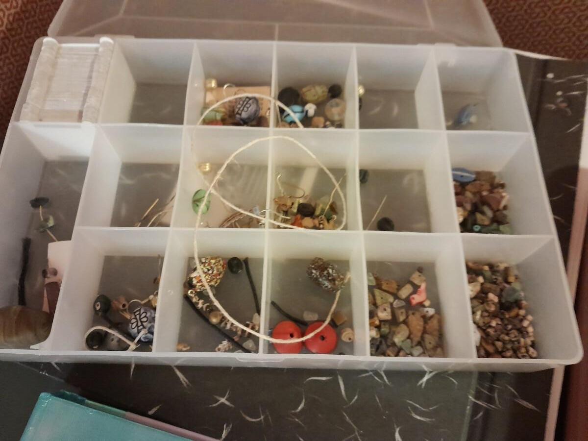 FILE BOX, TAPE, CARDS, CRAYONS, STATIONARY, ORGANIZING BOX WITH GEM BEADS, SCRAPBOOK, AND MORE