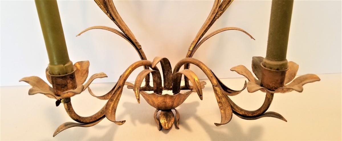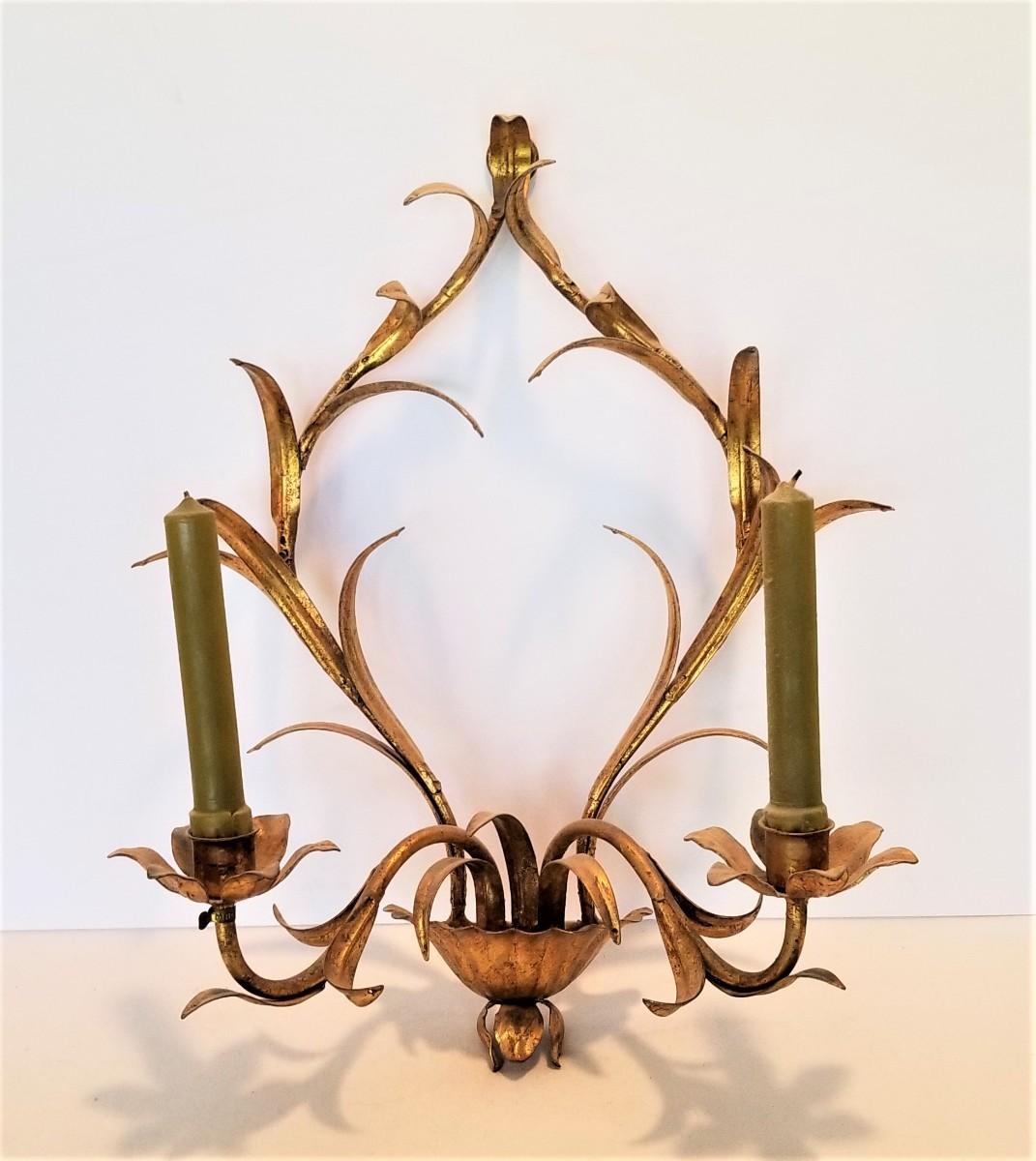 Only a single, but very pretty. Gilded look vintage candle wall sconce - 12" across, 16.5" tall - holds two tapers (as shown). Very good condition. Perfect for that wall space where you need "a little something."