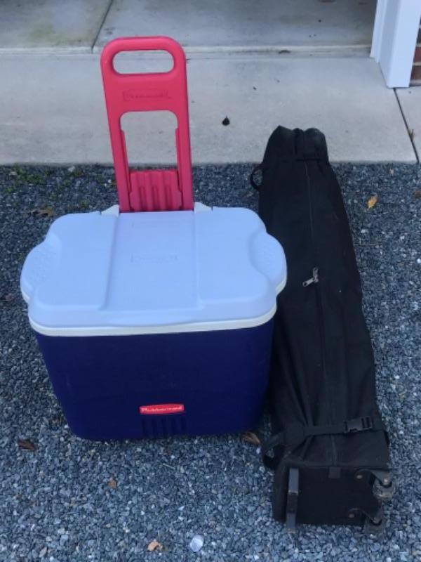 With carrying bag on wheels and Rubbermaid rolling cooler