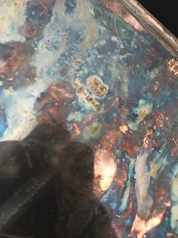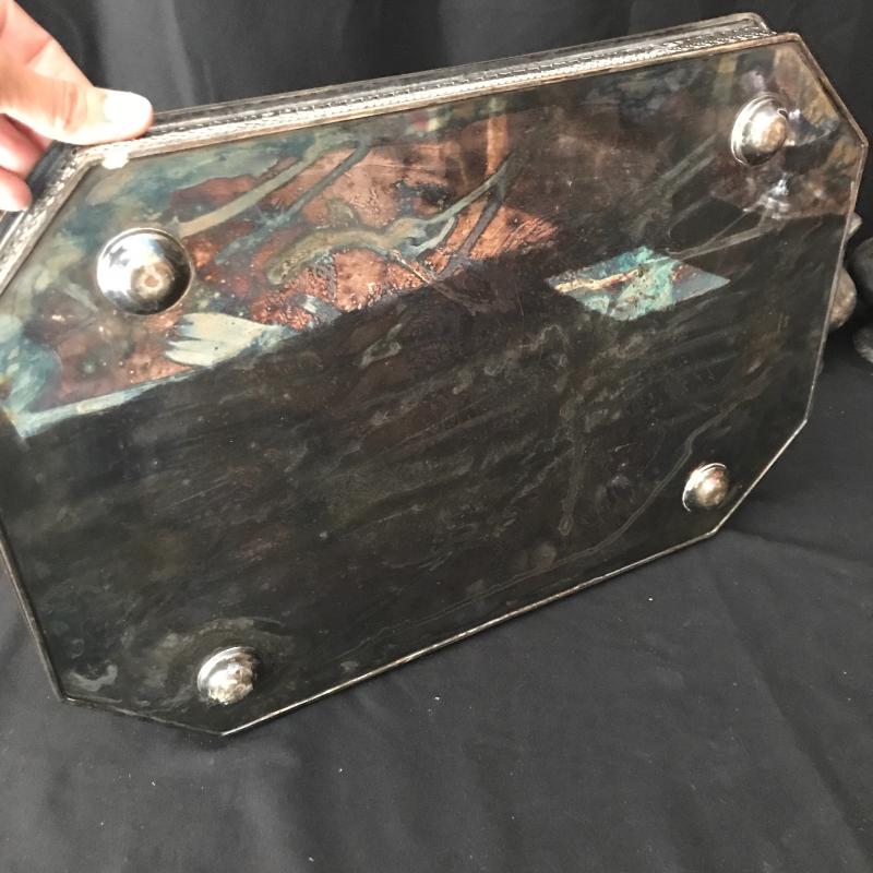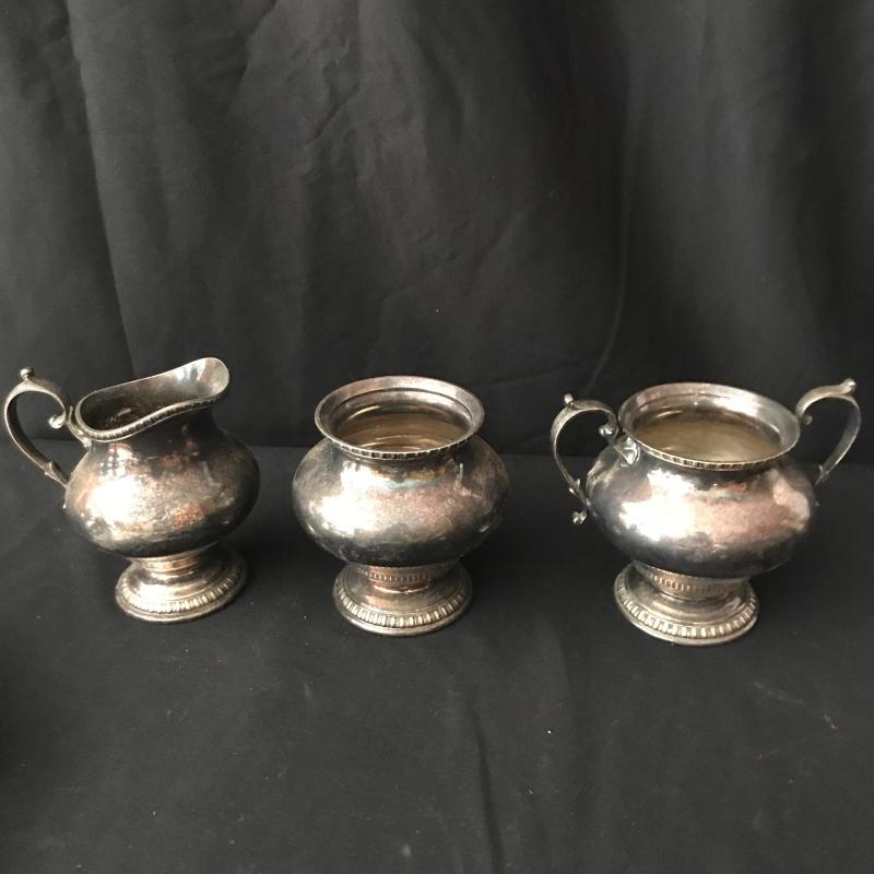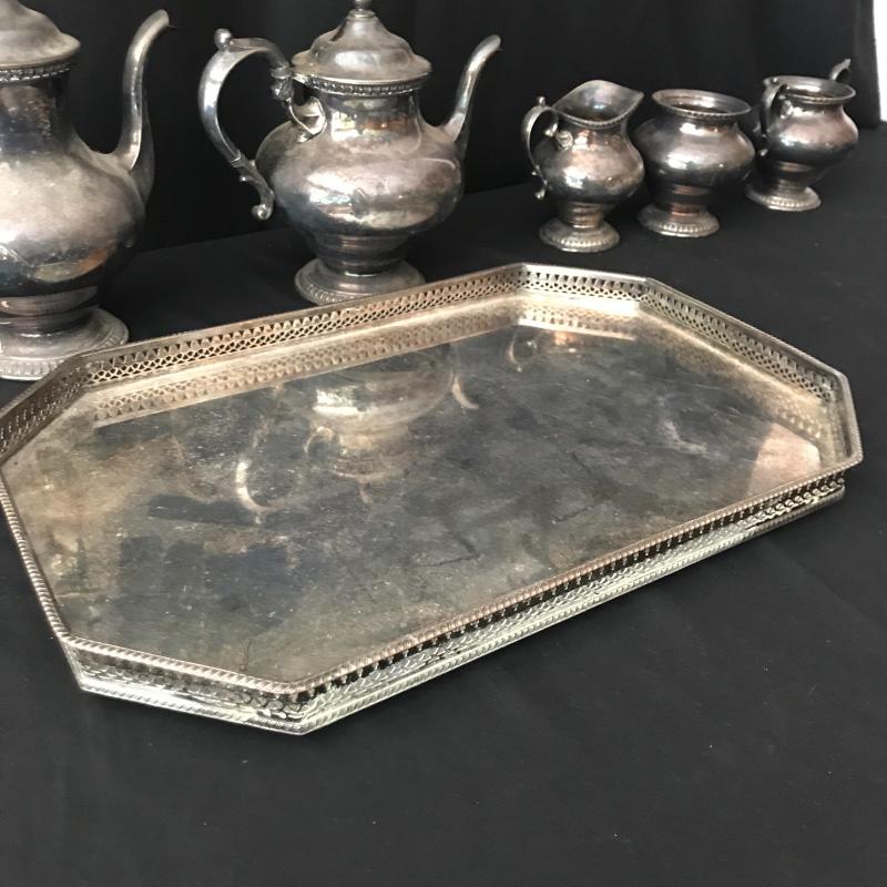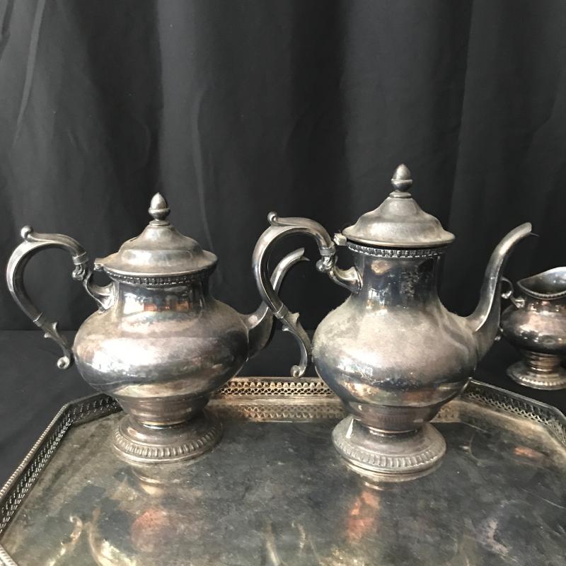 This Reed and Barton Silver tea set has two lidded pitchers and three containers for creamer and sugar. Also includes a nice silver tray made in England. With some polish this could be a beautiful set. Tallest pitcher is 10” high. Tray is 18” x 12.5” Shipping available.