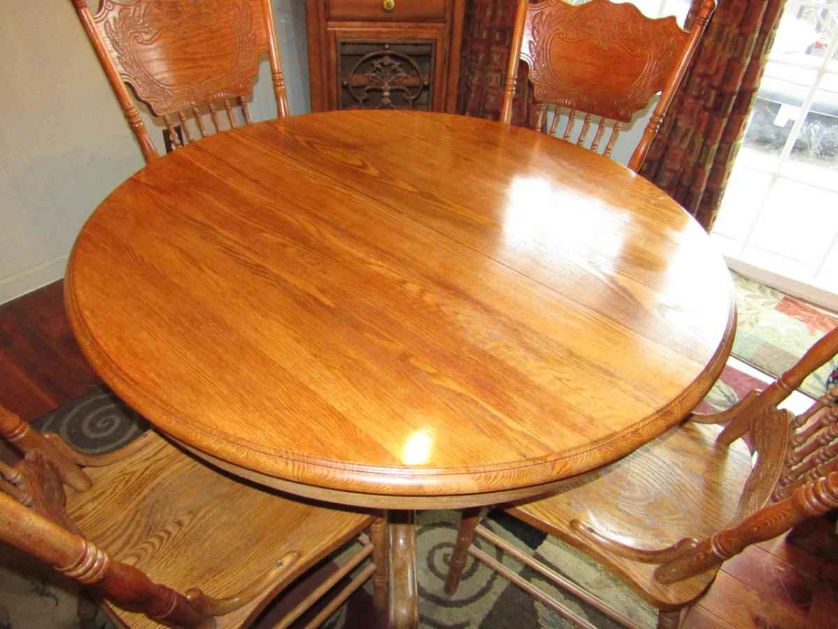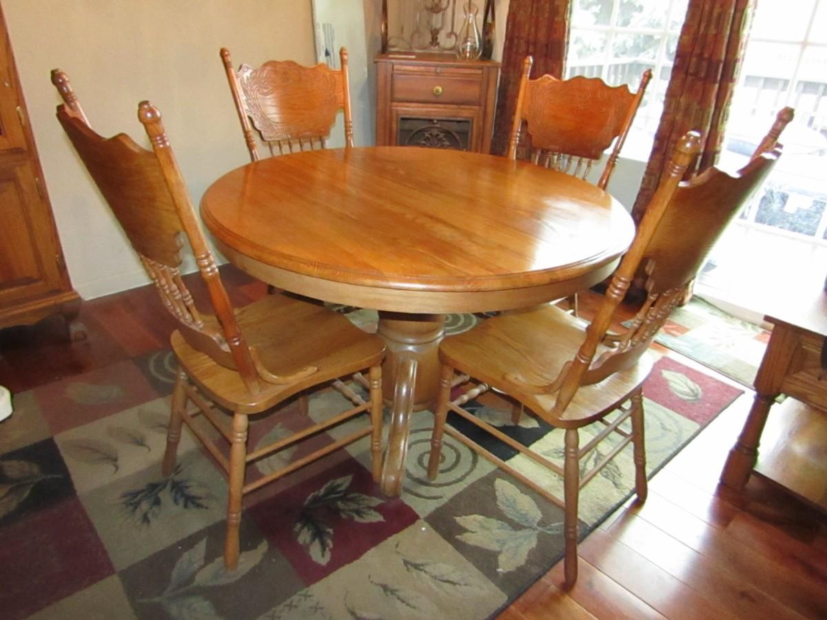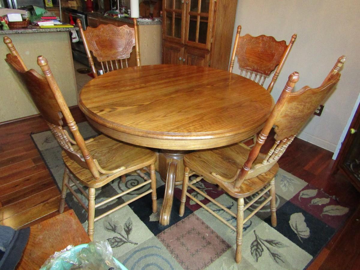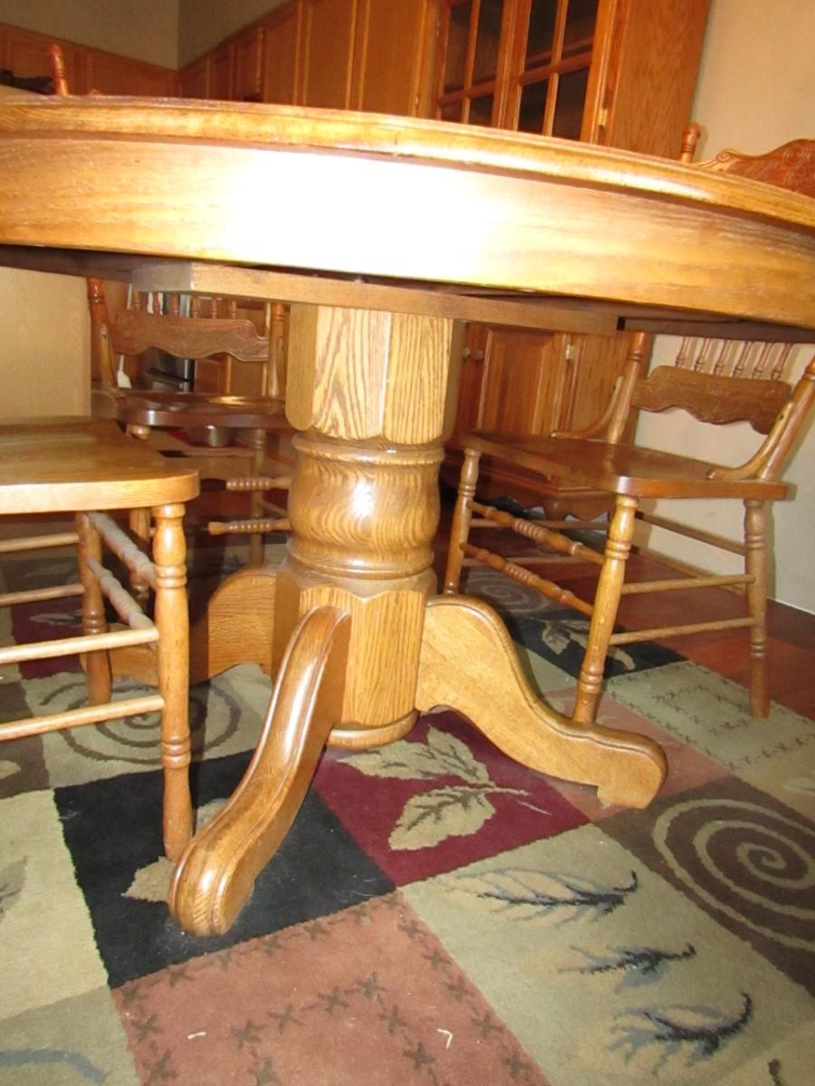 LOT 161 ROUND WOOD PEDESTAL TABLE WITH 4 CHAIRS AND 2 LEAVES
