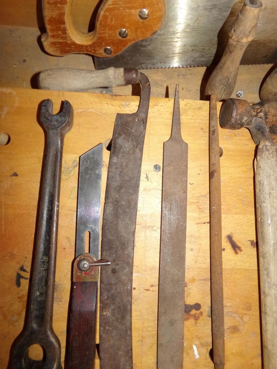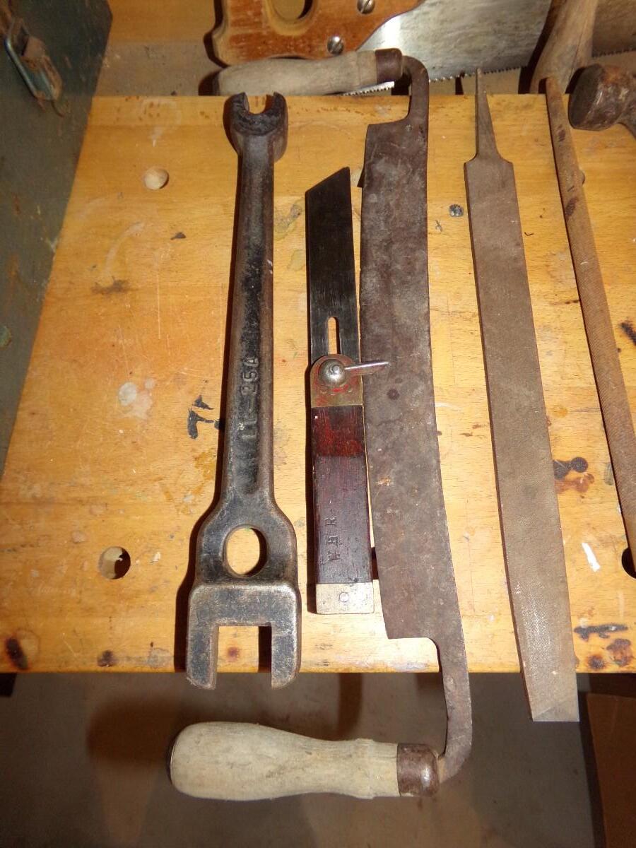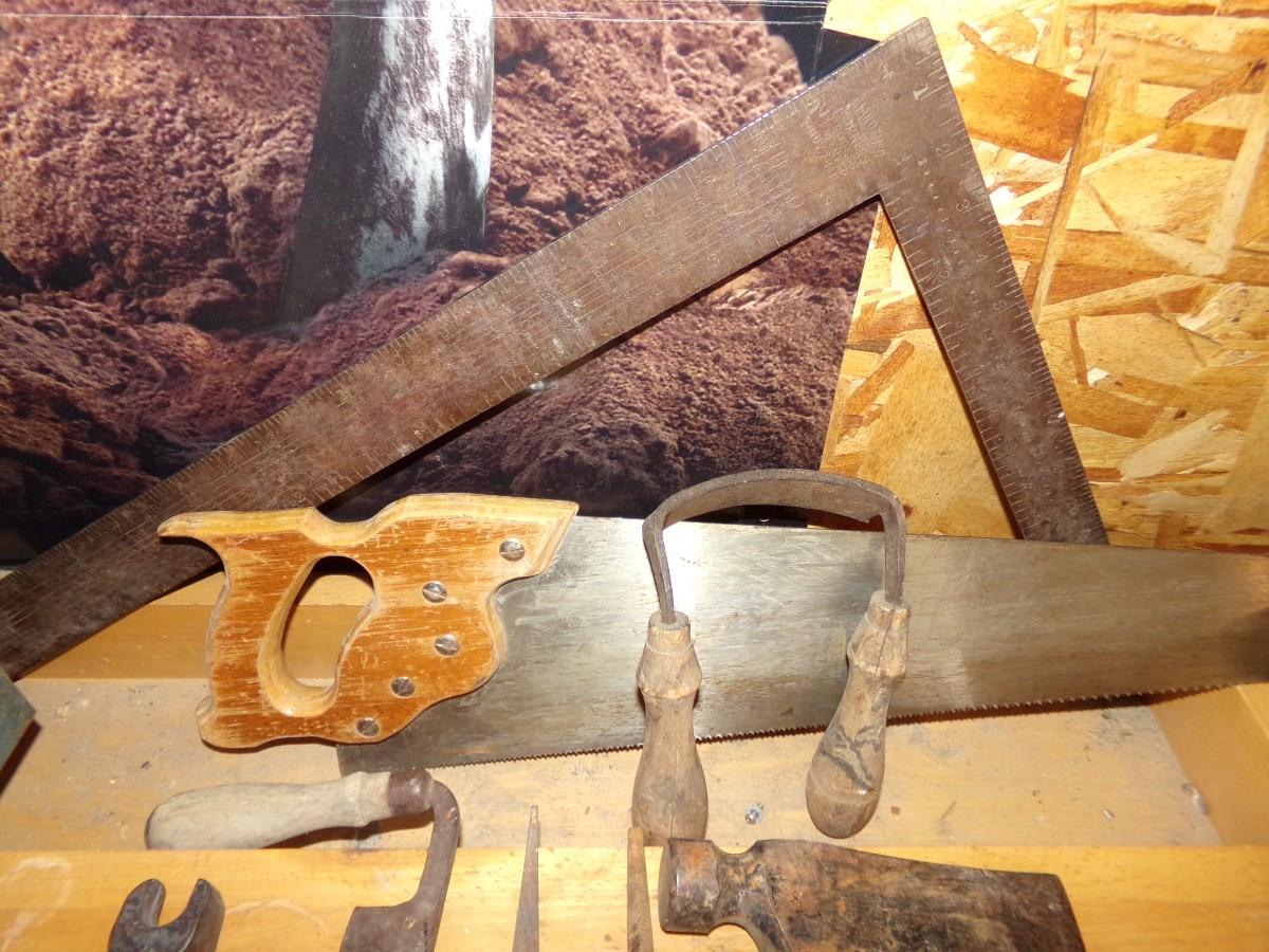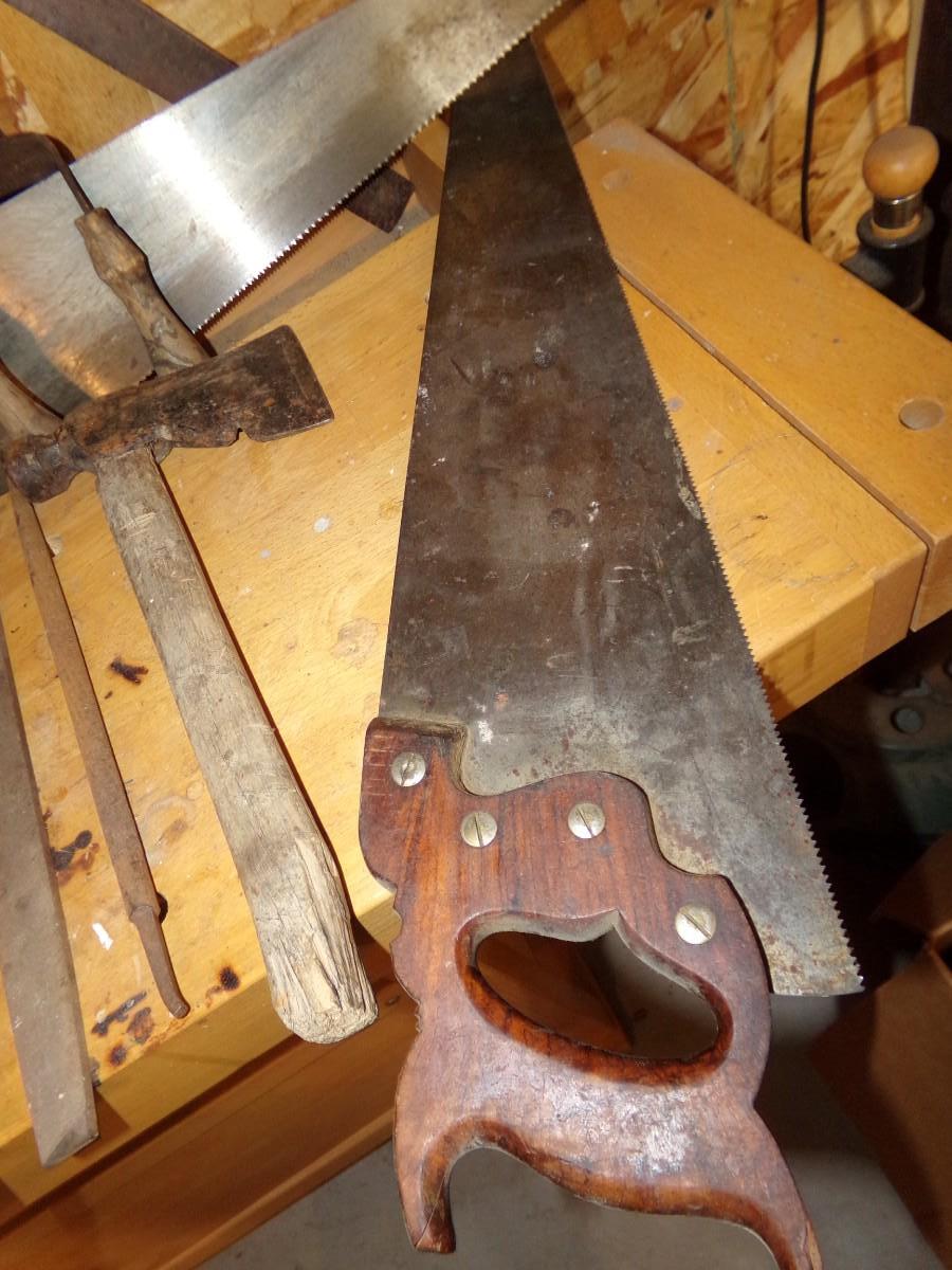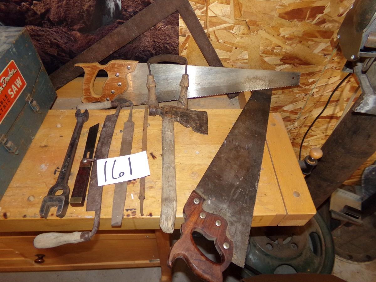 2 LARGE HAND SAWS, HATCHET, WOOD SHAVERS AND MORE.